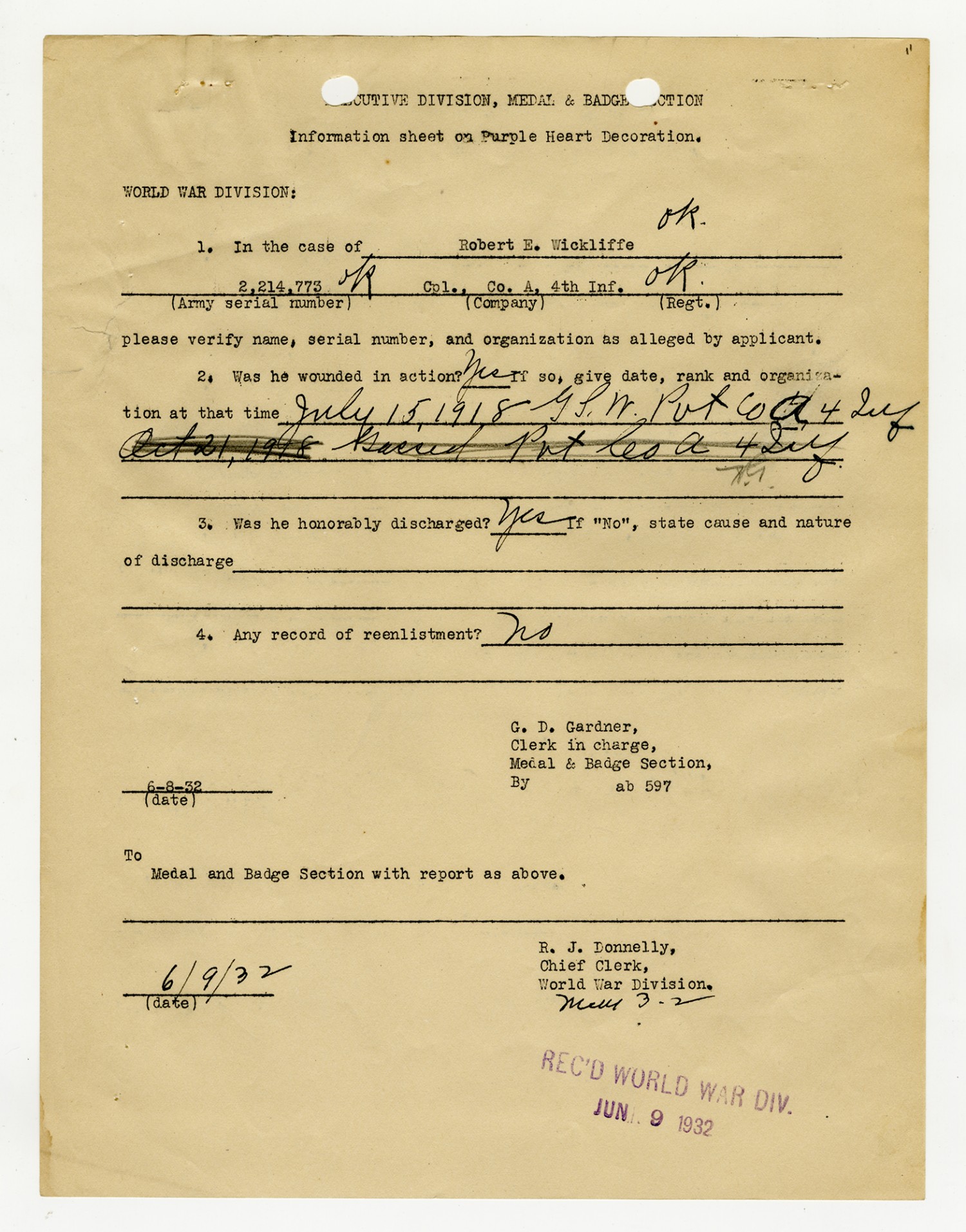 | Description | <p>Military personnel record files for Corporal Robert Elmer Wickliffe containing correspondence concerning his purple heart and distinguished service cross medals as well as service records and medical records. Wickliffe served with Company A, 4th Infantry, 3rd Division. He was wounded July 26, 1918 near Grand Ballois Farm, France. For his gallantry in action he was awarded the Distinguished Service Cross and Purple Heart. </p> |