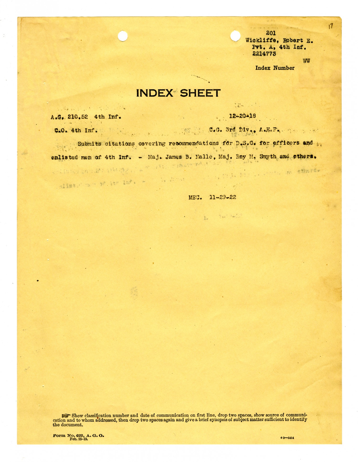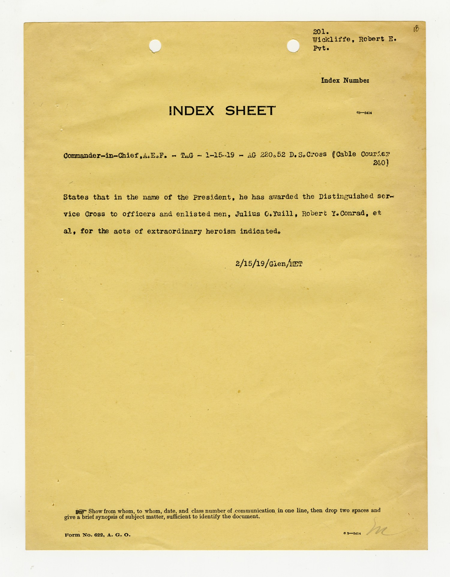 Robert E. Wickliffe Distinguished Service Cross Data Sheet - February 5, 1928