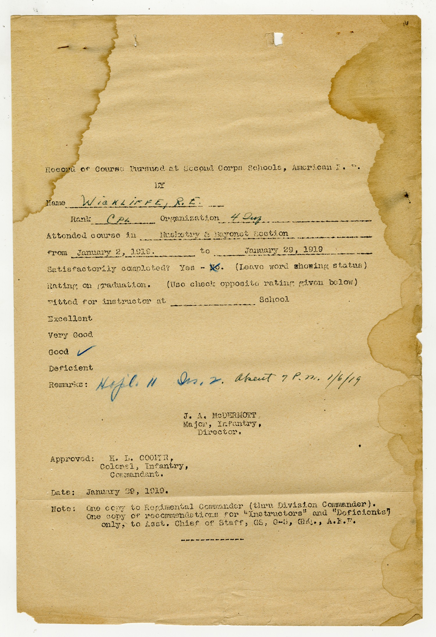 Robert E. Wickliffe Record of Course - January 29, 1919