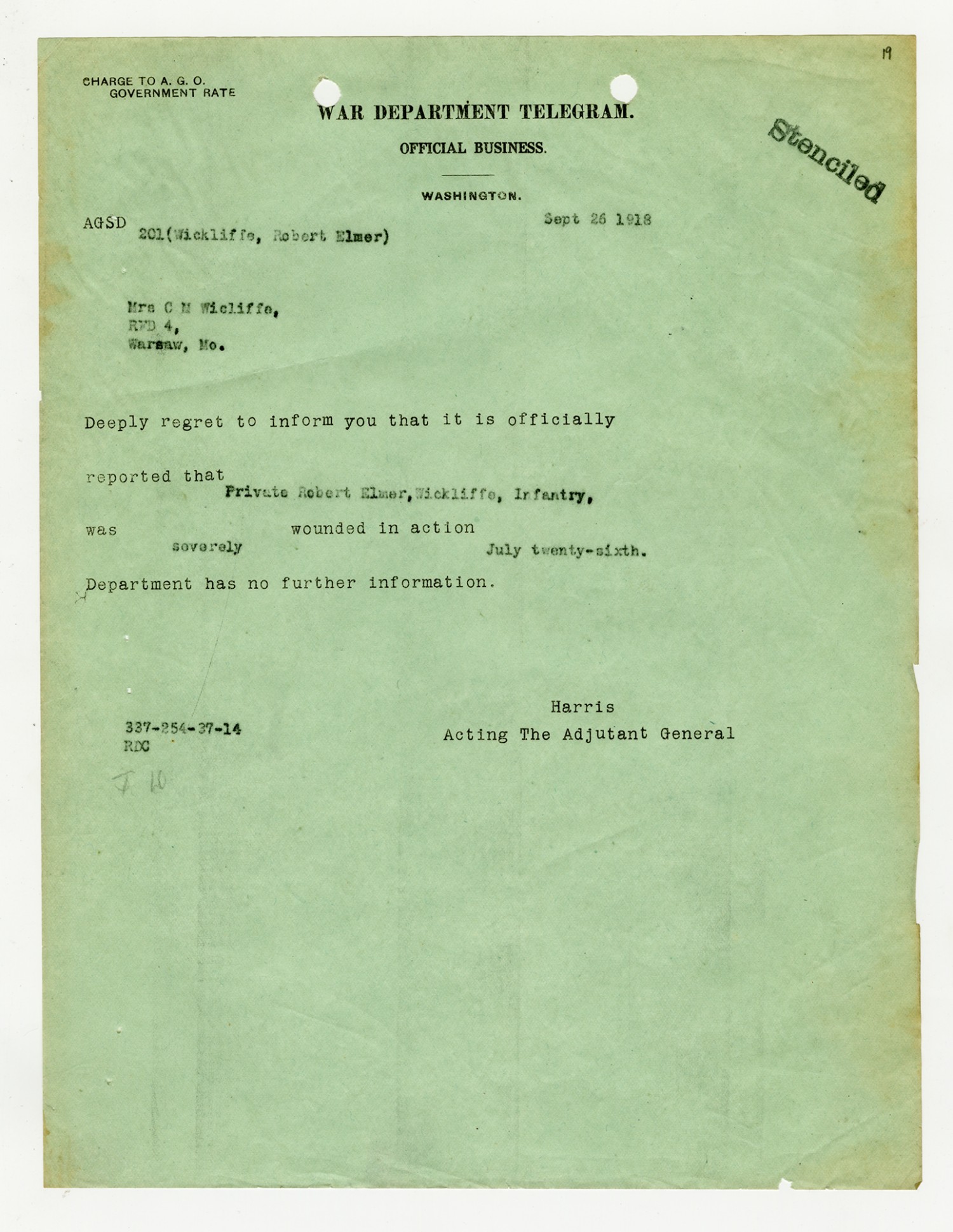 Adjutant General letter to Mrs. C.N. Wickliffe - September 26, 1918