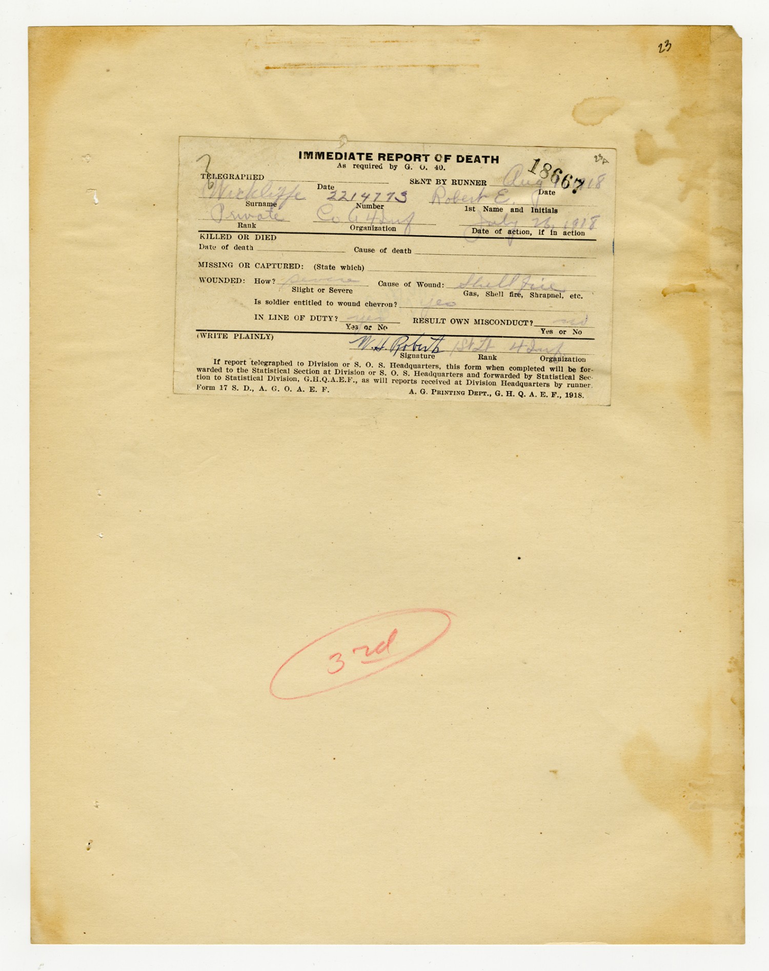 Robert E. Wickliffe Wounded Slip - July 26, 1918