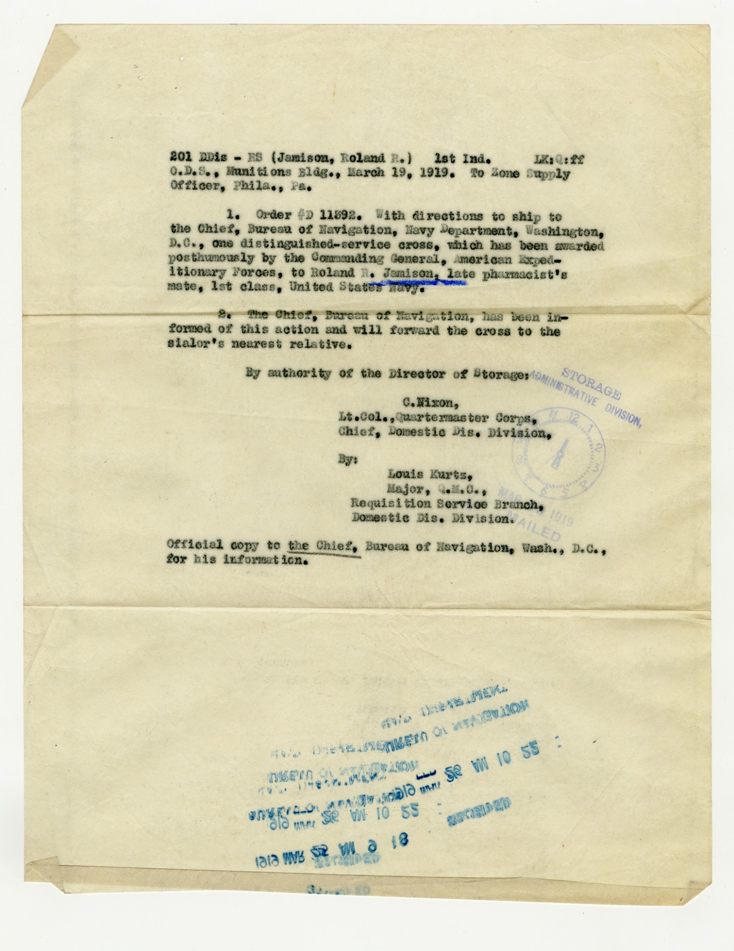 C. Nixon letter to the Zone Supply Officer - March 19, 1919