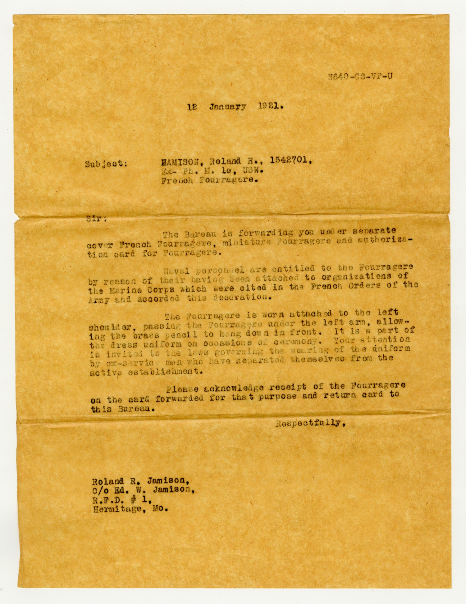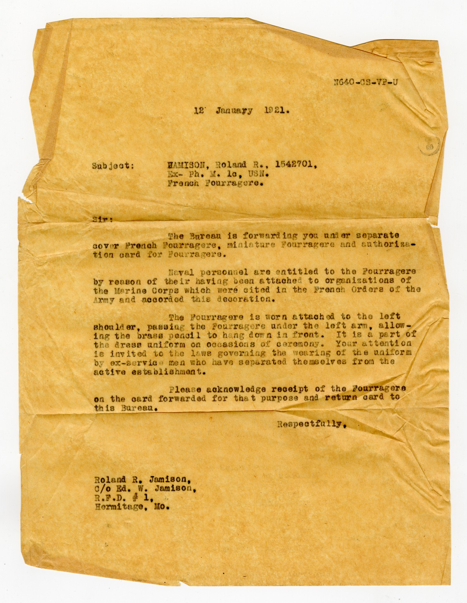 Letter to Roland Jamison - January 12, 1921