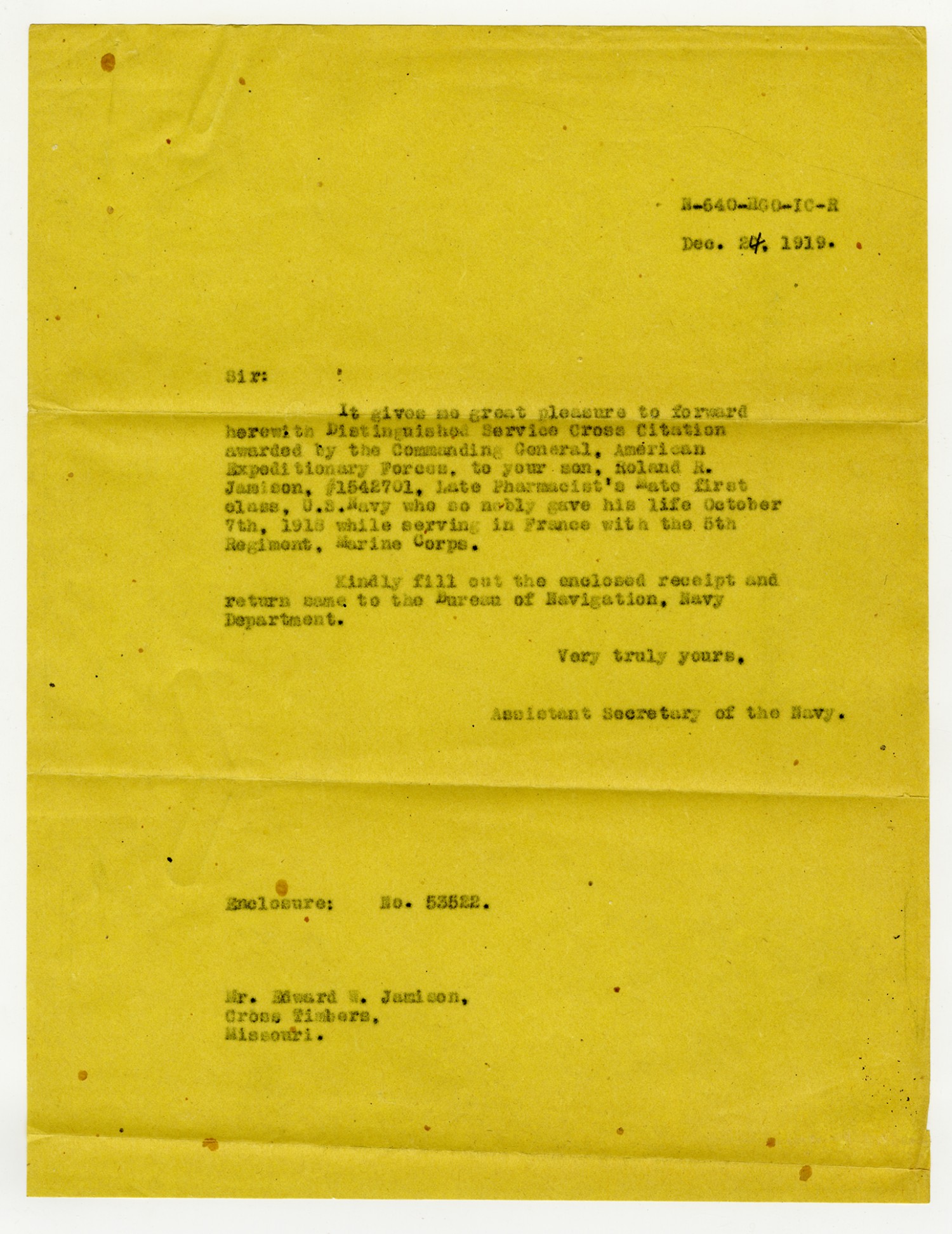 Assistant Secretary of the Navy letter to Edward W. Jamison - December 24, 1919