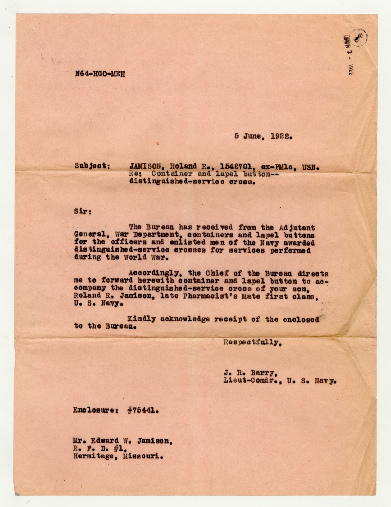 J.R. Barry Letter to Edward W. Jamison - June 5, 1922