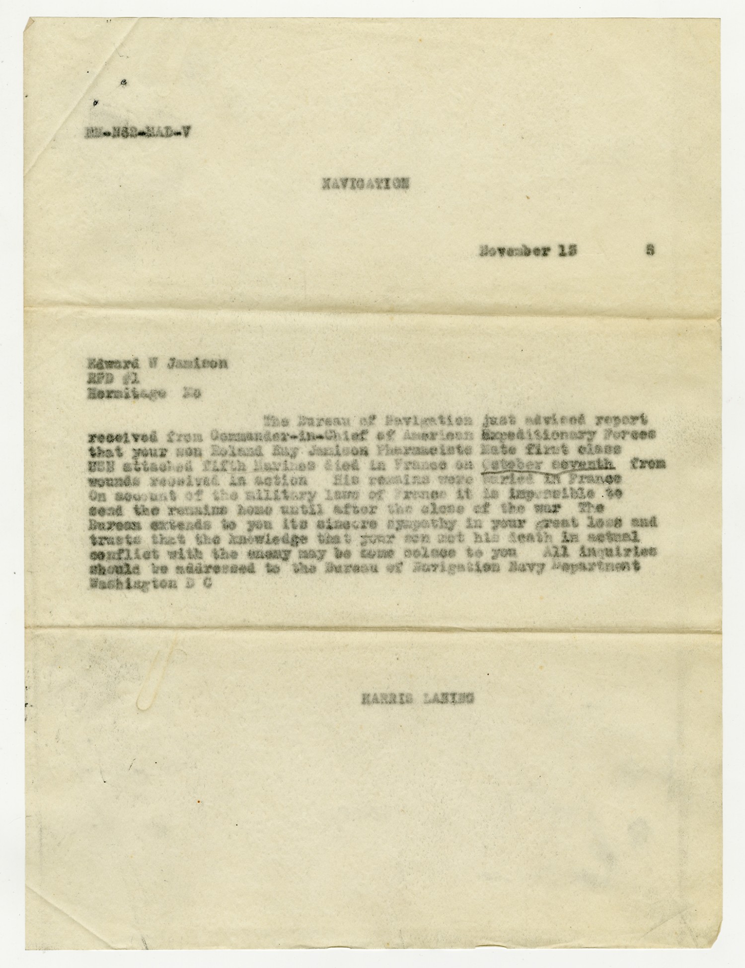 Harris Laning letter to Edward W. Jamison - November 15, 1918