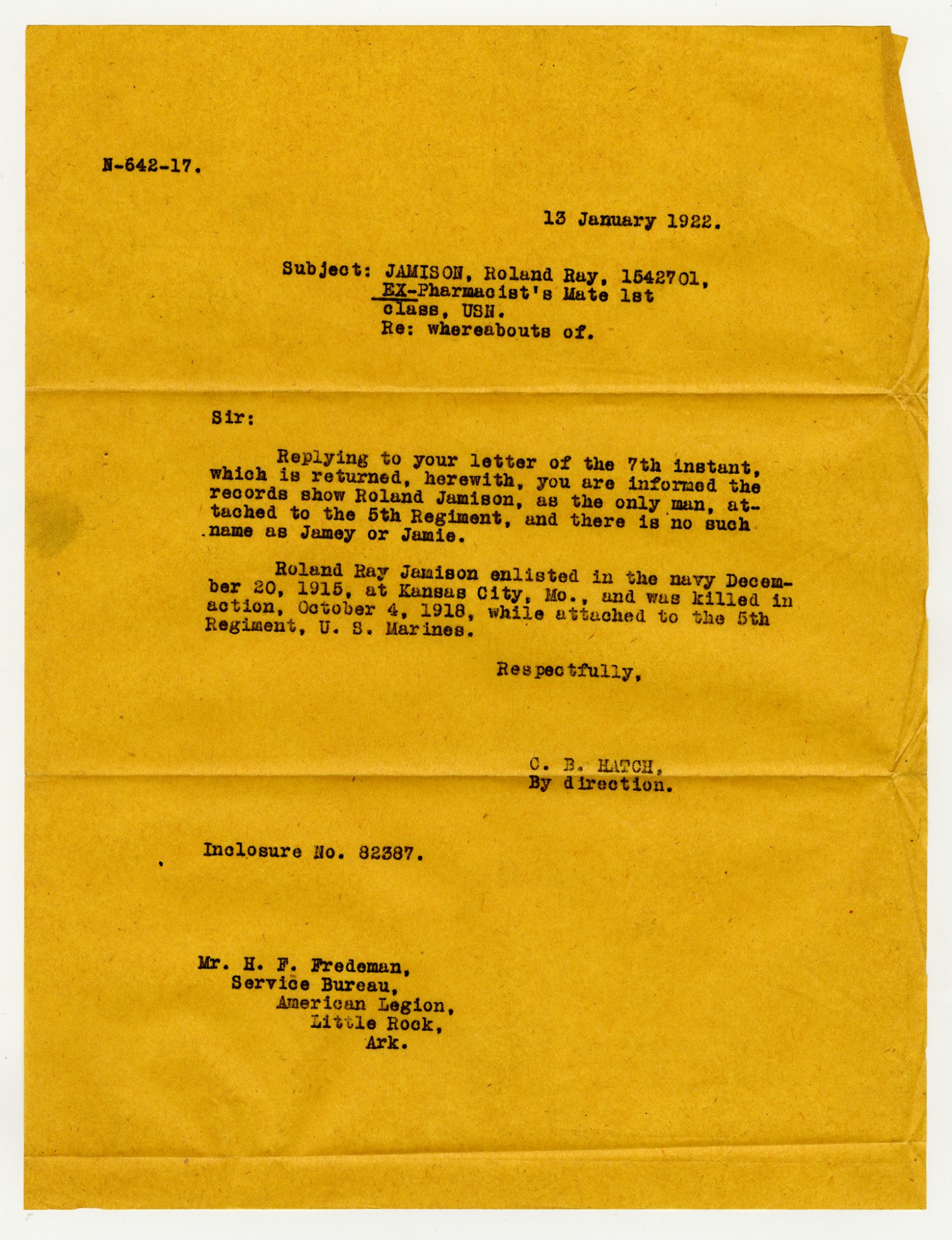 C.B. Hatch letter to H.F. Fredeman - January 13, 1922