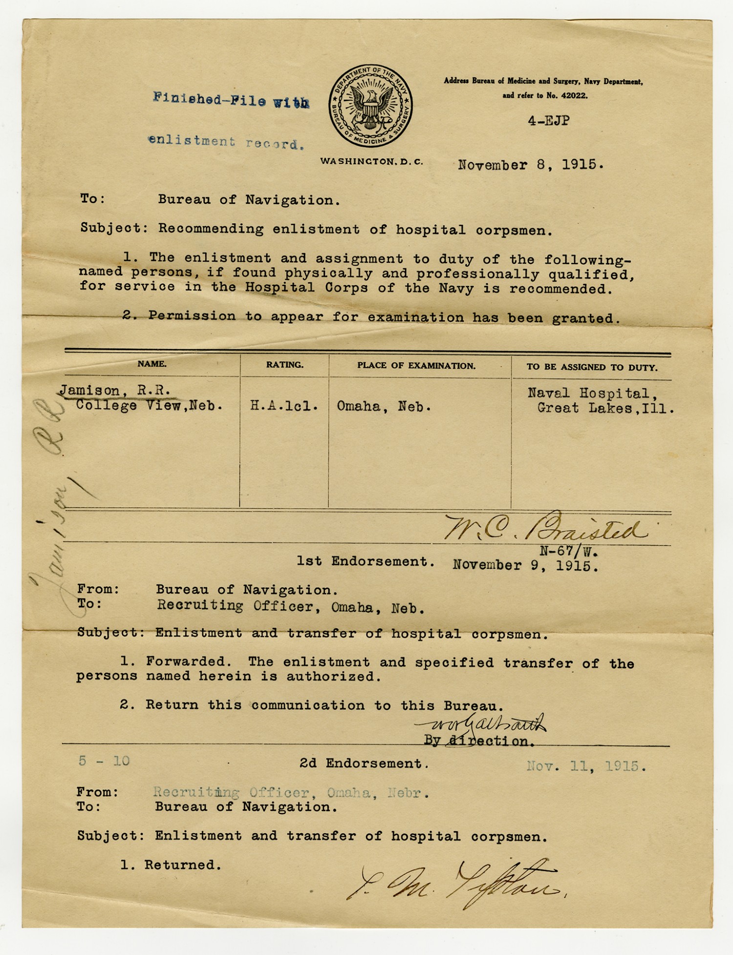 Letter to the Bureau of Navigation - November 8, 1915