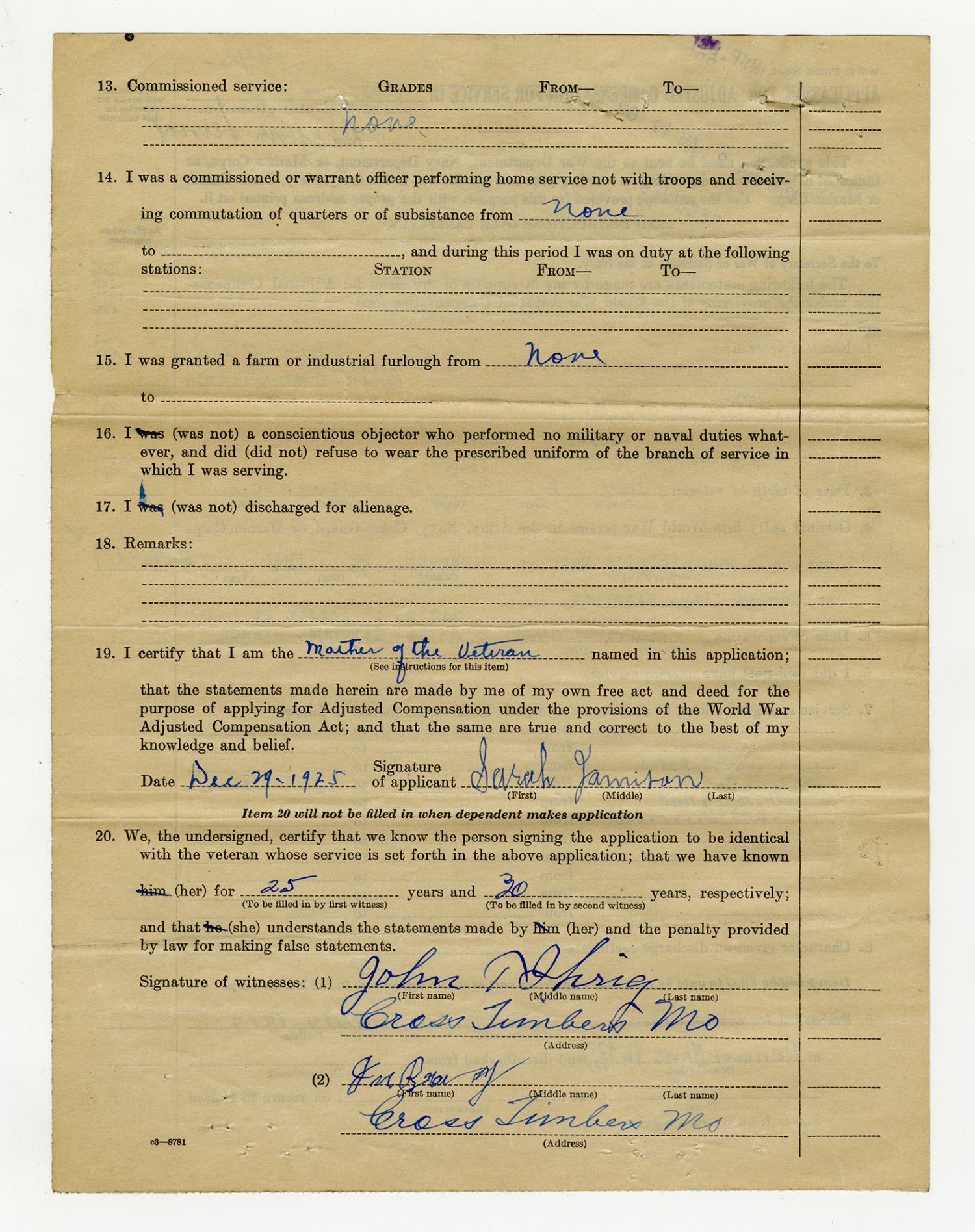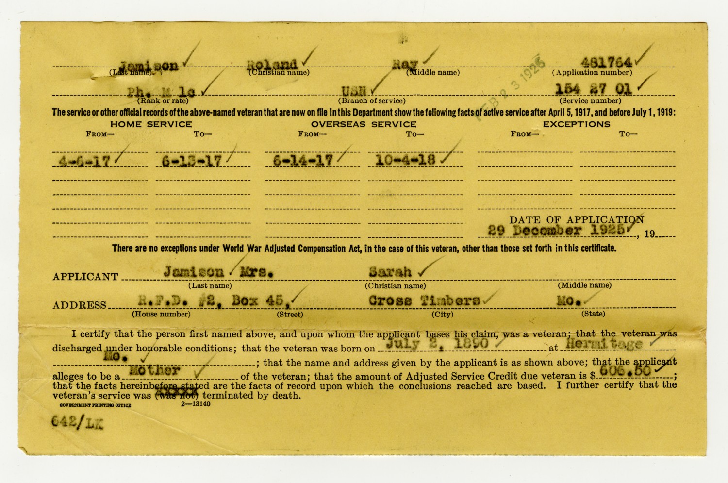 Veteran Compensation Form - December 29, 1925