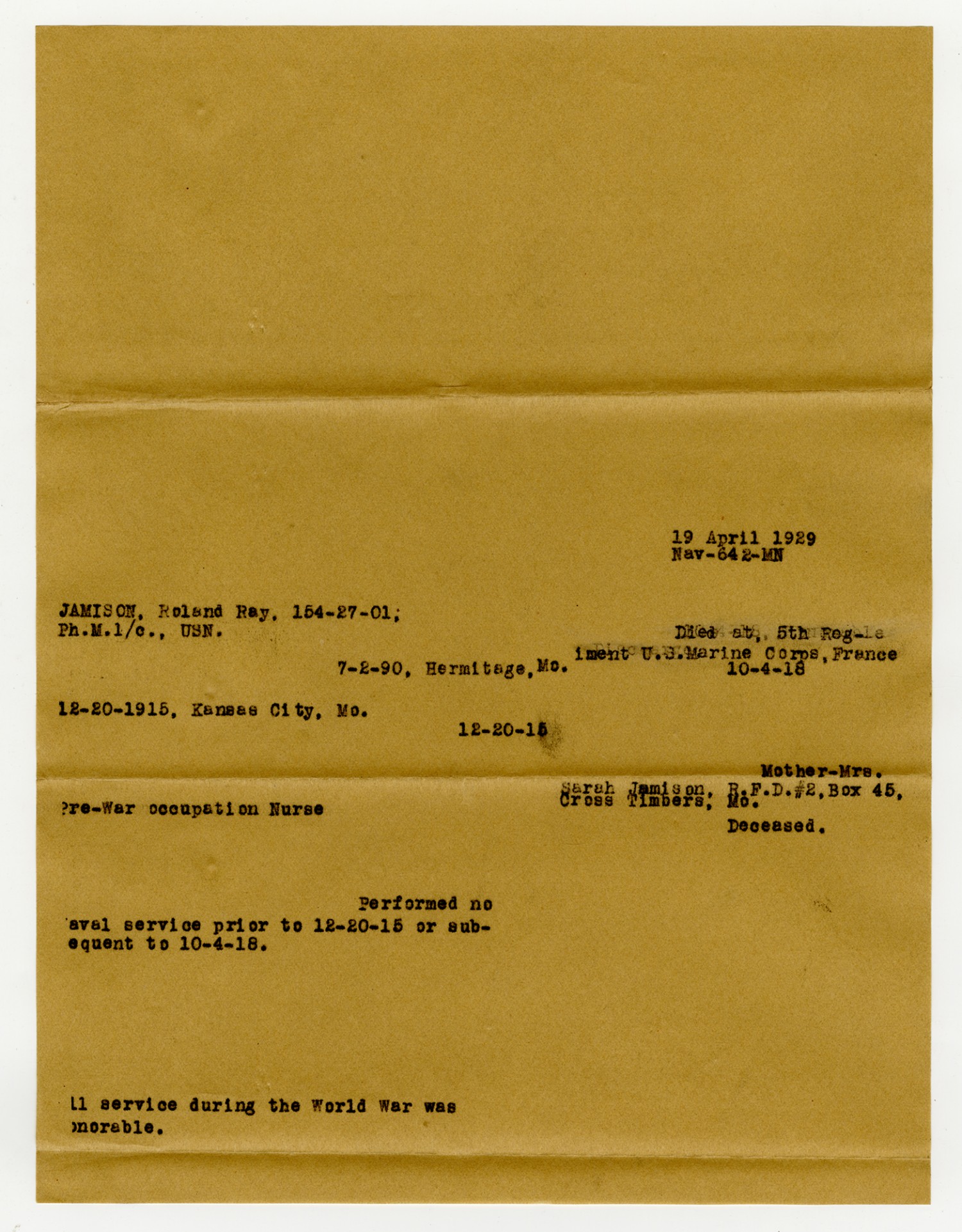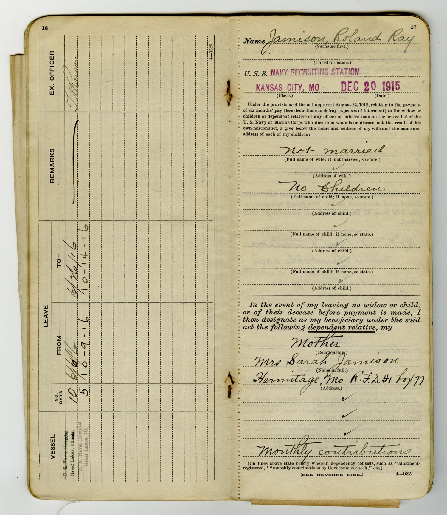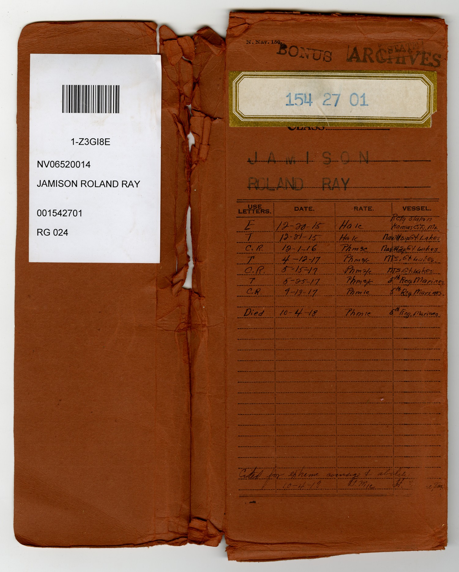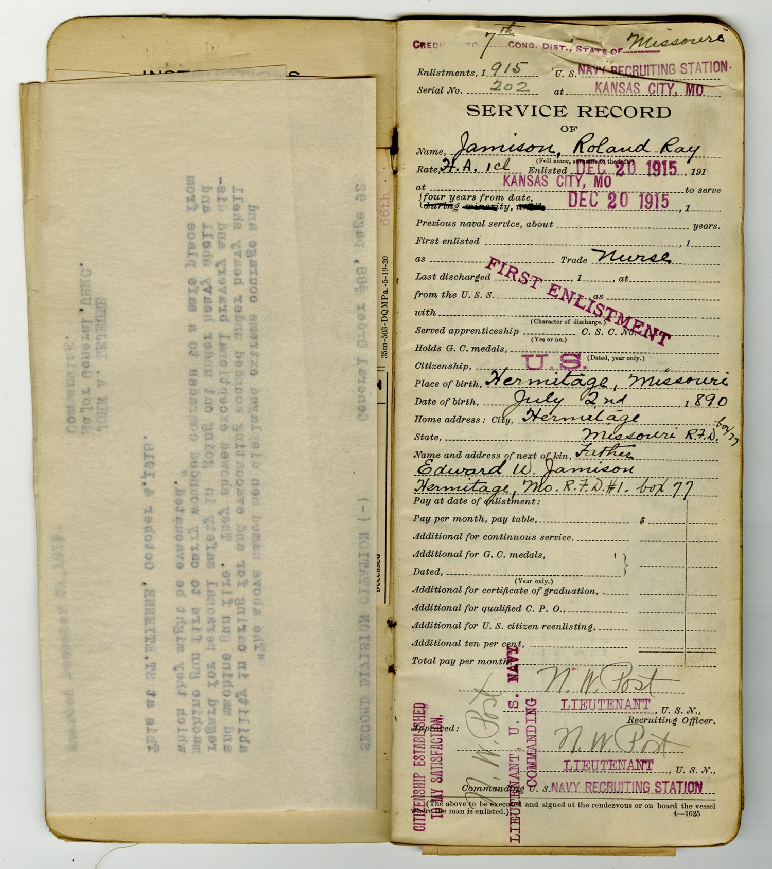 Roland R. Jamison Service Record - December 20, 1915
