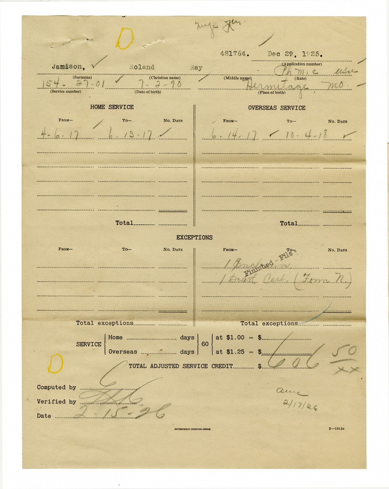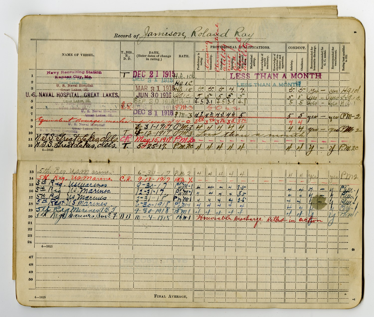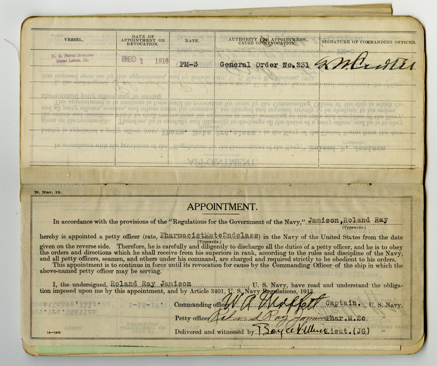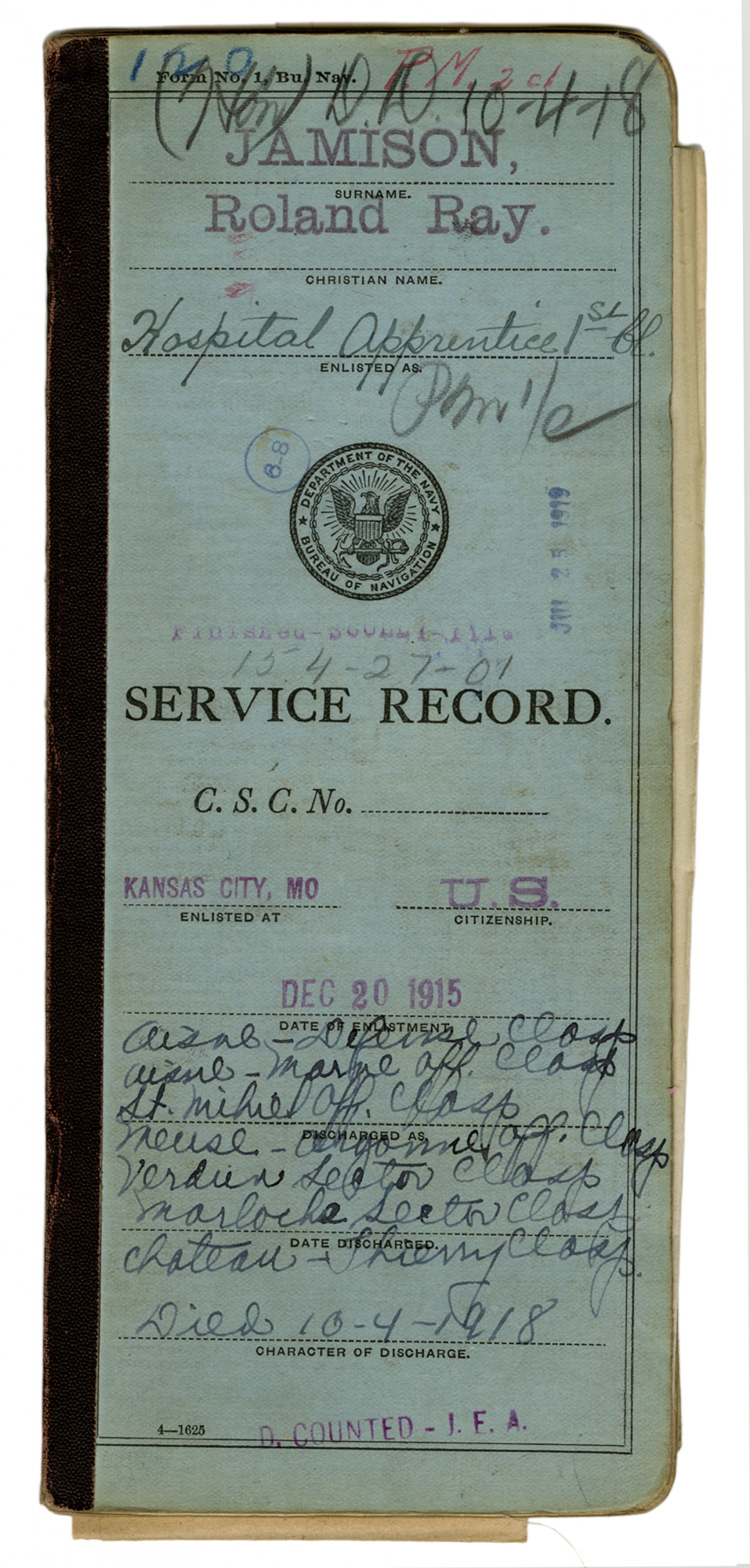 Roland R. Jamison Service Record - December 20, 1915