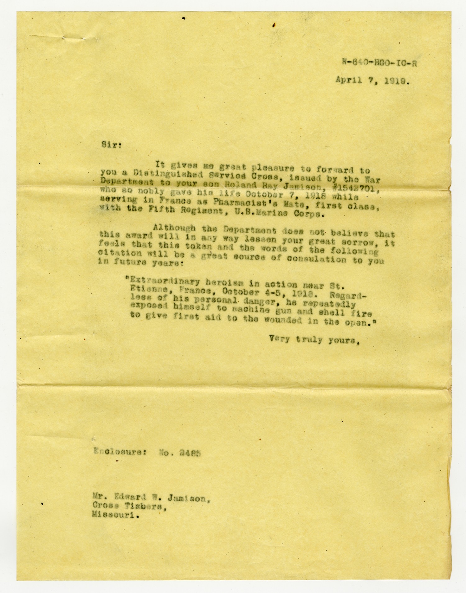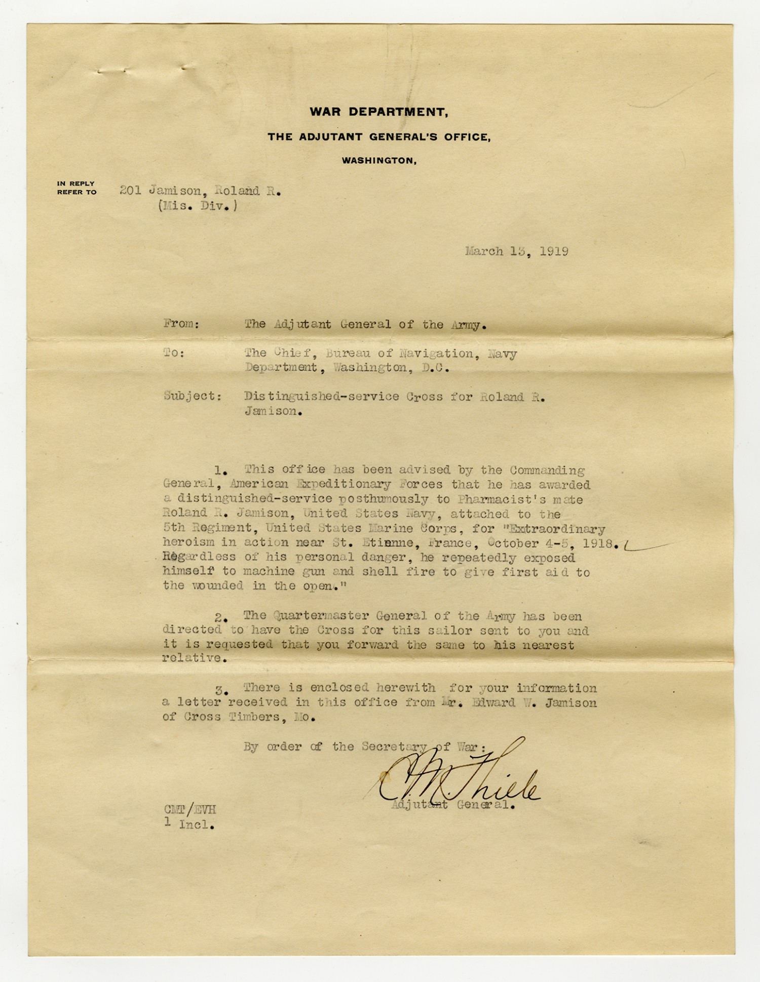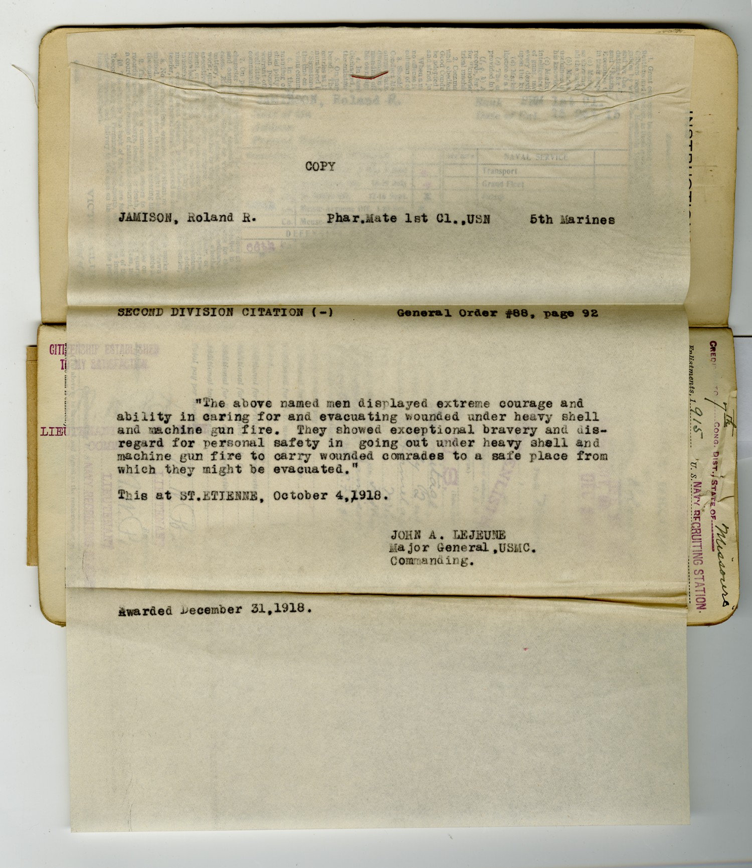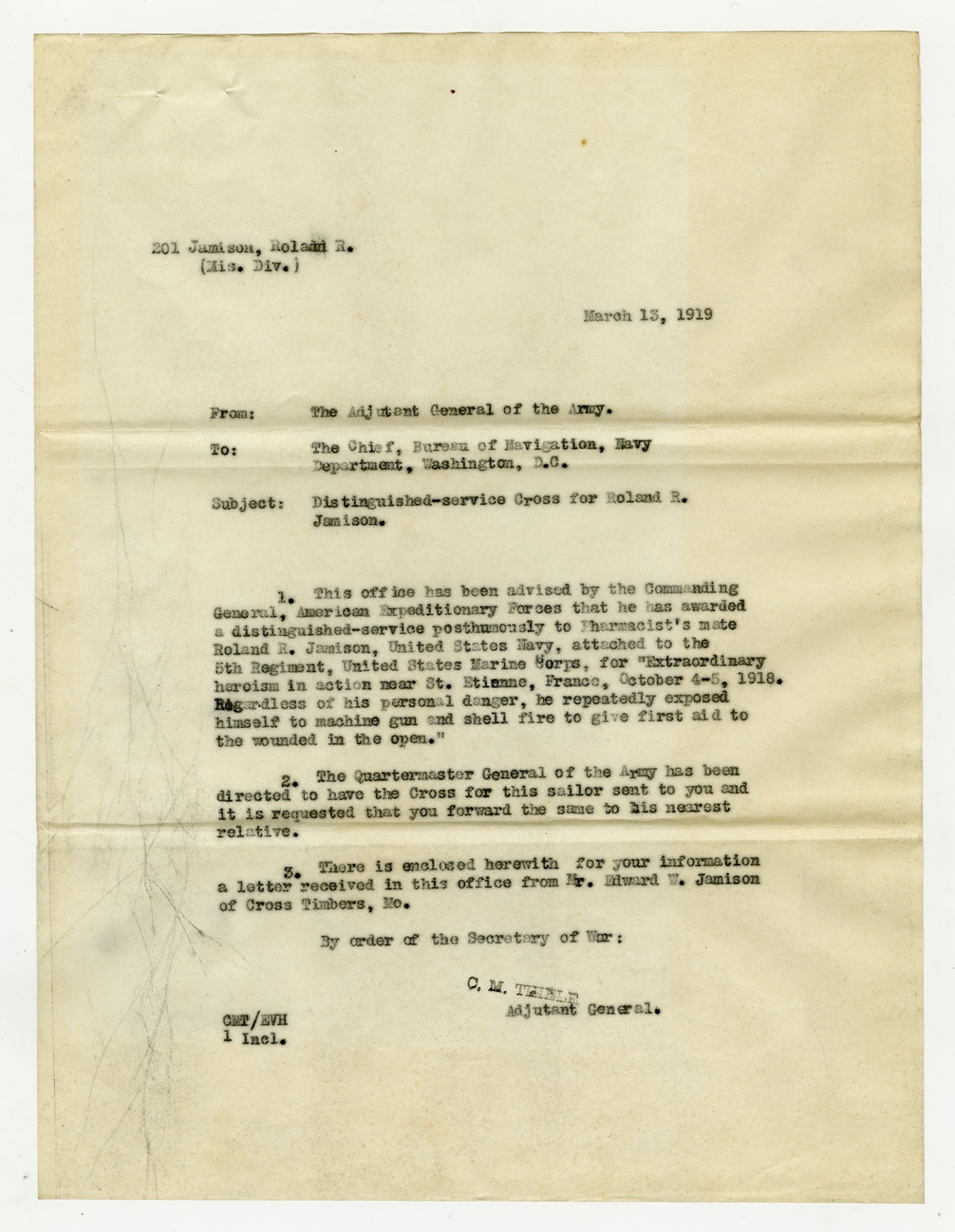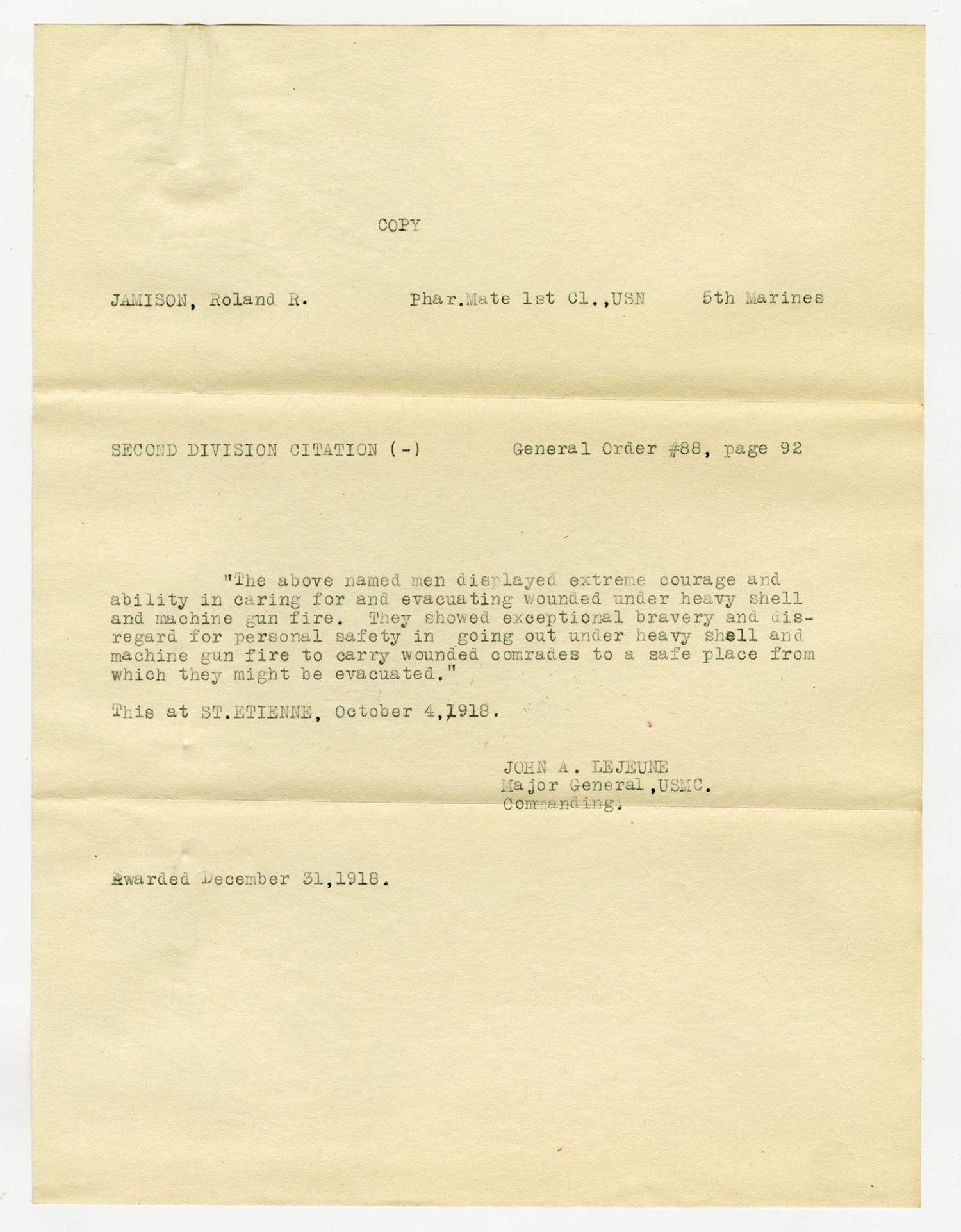 | Description | <p>Military personnel record files for Roland Ray Jamison containing his service record, medical records, and reports of death. Jamison enlisted in the Navy on December 20, 1915 and was killed in action on October 7, 1918 while serving in France with the 5th Marine Regiment. He was awarded the Distinguished Service Cross for his gallantry in action near St. Etienne after repeatedly exposing himself to machine gun and shell fire to assist the wounded.</p> |