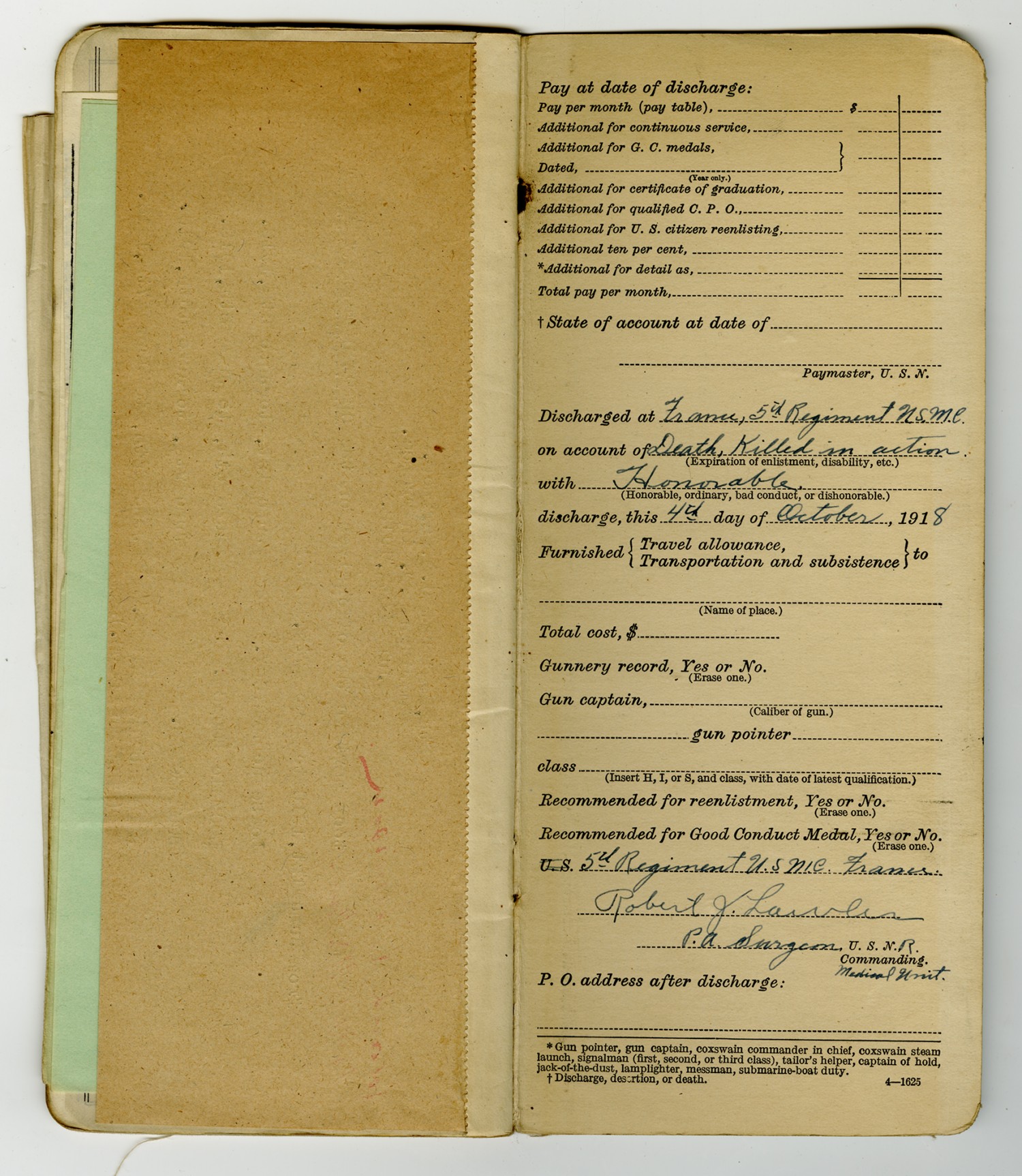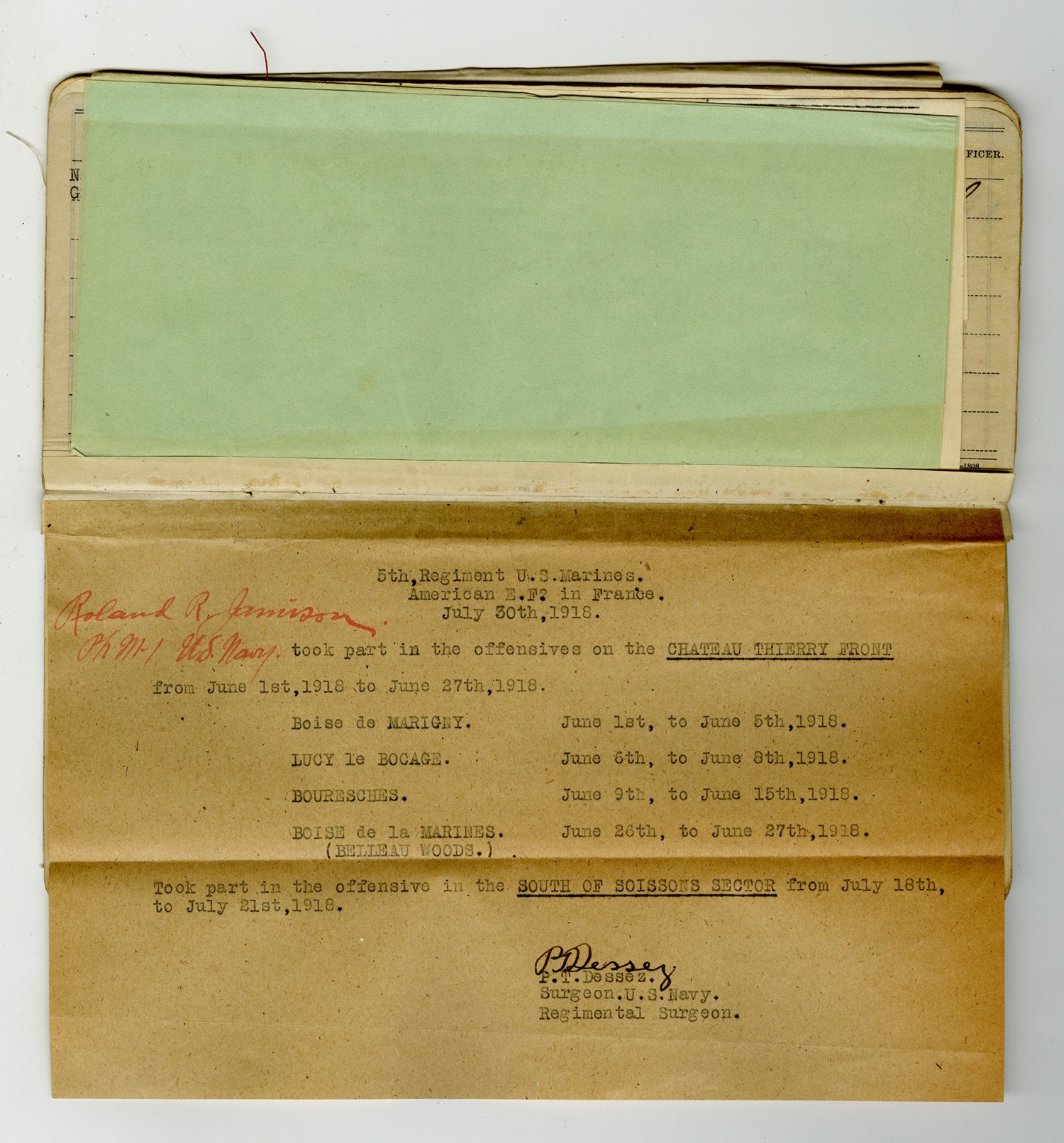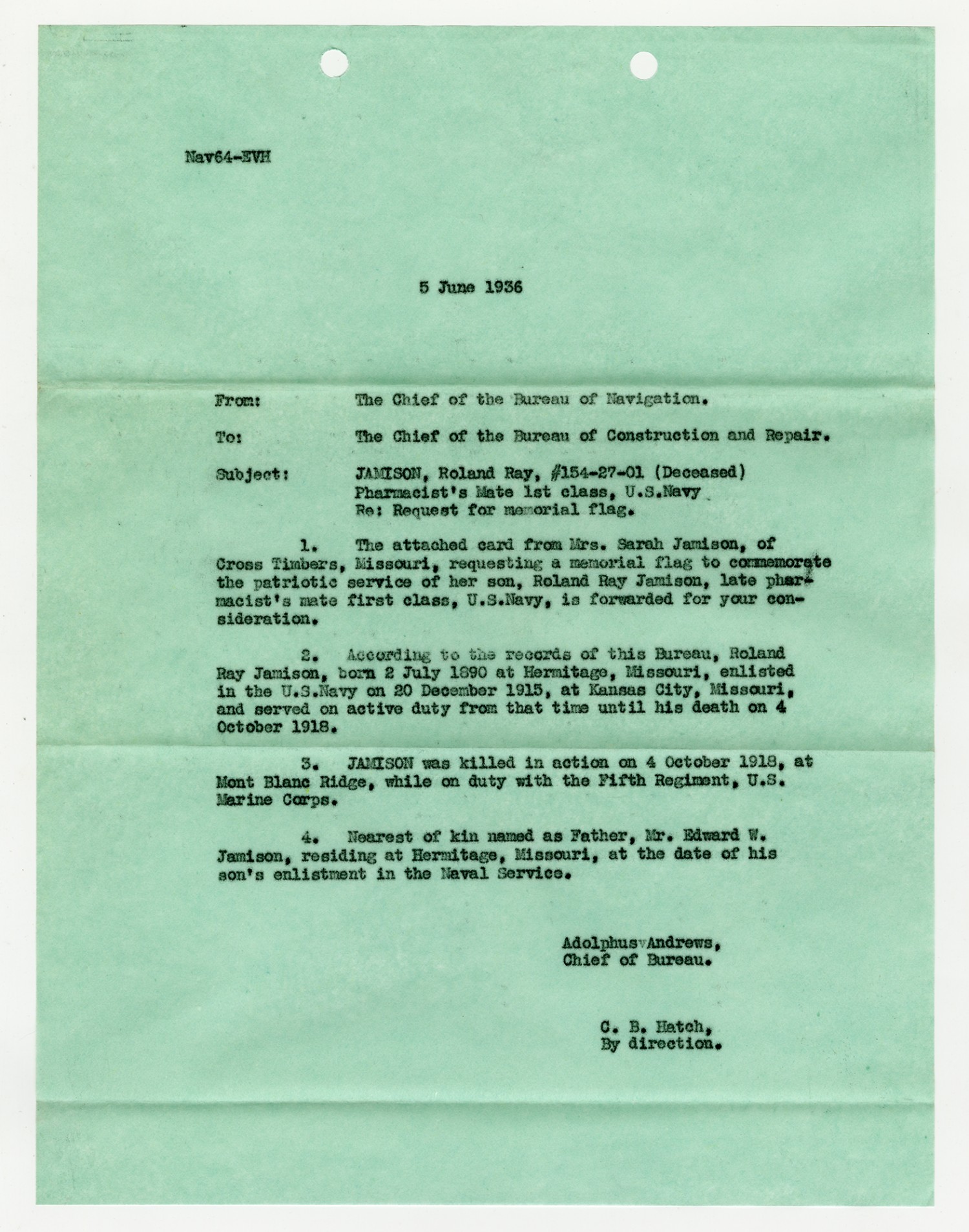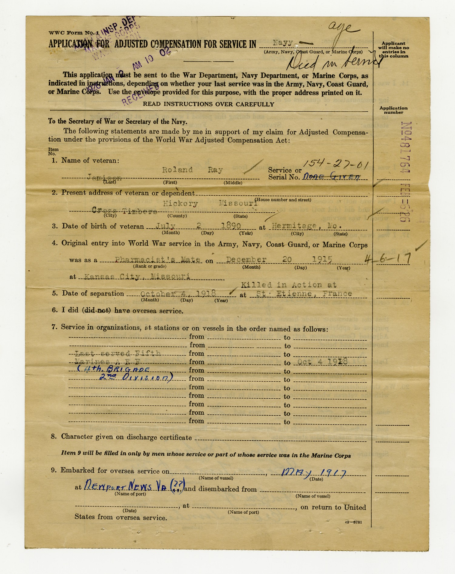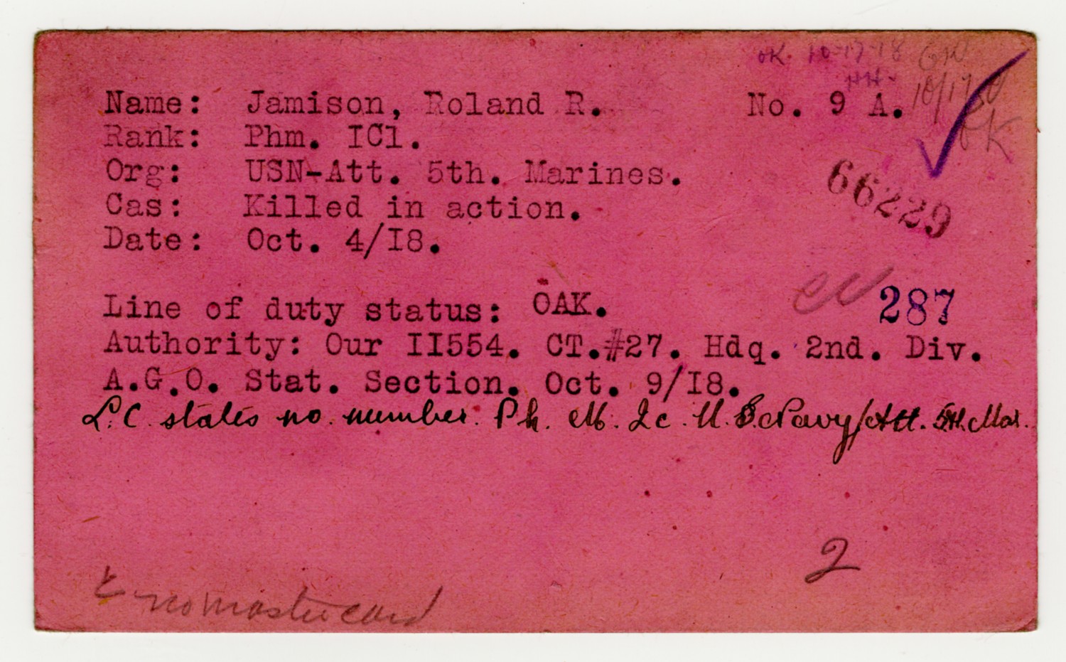 | Description | <p>Military personnel record files for Roland Ray Jamison containing his service record, medical records, and reports of death. Jamison enlisted in the Navy on December 20, 1915 and was killed in action on October 7, 1918 while serving in France with the 5th Marine Regiment. He was awarded the Distinguished Service Cross for his gallantry in action near St. Etienne after repeatedly exposing himself to machine gun and shell fire to assist the wounded.</p> |