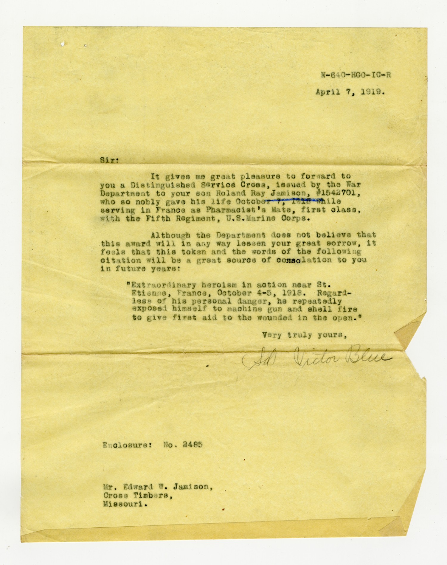 Victor Blue letter to Edward W. Jamison - April 7, 1919