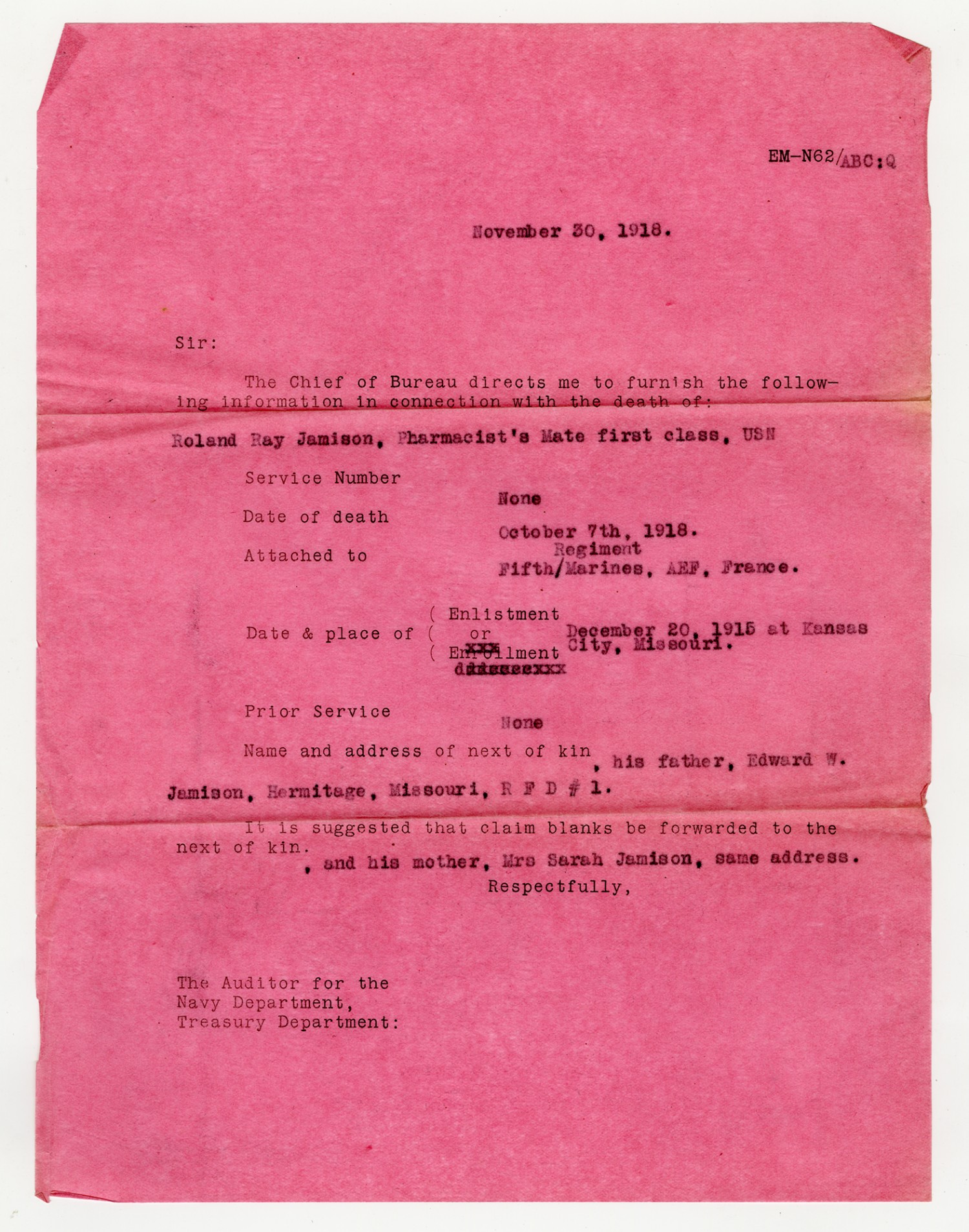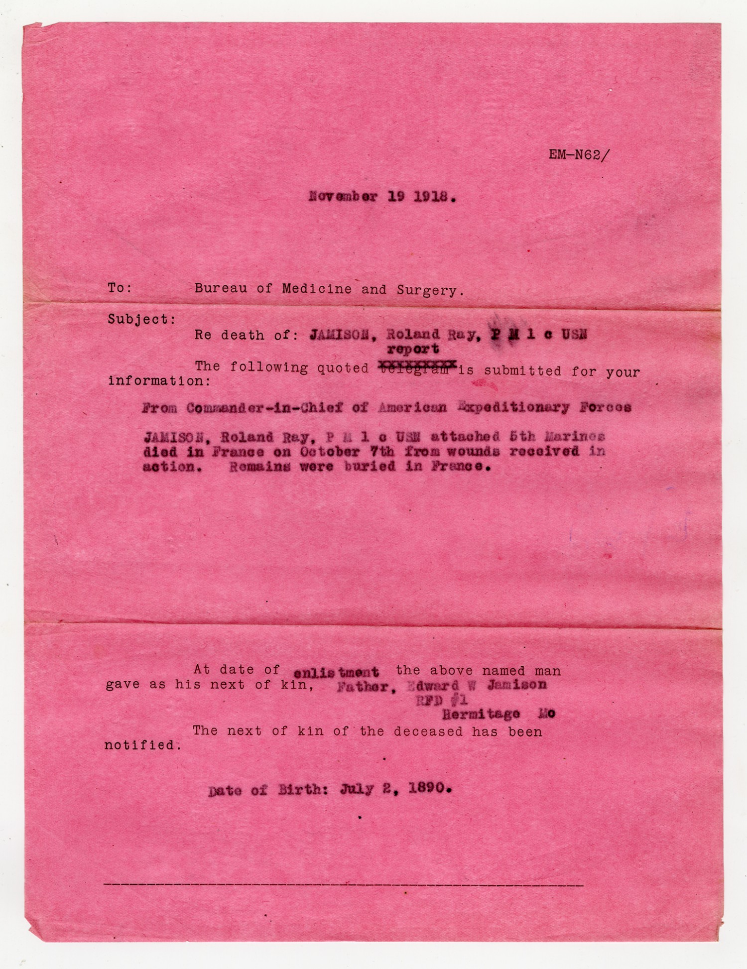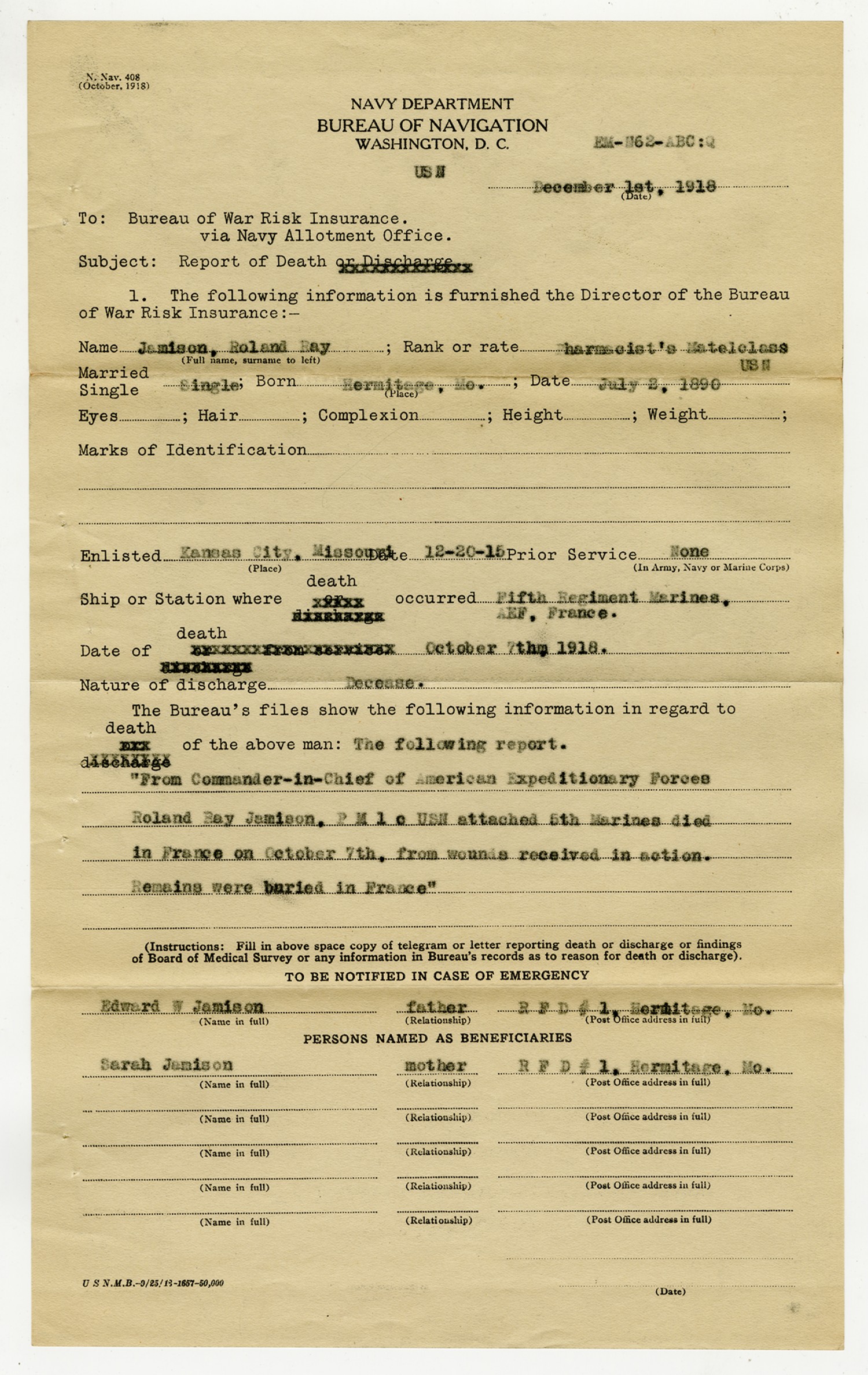 Roland Jamison Report of Death - December 1, 1918