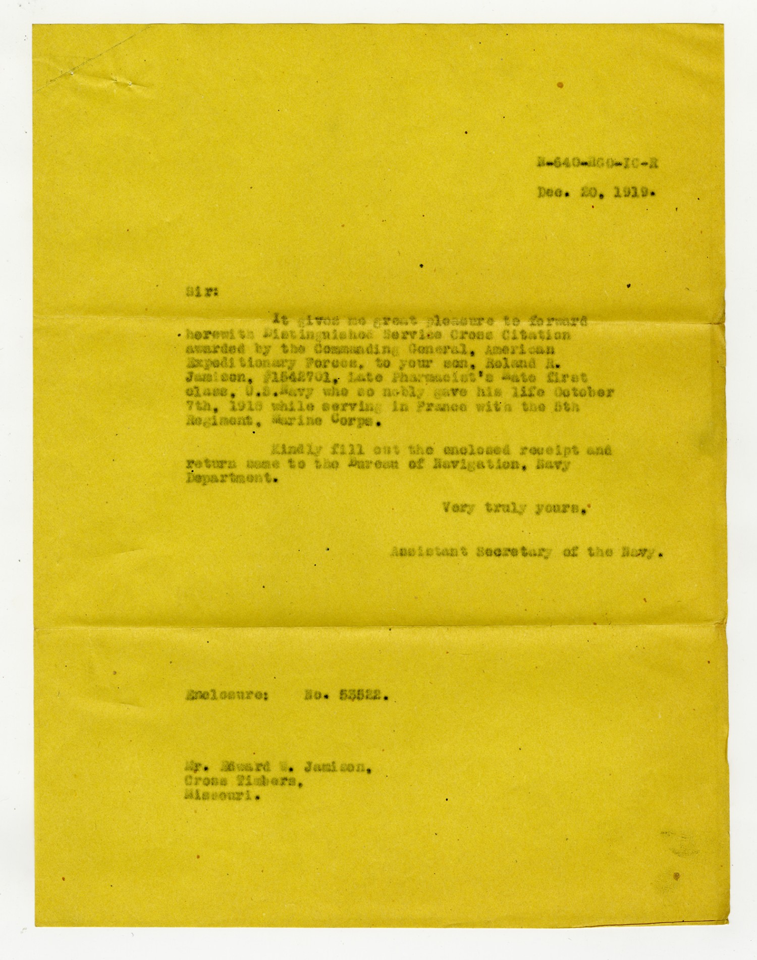 Assistant Secretary of the Navy letter to Edward W. Jamison - December 20, 1919