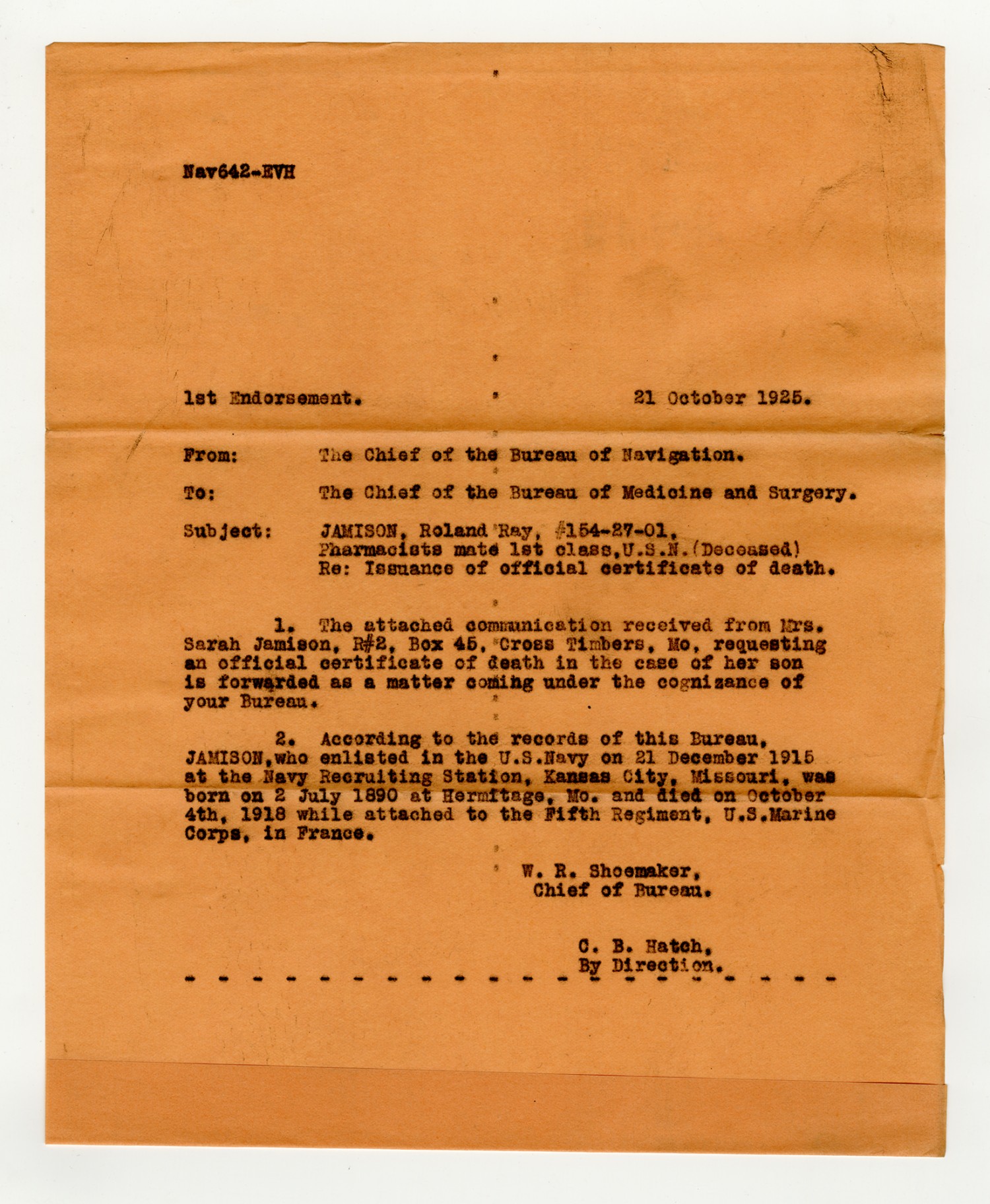 W.R. Shoemaker letter to the Chief of the Bureau of Navigation - October 21, 1925