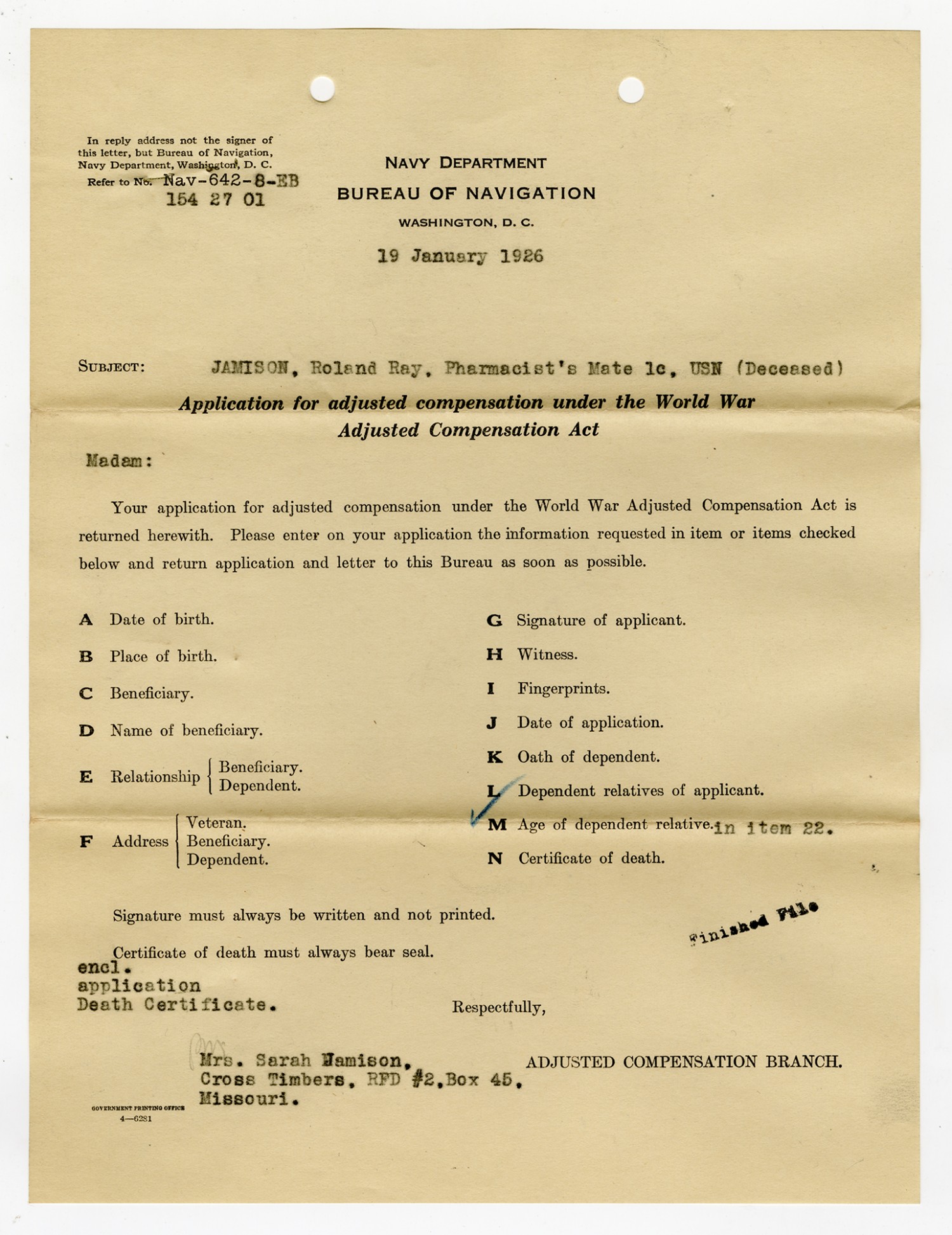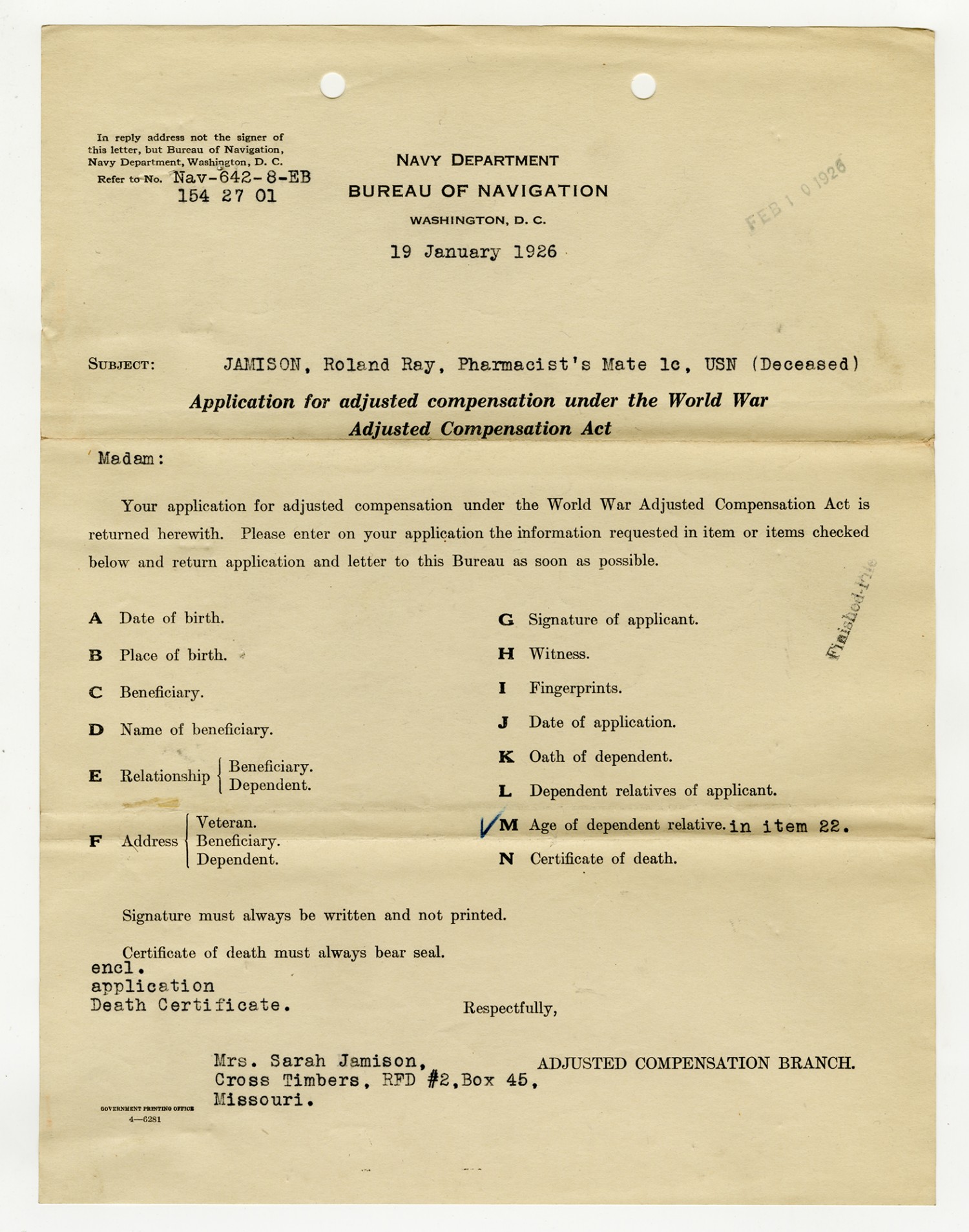 Application for Adjusted Compensation to Sarah Jamison- January 19, 1926