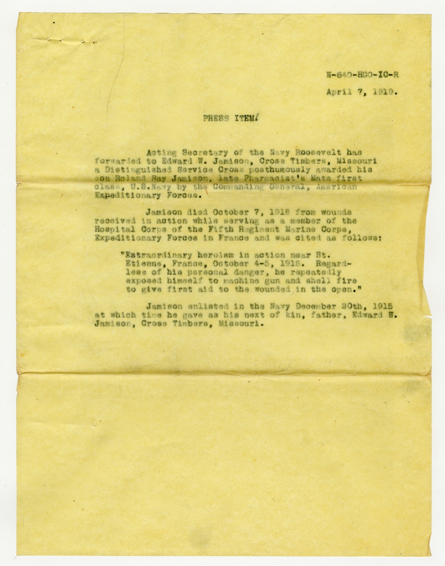 Roland Jamison Press Item - April 7, 1918