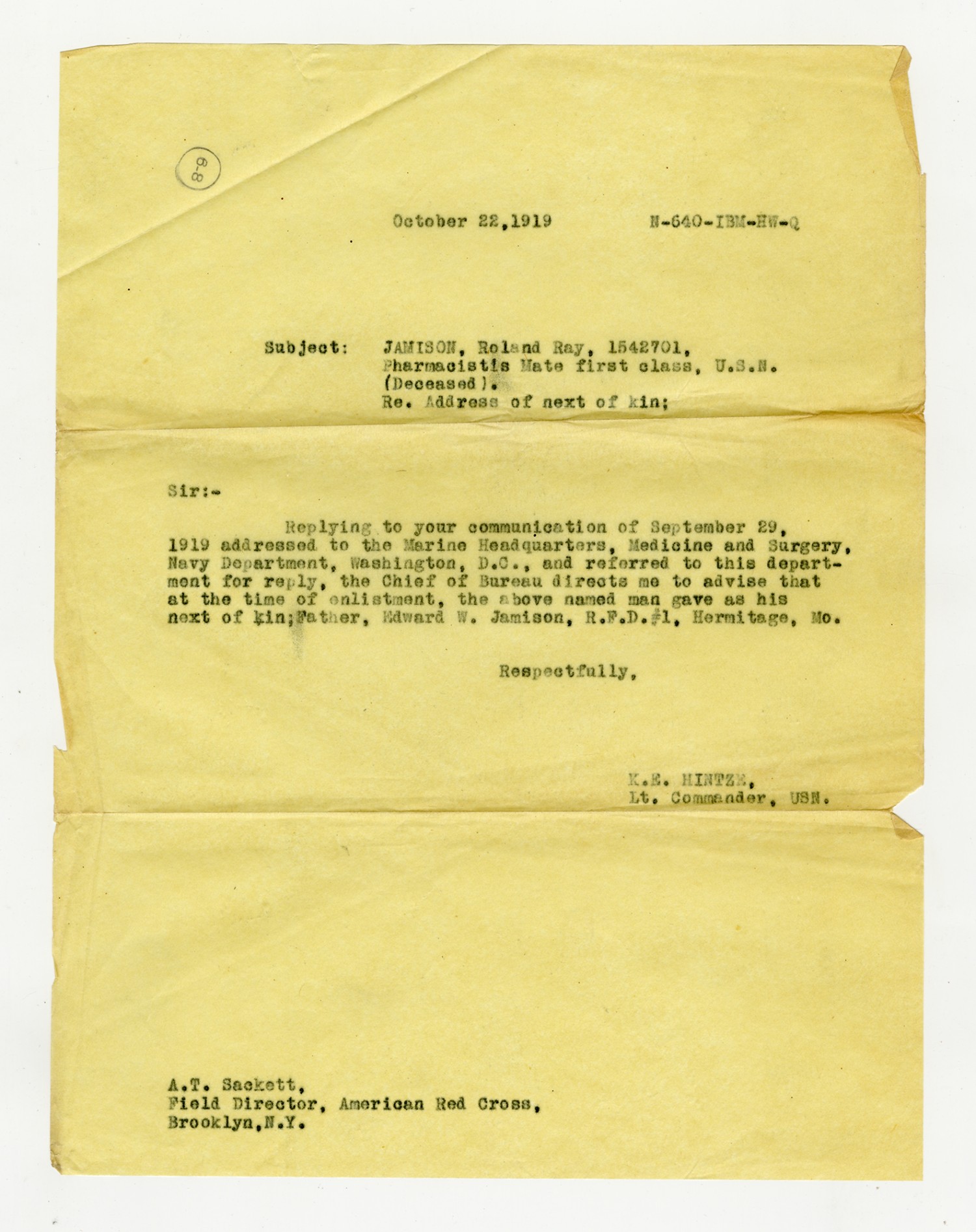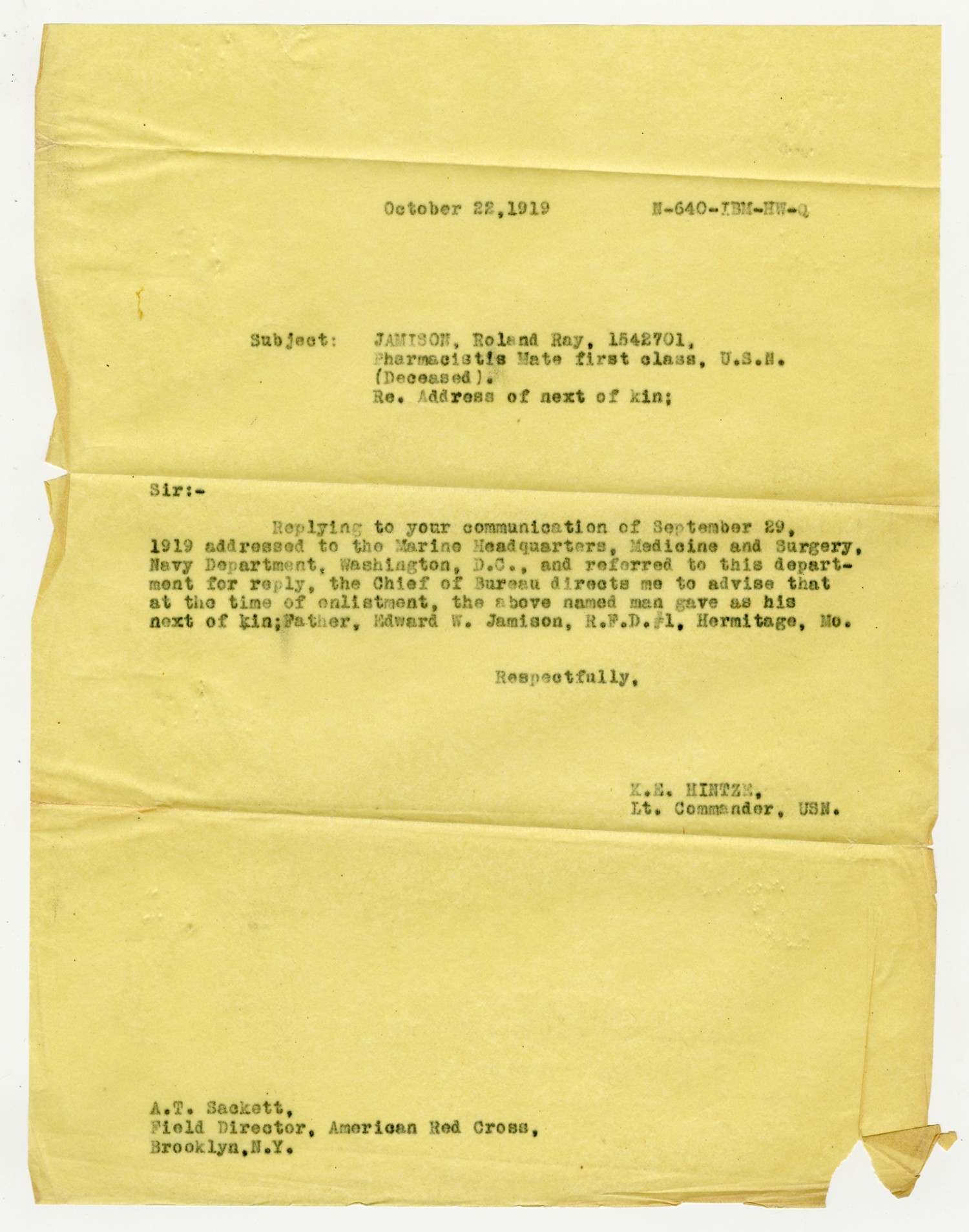 A.T. Sackett letter to Marine Headquarters of Medicine & Surgery - September 29, 1919