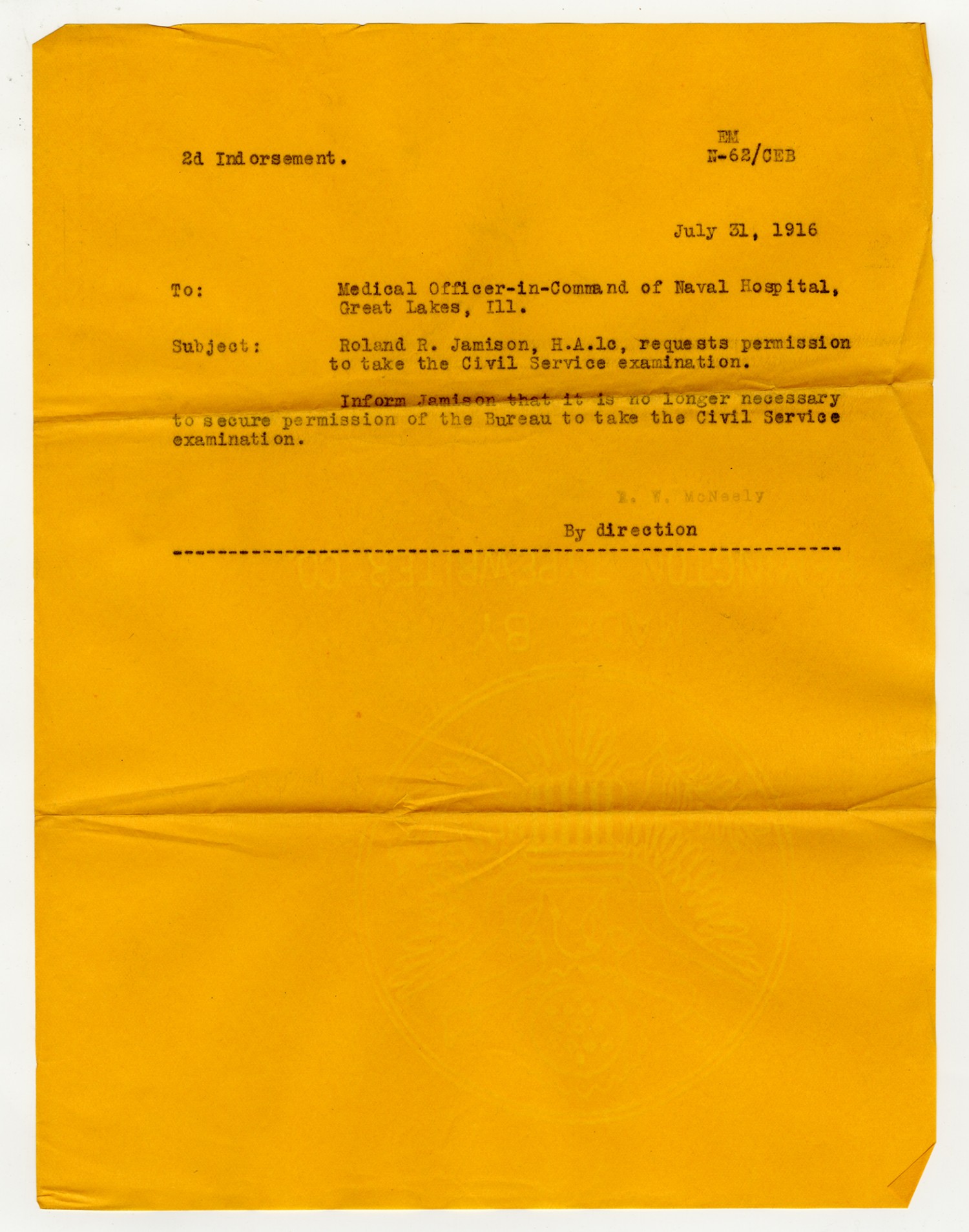 R.W. McNeely letter to the Medical Officer in Command of Naval Hospital - July 31, 1916