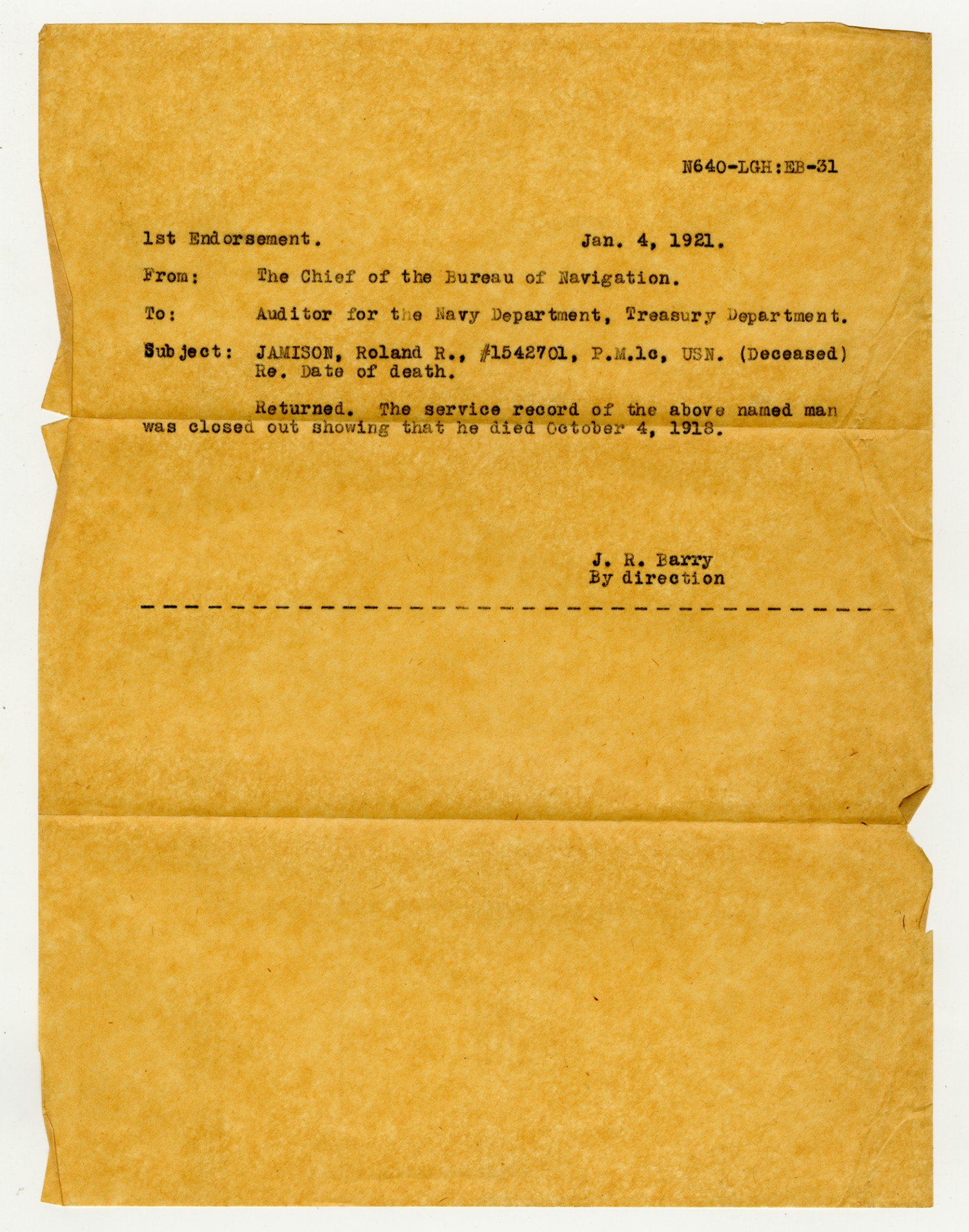 J.R. Barry letter to the Auditor for the Navy Department - January 4, 1921
