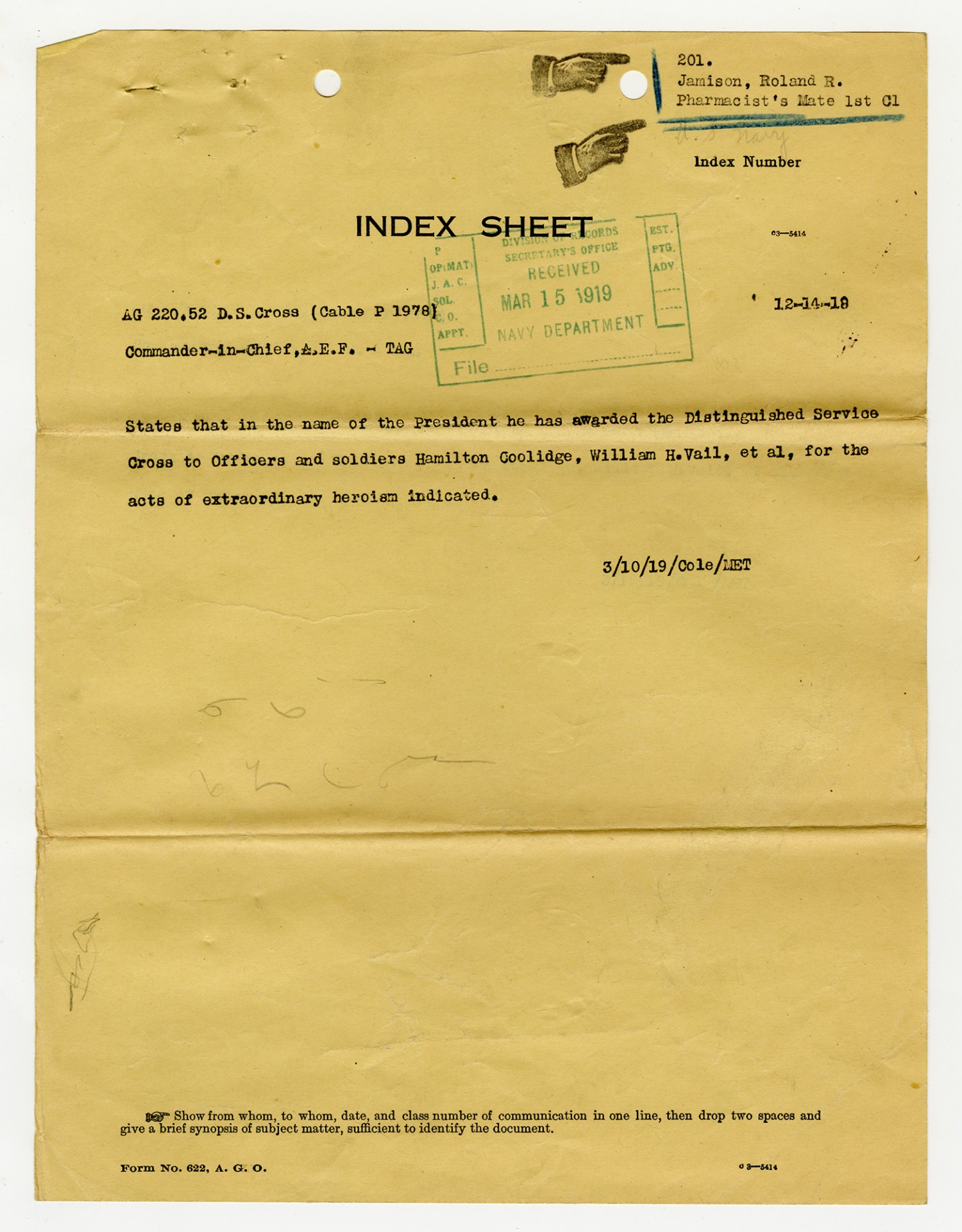 Index Sheet - March 10, 1919
