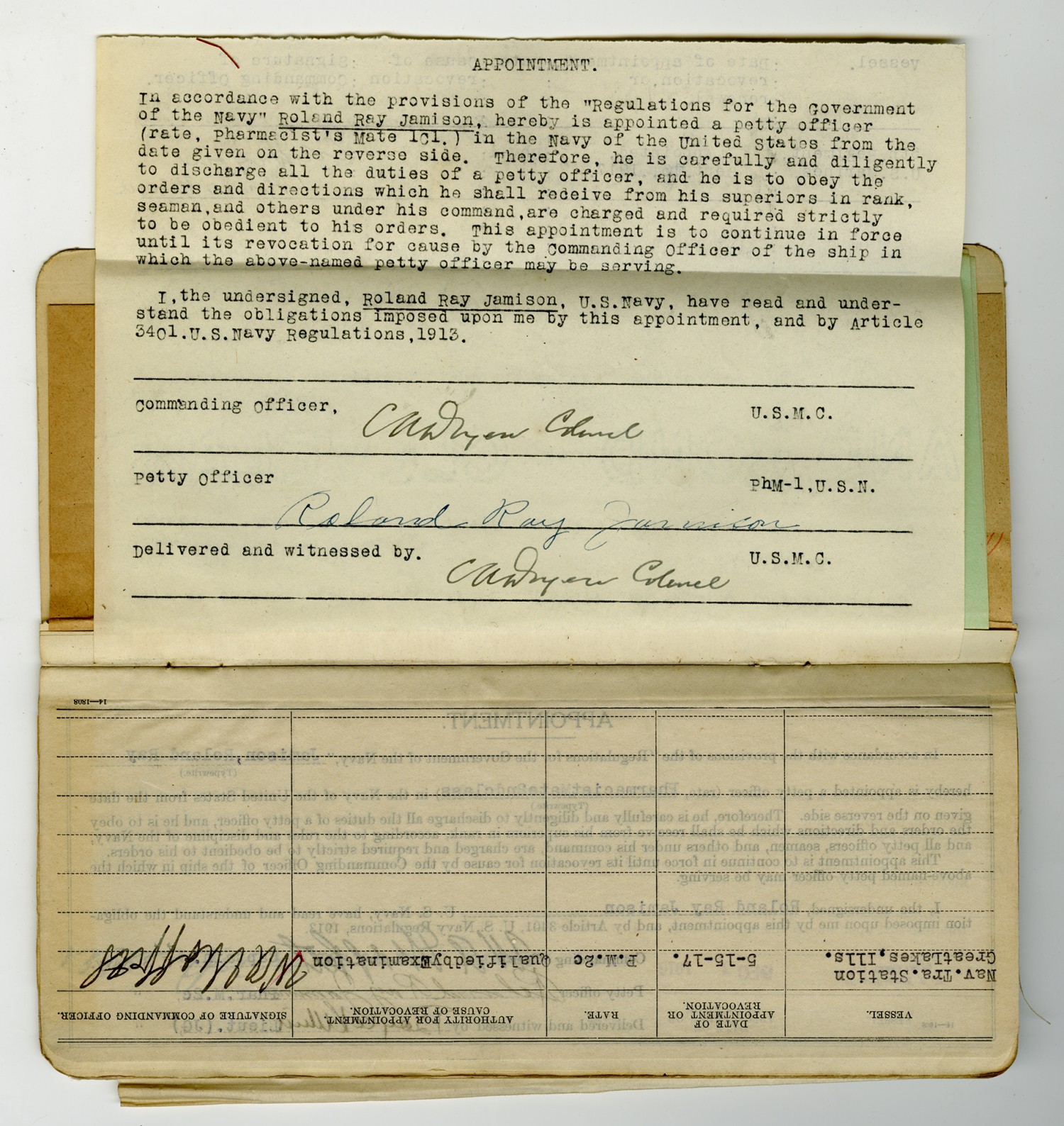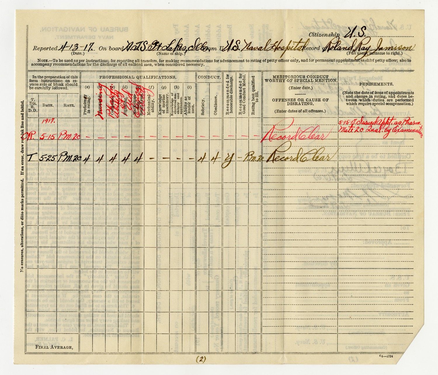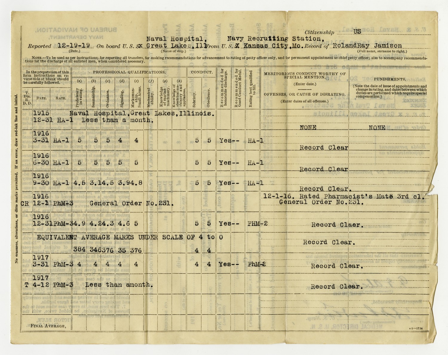 Roland R. Jamison Service Record - 1915-1917
