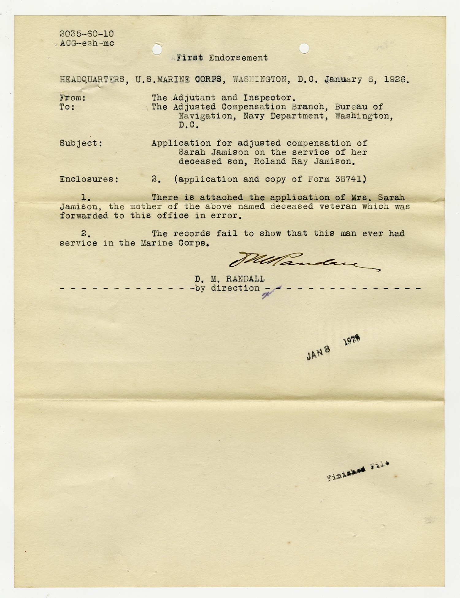 D.M. Randall letter to the Adjusted Compensation Branch - January 6, 1926