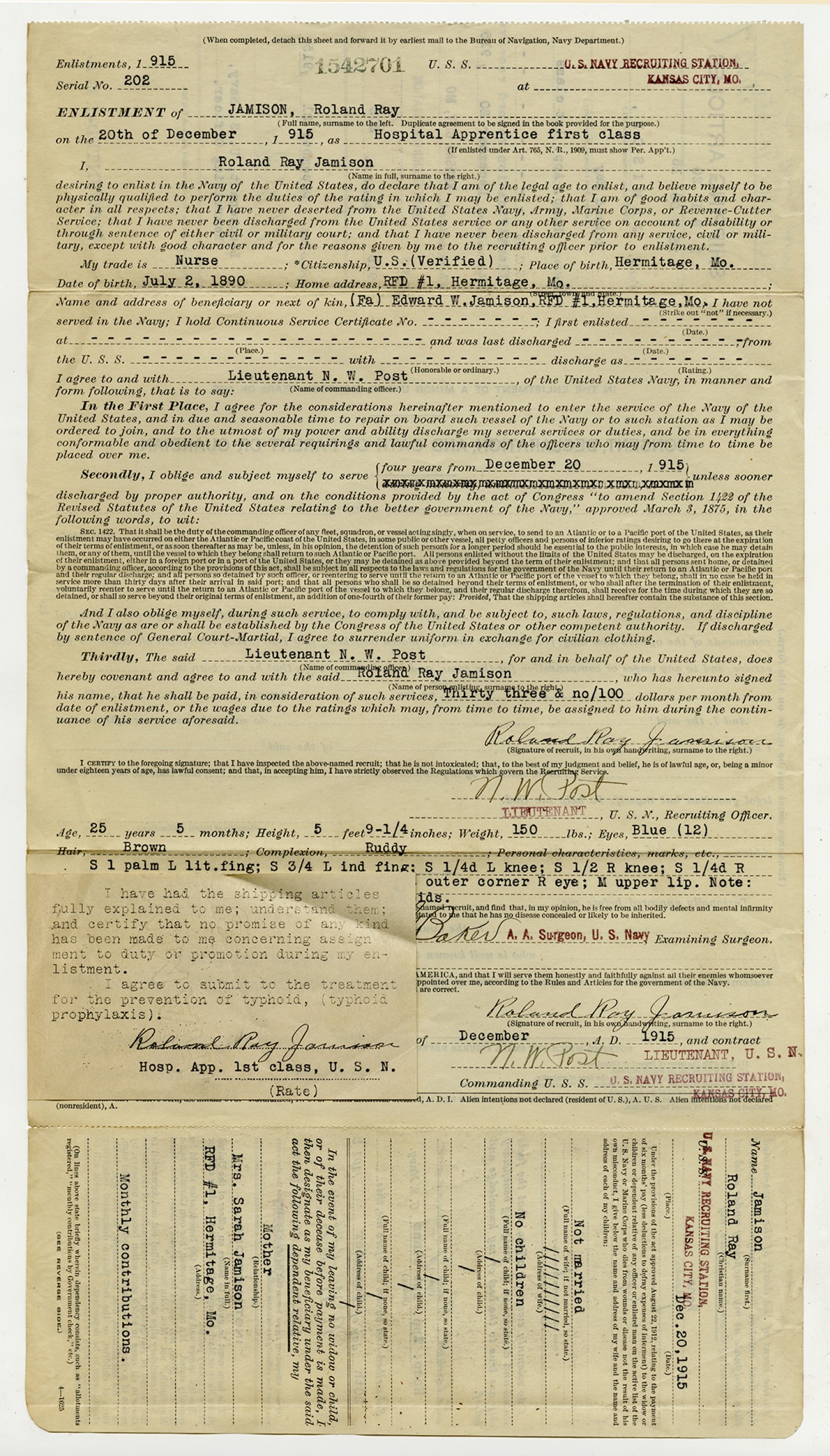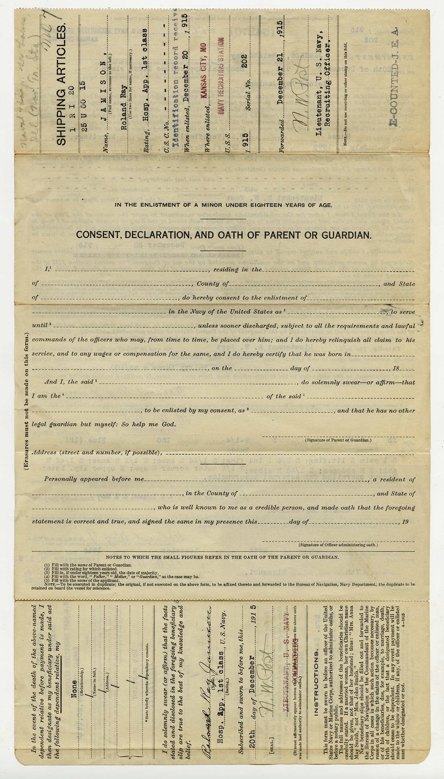 Roland R. Jamison Enlistment Form - December 20, 1915