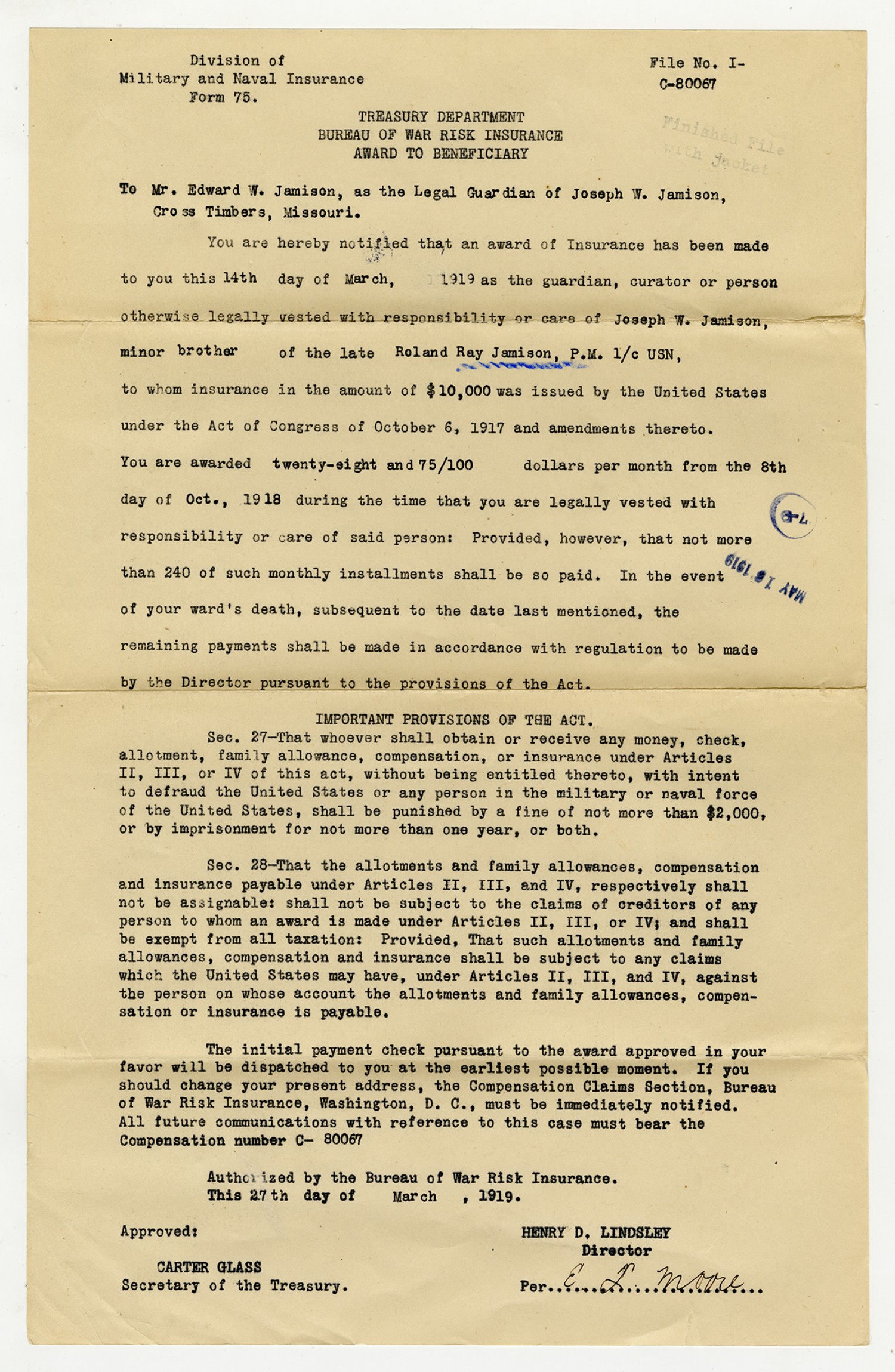 Letter to Edward Jamison - April 7, 1919