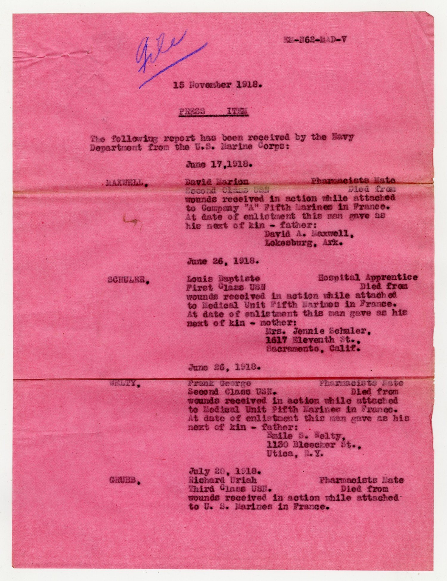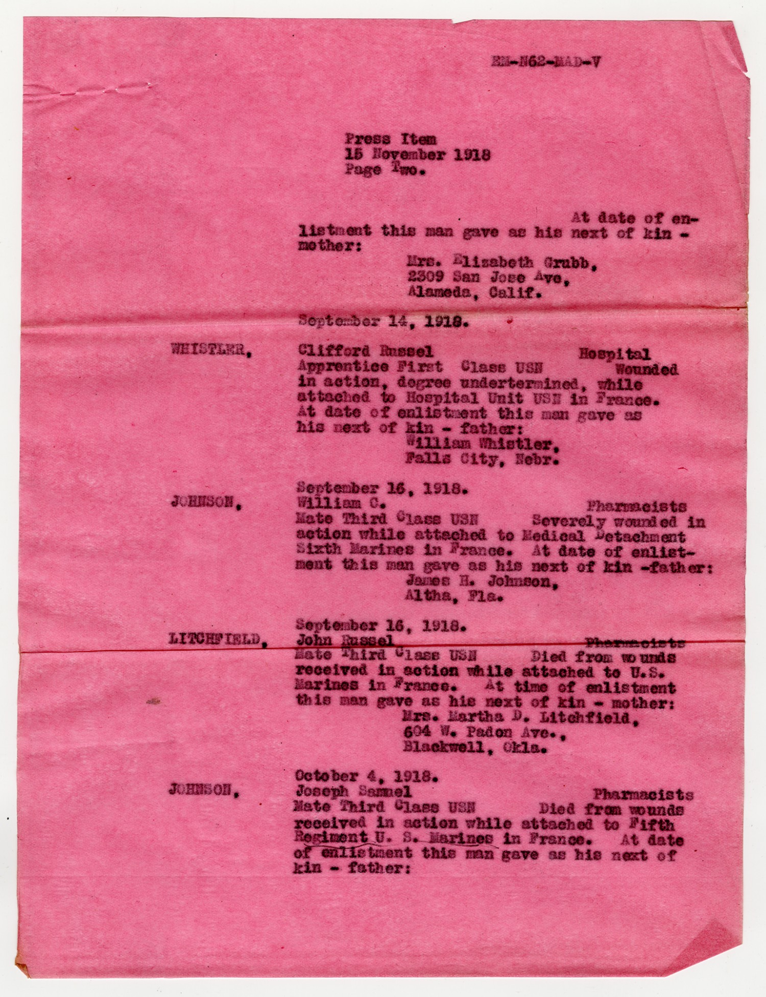 List of Deceased Soldiers - November 15, 1918