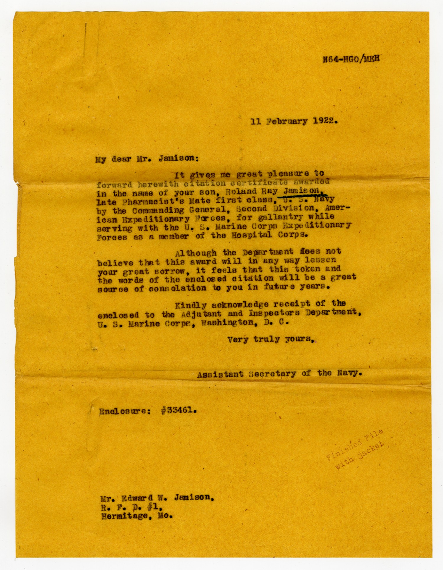 Assistant Secretary of War letter to Edward W. Jamison - February 11, 1922