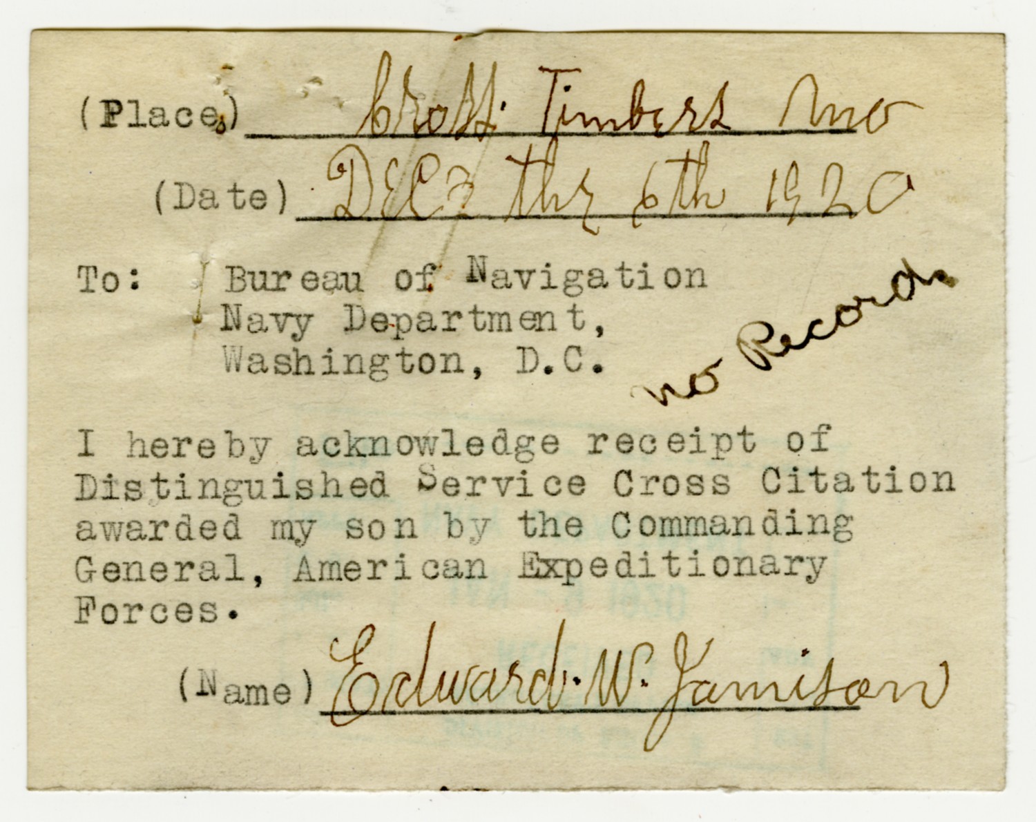 Edward W. Jamison letter to the Bureau of Navigation - December 6, 1920