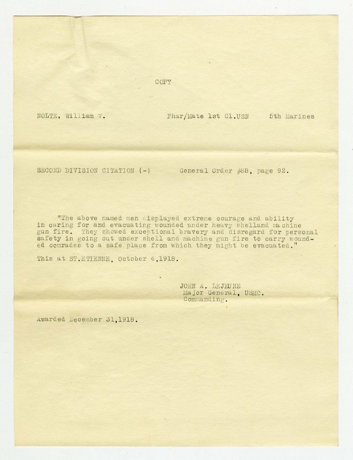 Major General John A. Lejeune letter to William V. Nolte - December 31, 1918