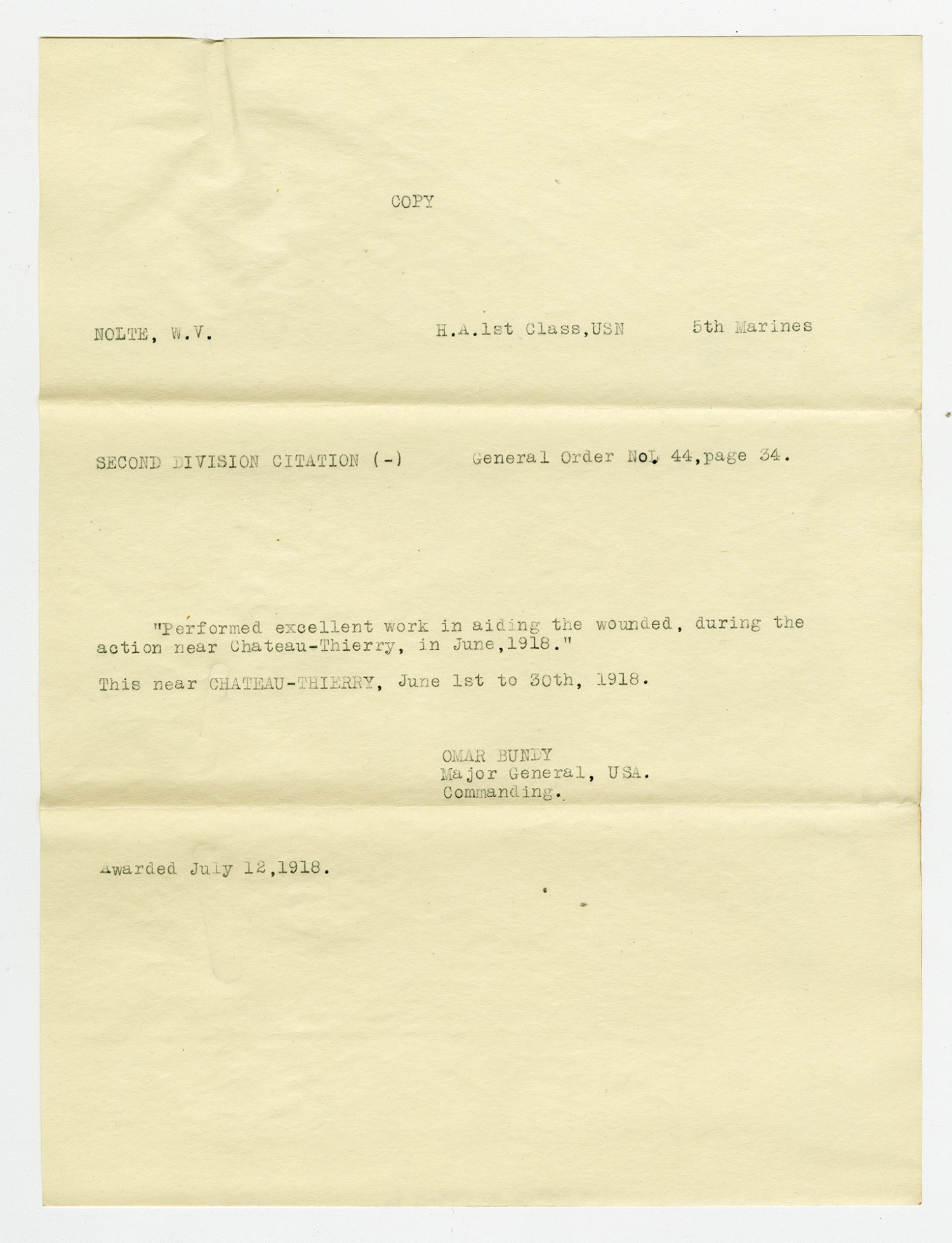 Major General Omar Bundy letter to William V. Nolte - July 12, 1918