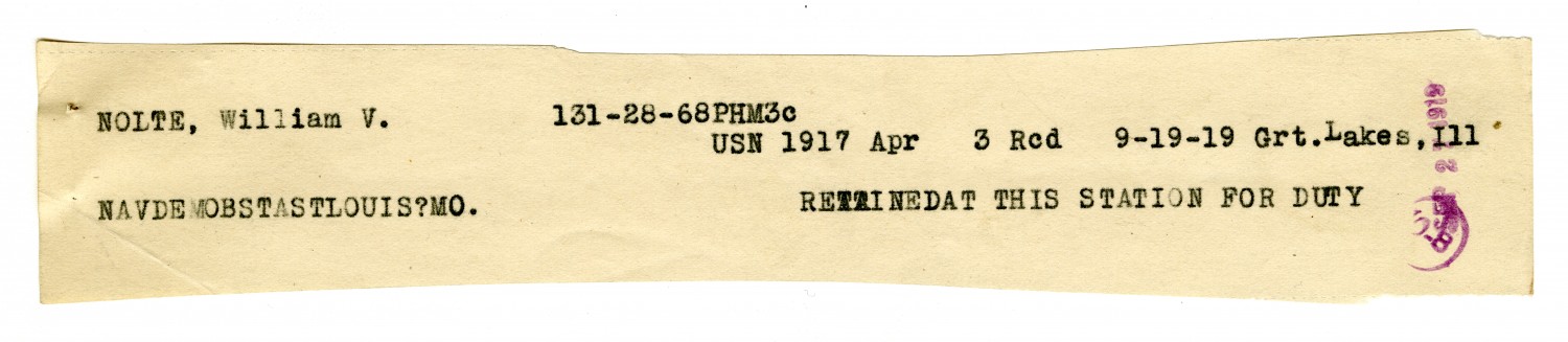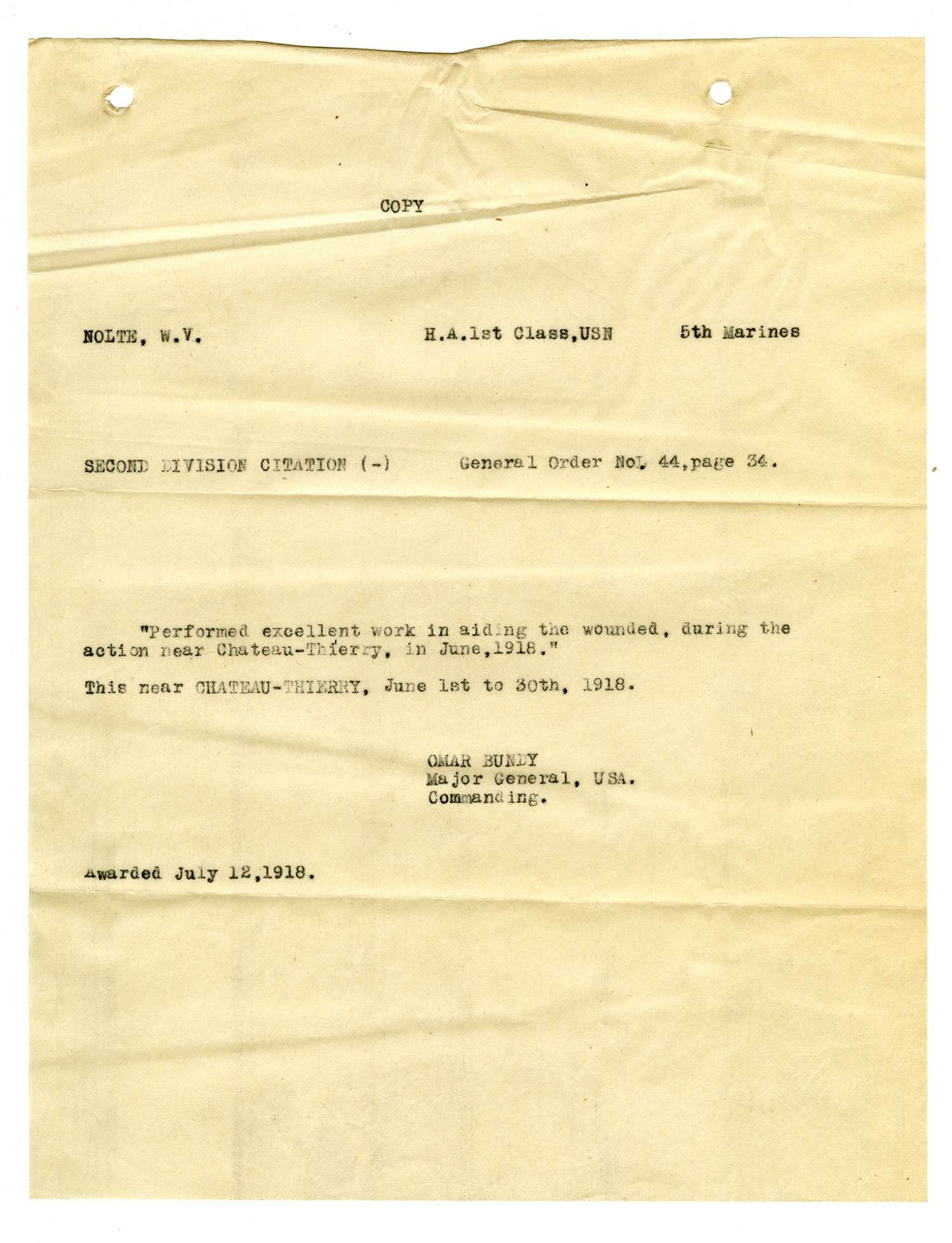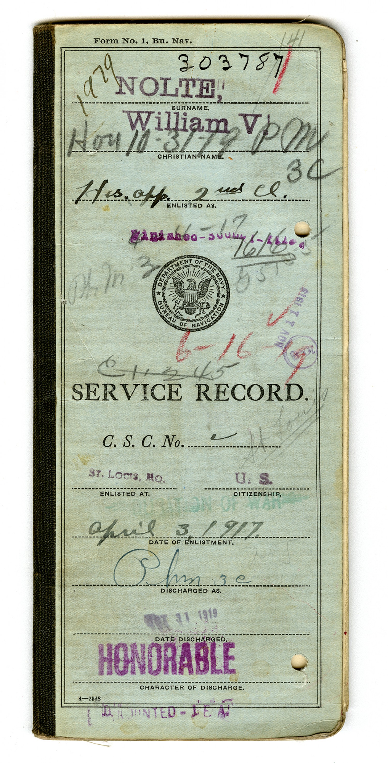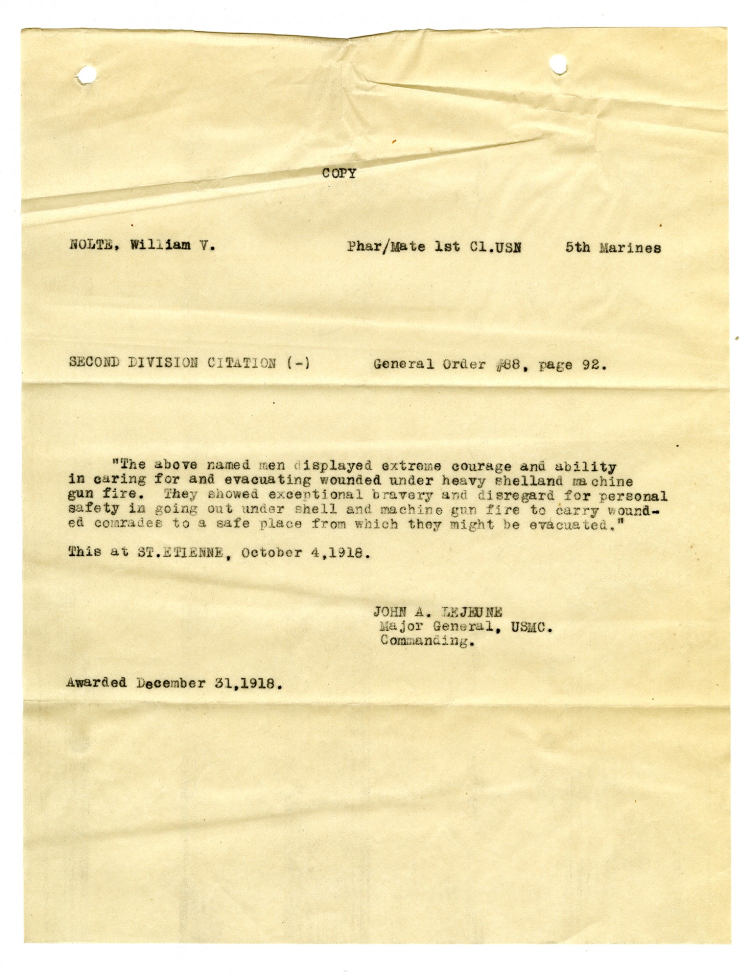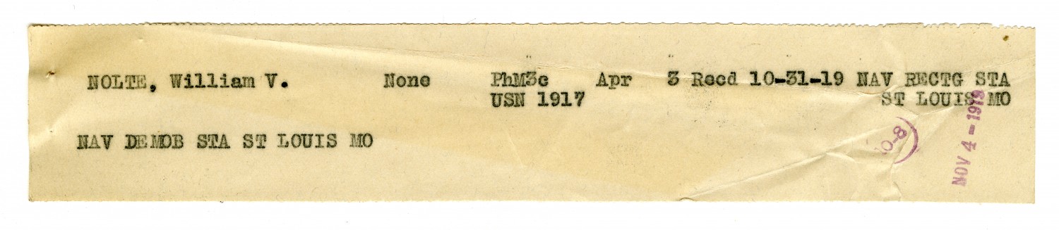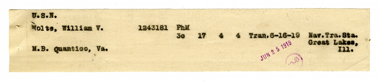 | Description | <p>Personnel record files for William V. Nolte containing service records, receipt for medals of honor, records of payment and transferal requests. William Vermont Nolte, Ph.M 3c U.S.N. served in the 6th regiment, Marine Corps, Expeditionary Forces as a member of the Hospital Corps. He was born on February 21, 1899 in Hartford, Ind. and enlisted to the military on April 3, 1917 until October, 31, 1919. </p> |