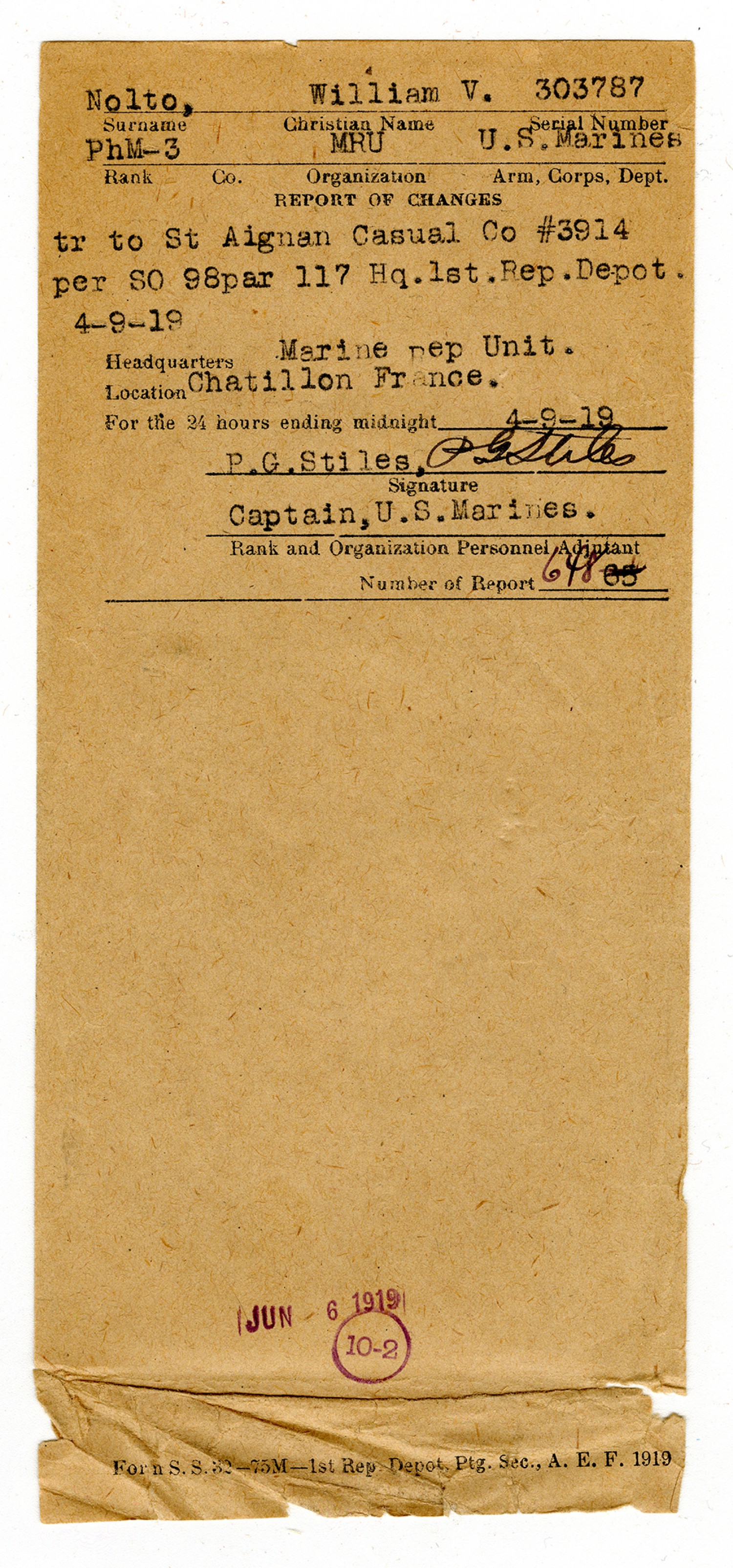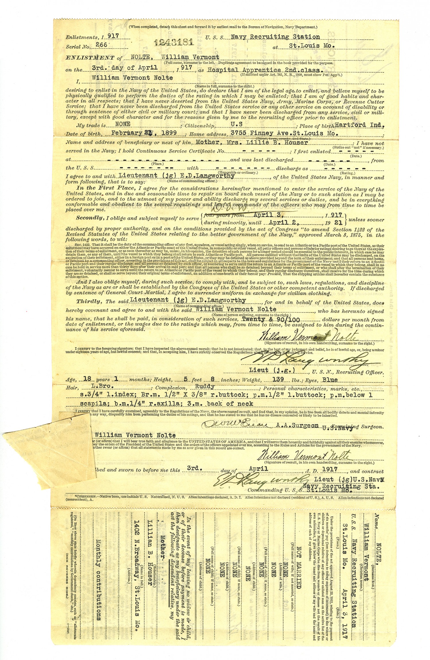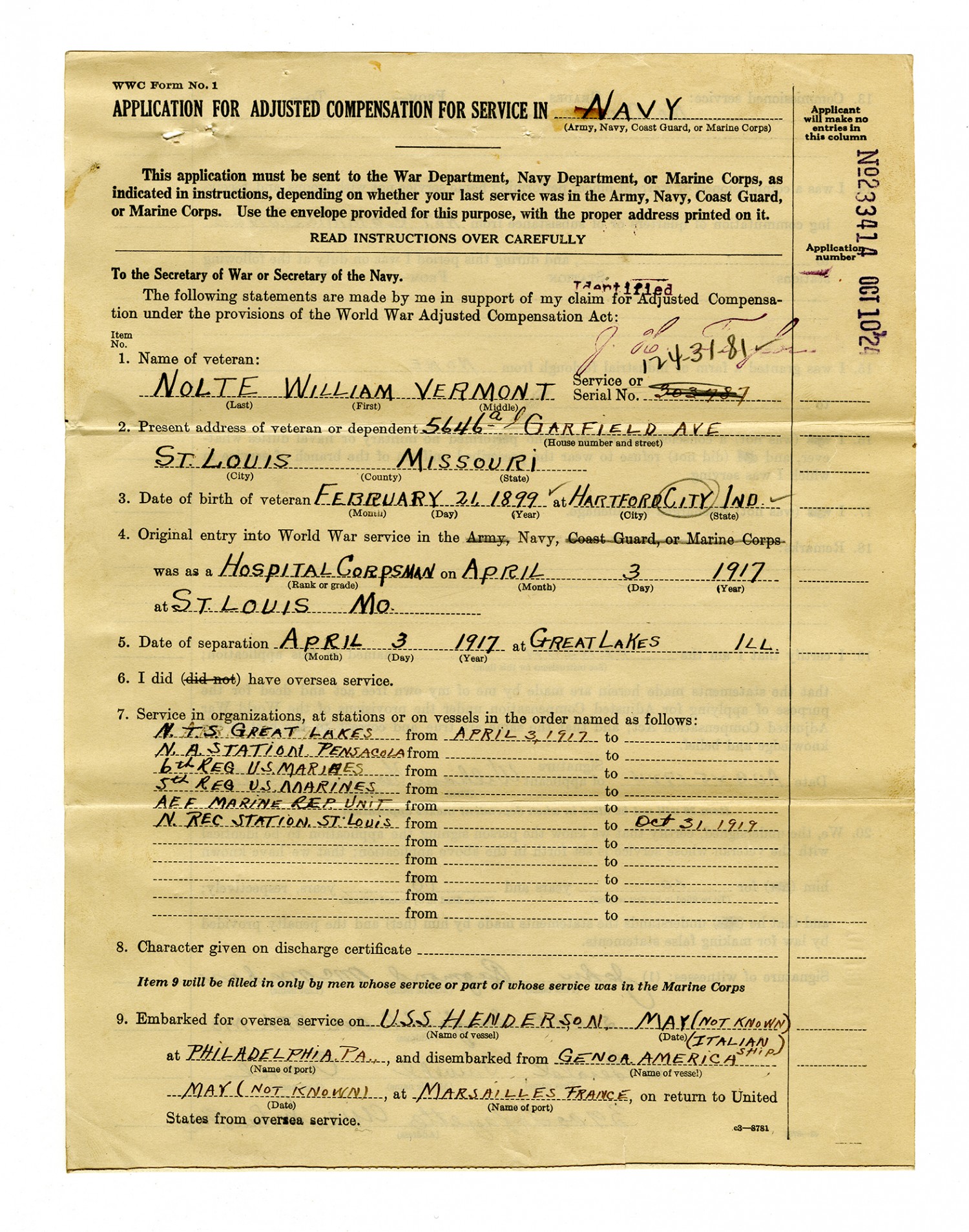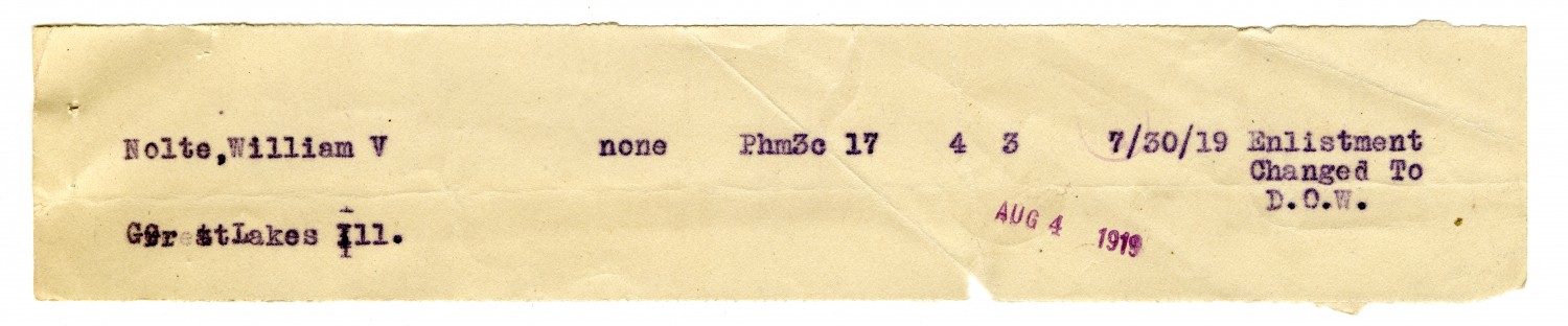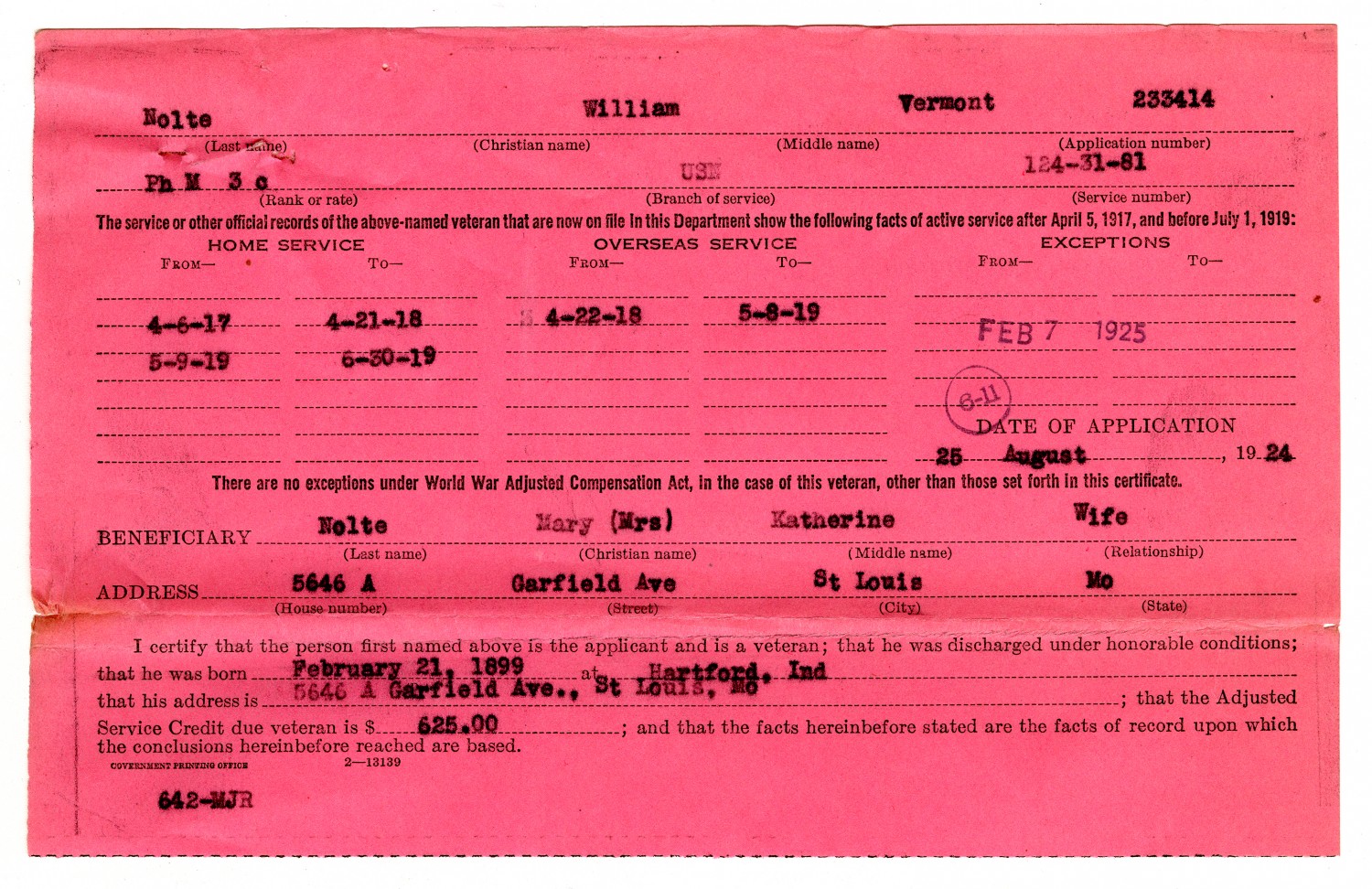 | Description | <p>Personnel record files for William V. Nolte containing service records, receipt for medals of honor, records of payment and transferal requests. William Vermont Nolte, Ph.M 3c U.S.N. served in the 6th regiment, Marine Corps, Expeditionary Forces as a member of the Hospital Corps. He was born on February 21, 1899 in Hartford, Ind. and enlisted to the military on April 3, 1917 until October, 31, 1919. </p> |