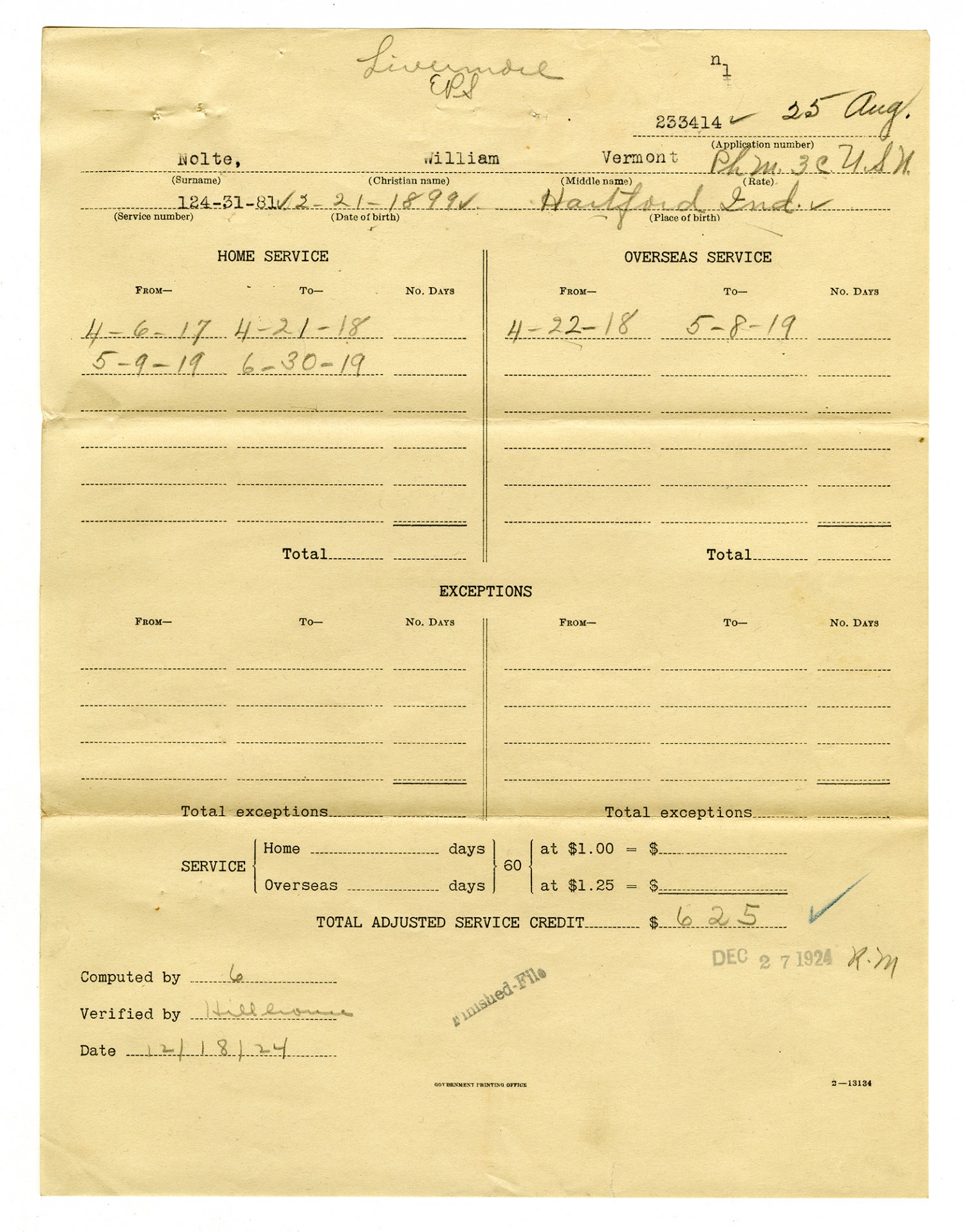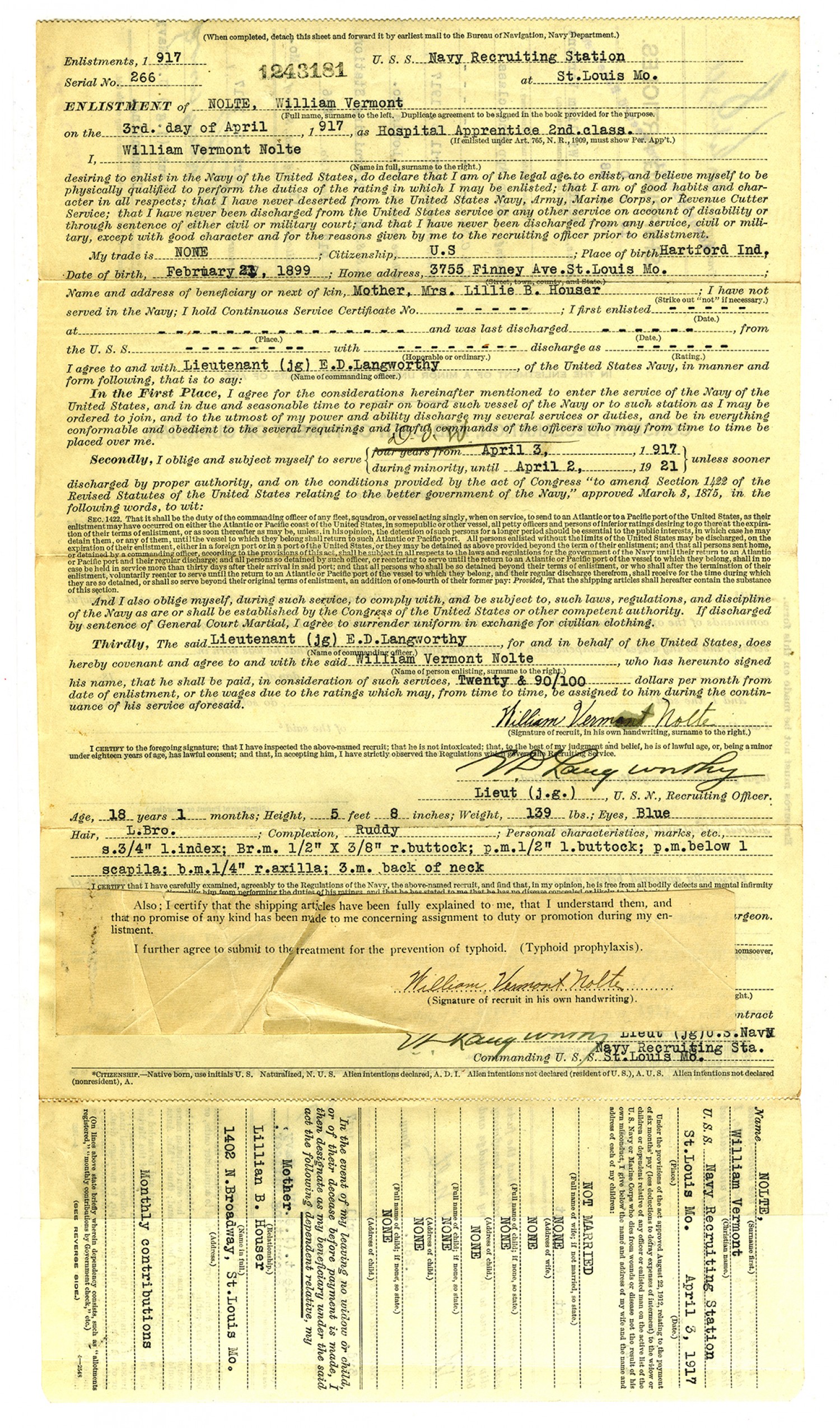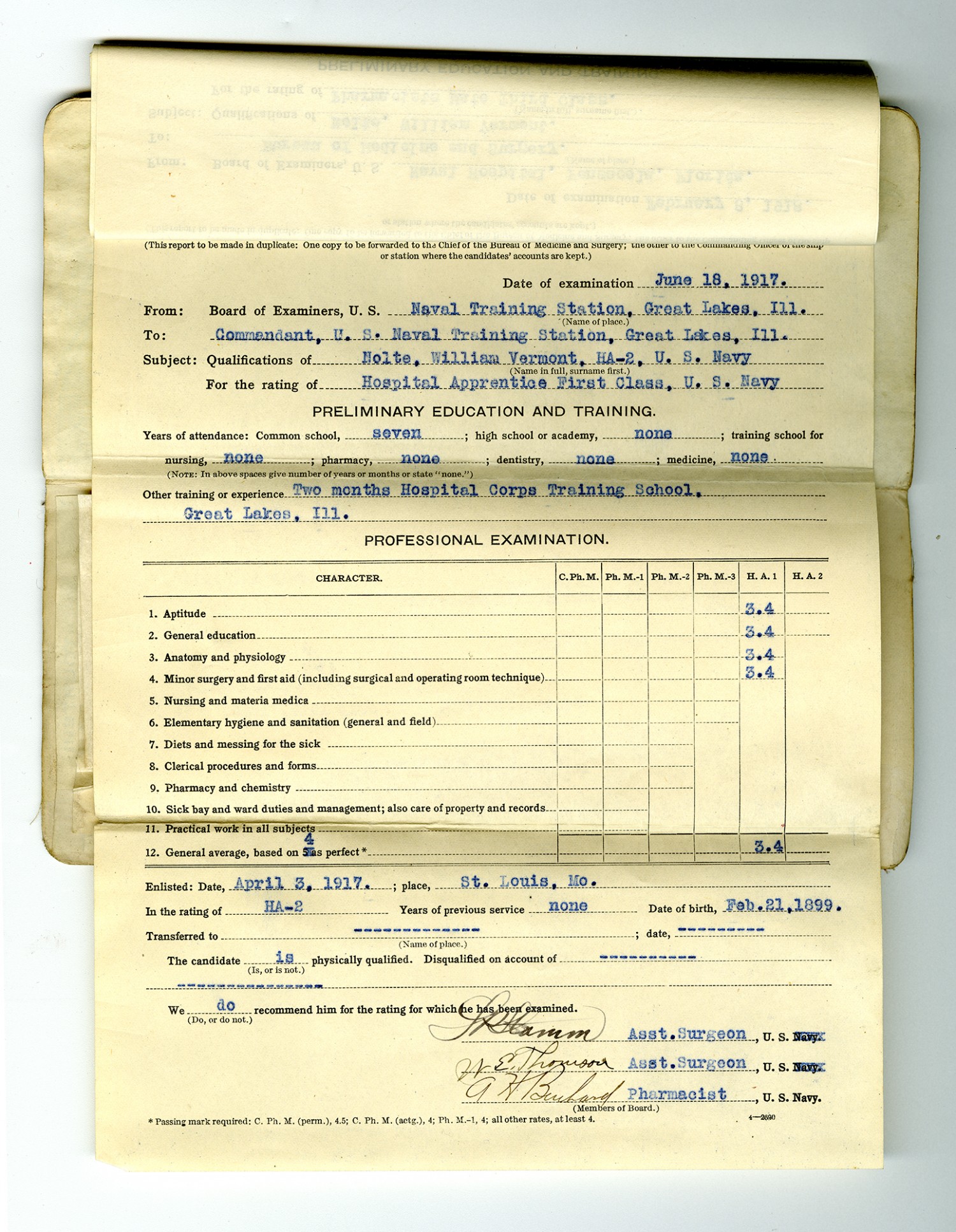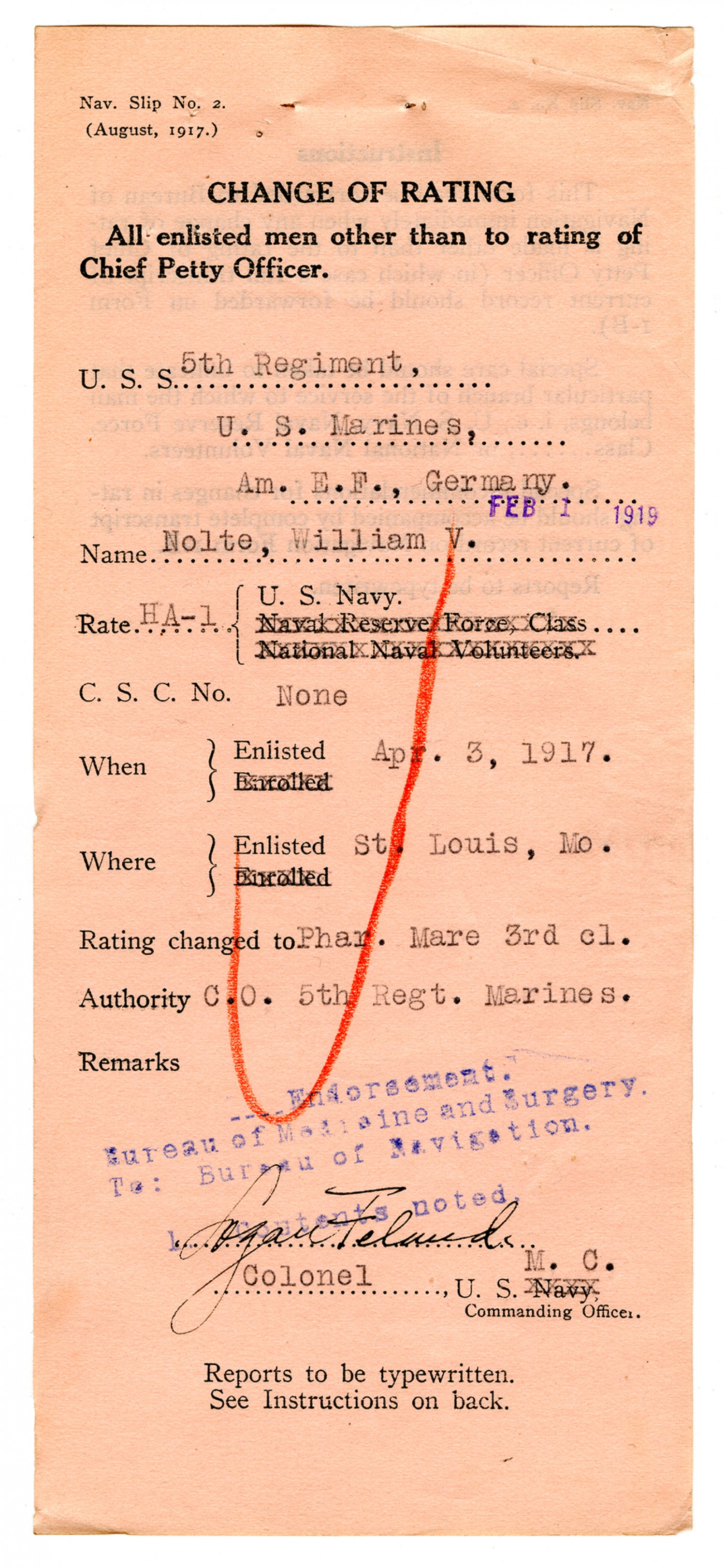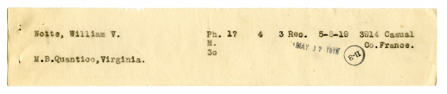 | Description | <p>Personnel record files for William V. Nolte containing service records, receipt for medals of honor, records of payment and transferal requests. William Vermont Nolte, Ph.M 3c U.S.N. served in the 6th regiment, Marine Corps, Expeditionary Forces as a member of the Hospital Corps. He was born on February 21, 1899 in Hartford, Ind. and enlisted to the military on April 3, 1917 until October, 31, 1919. </p> |