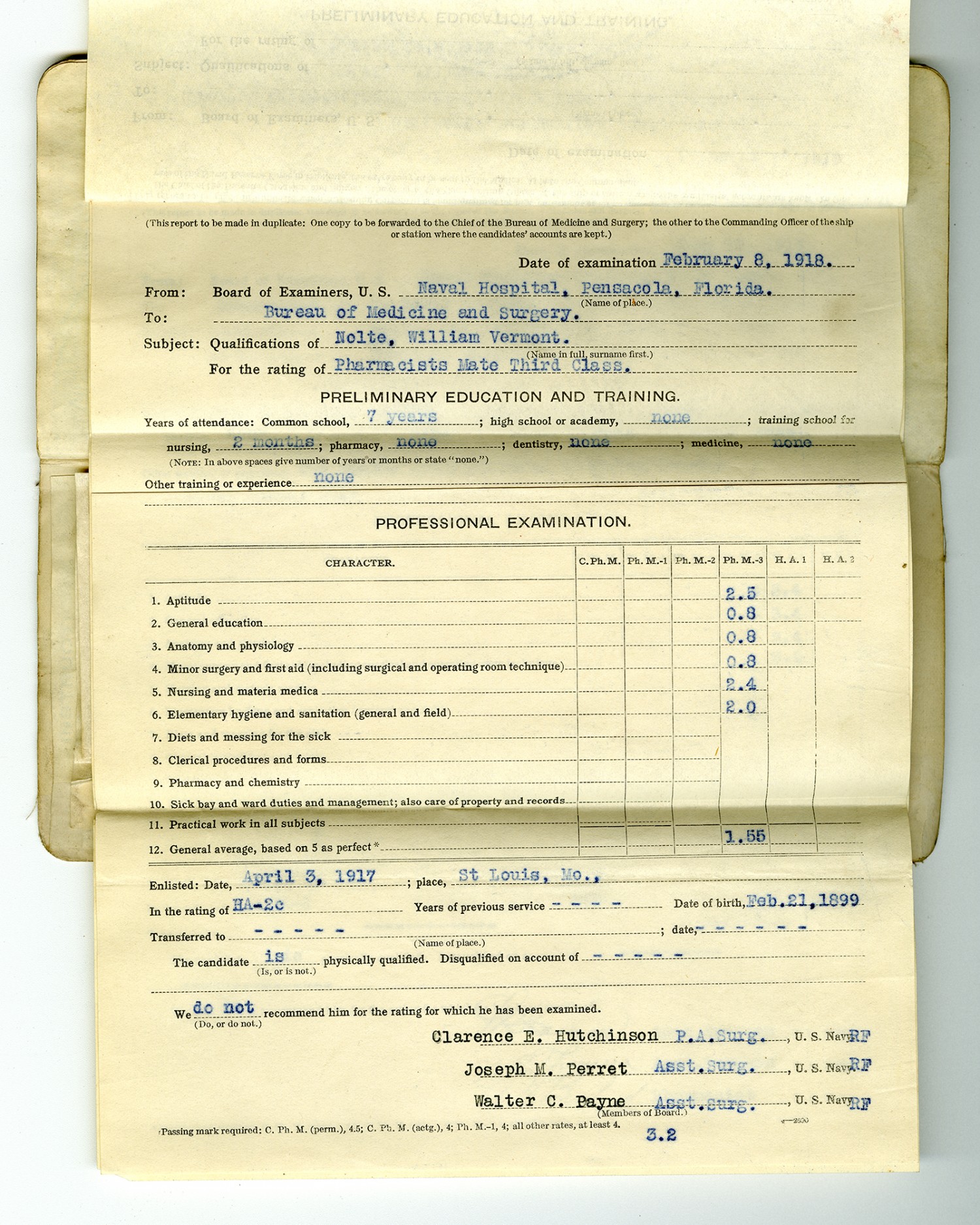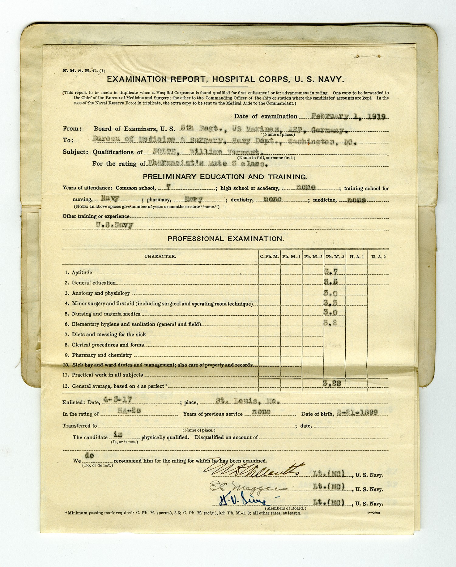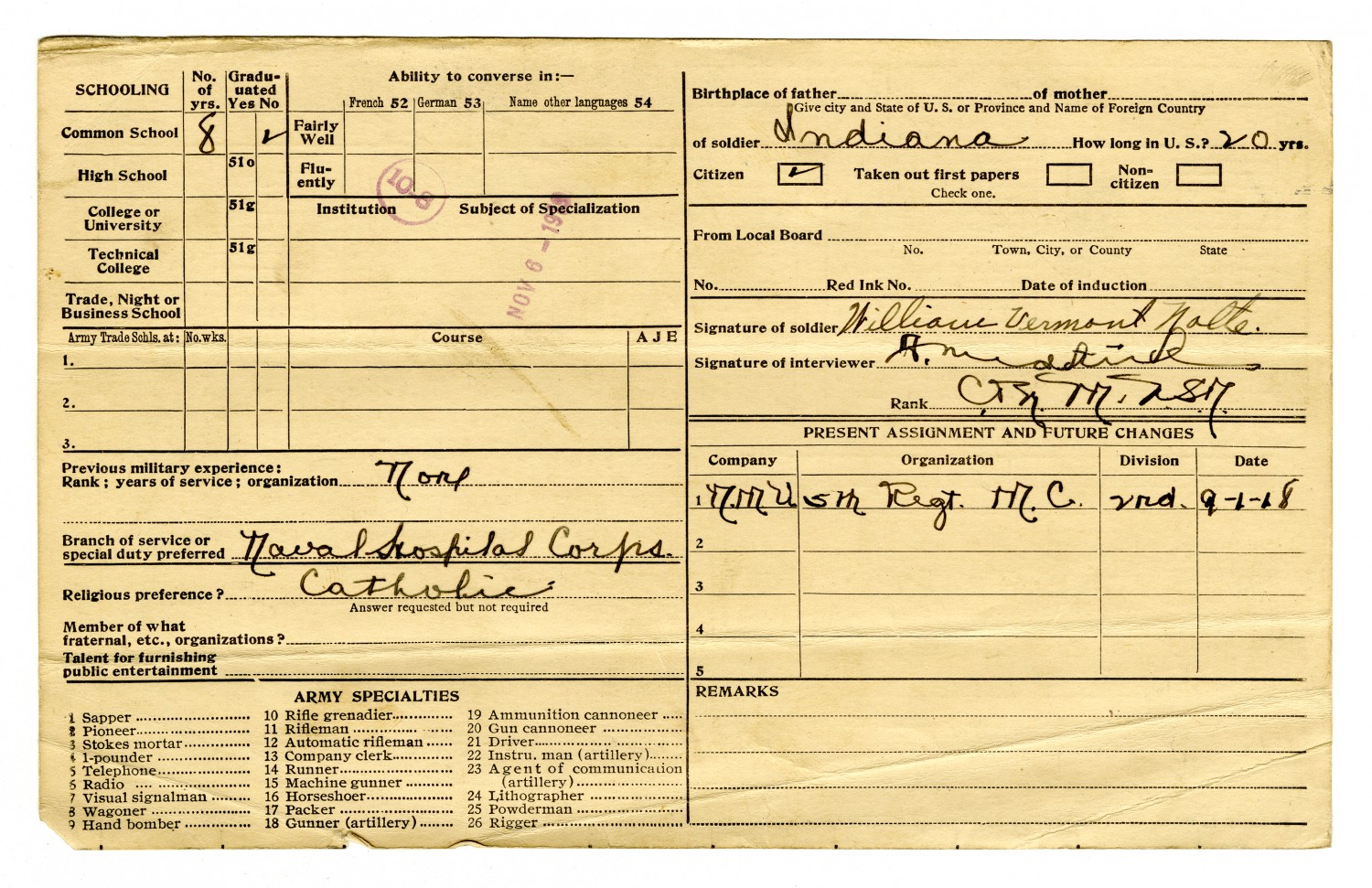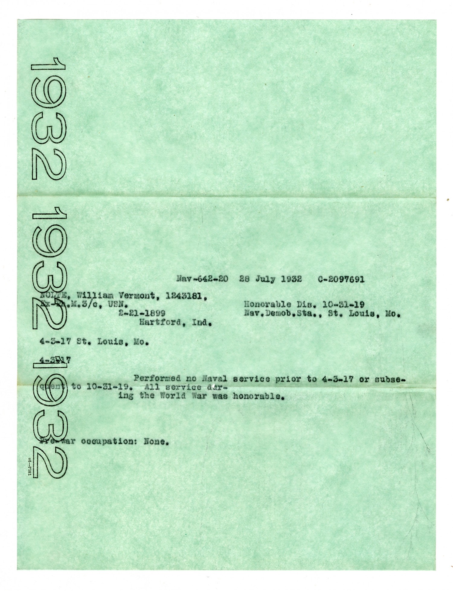 | Description | <p>Personnel record files for William V. Nolte containing service records, receipt for medals of honor, records of payment and transferal requests. William Vermont Nolte, Ph.M 3c U.S.N. served in the 6th regiment, Marine Corps, Expeditionary Forces as a member of the Hospital Corps. He was born on February 21, 1899 in Hartford, Ind. and enlisted to the military on April 3, 1917 until October, 31, 1919. </p> |