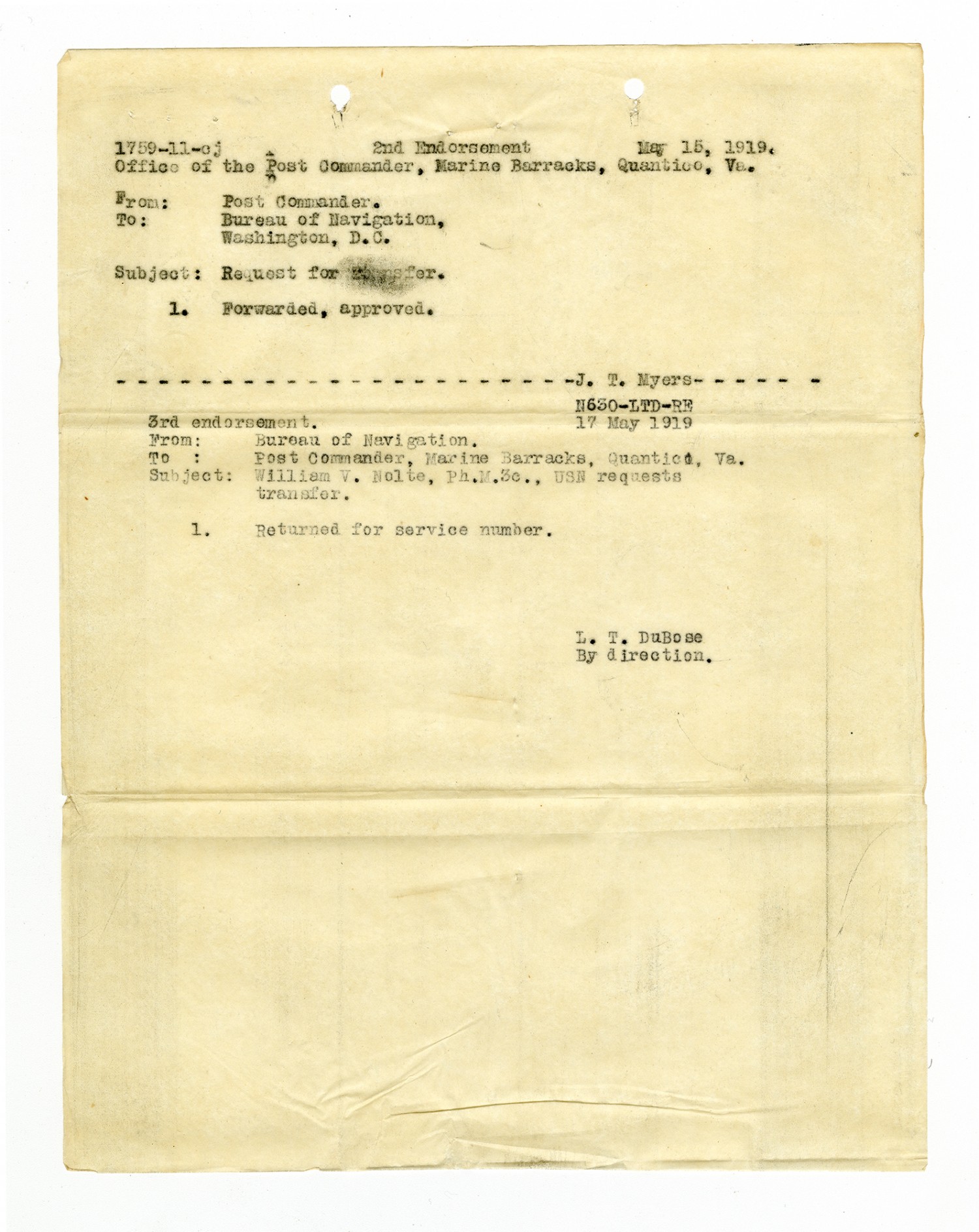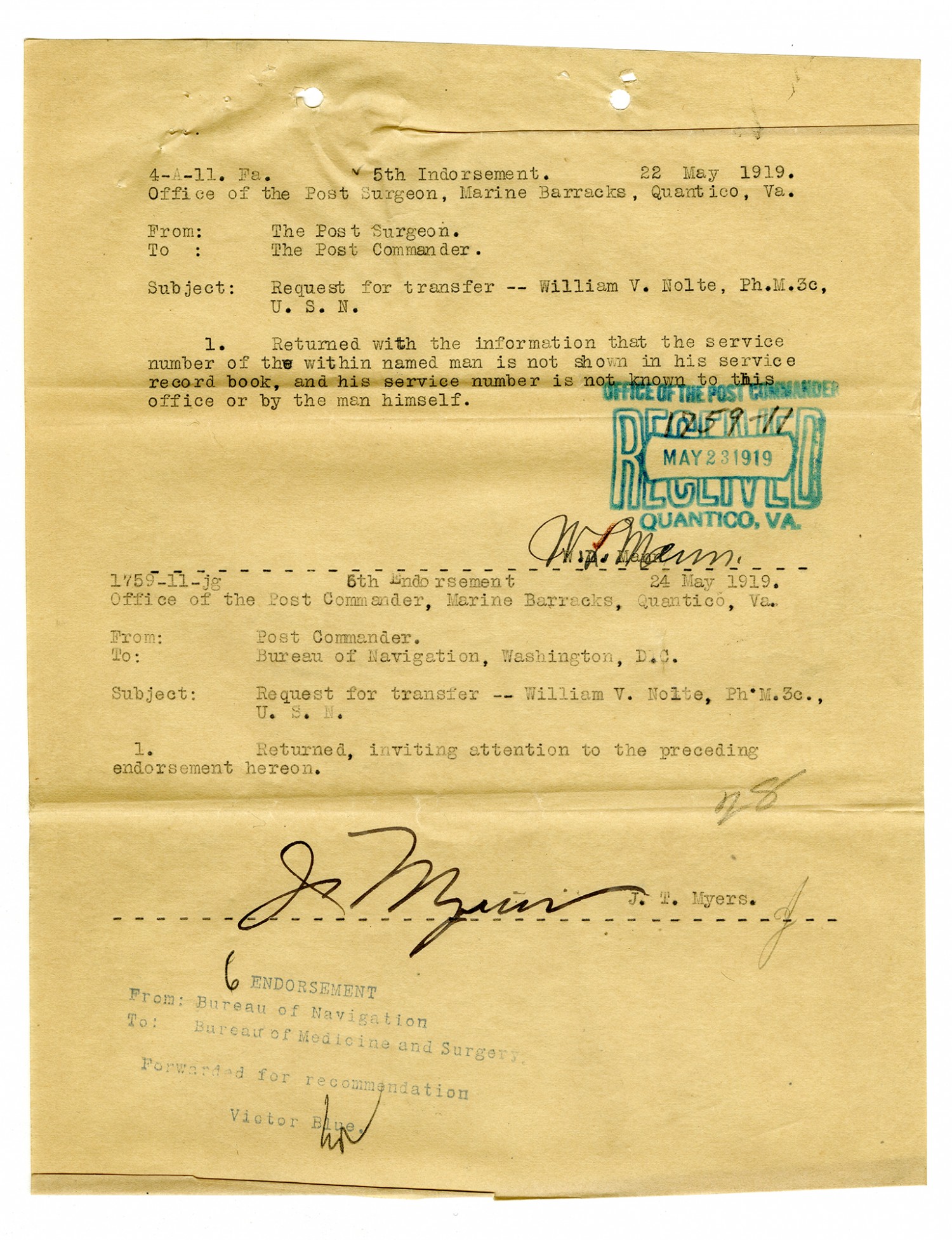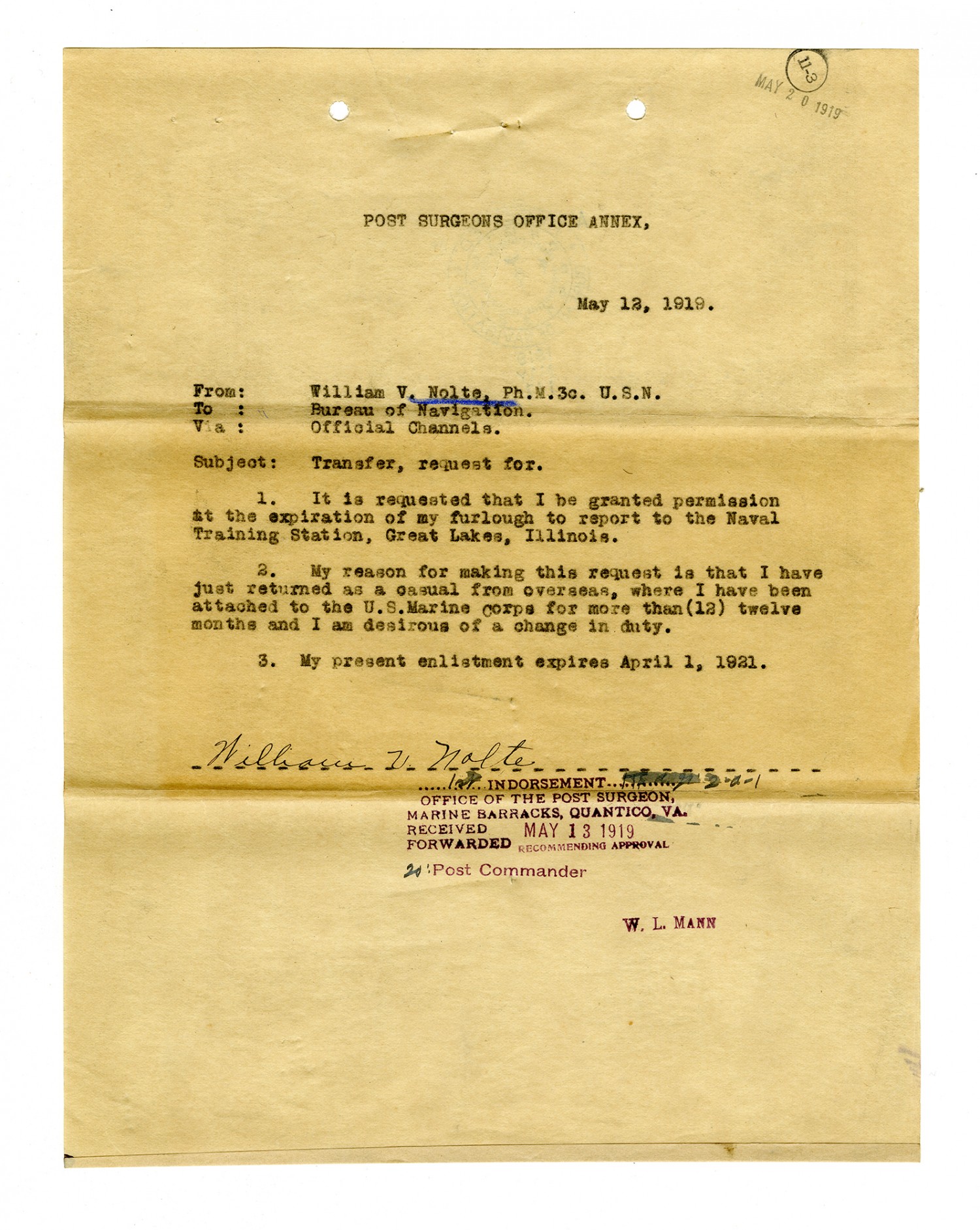 William V. Nolte Request for transfer - May 15, 1919 - May 21, 1919