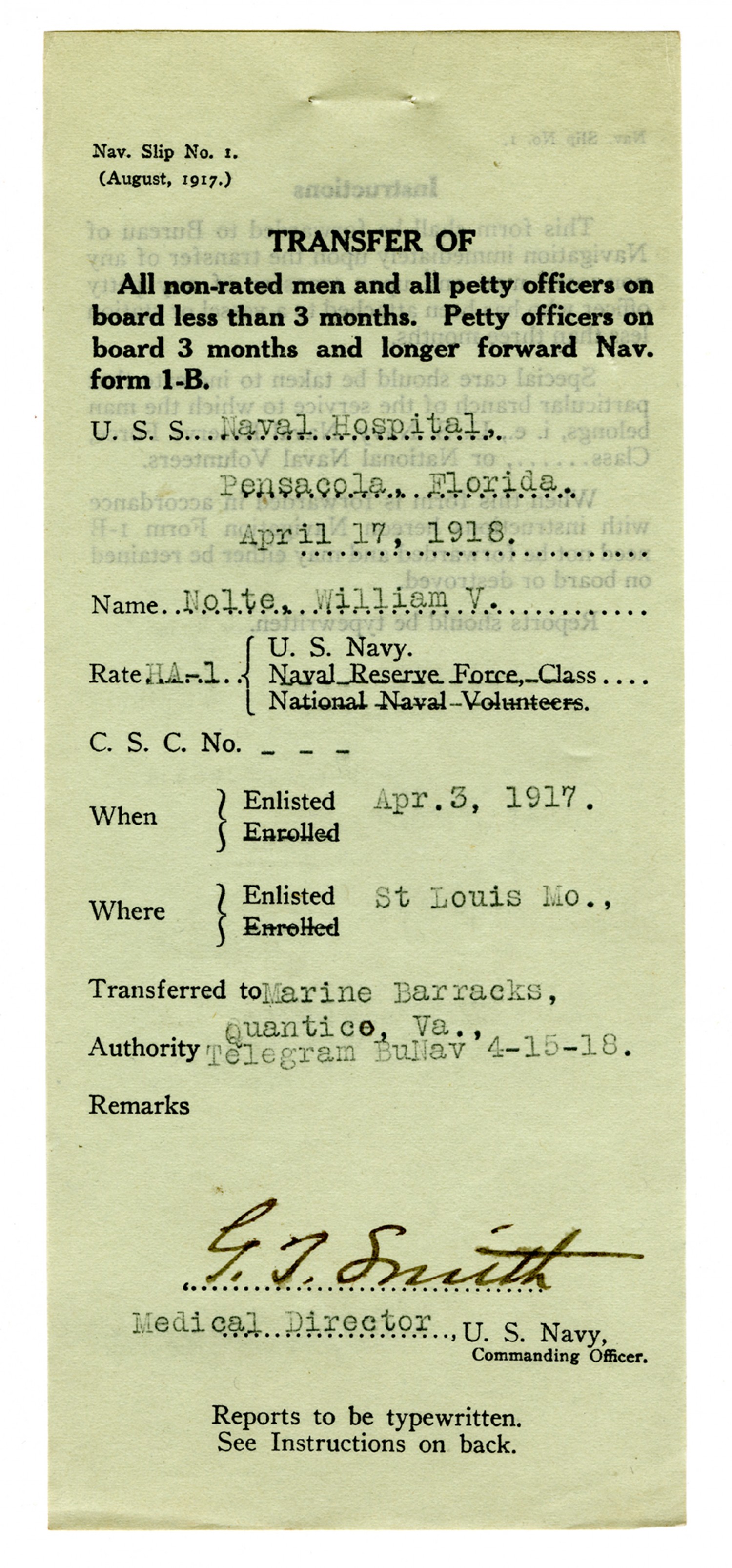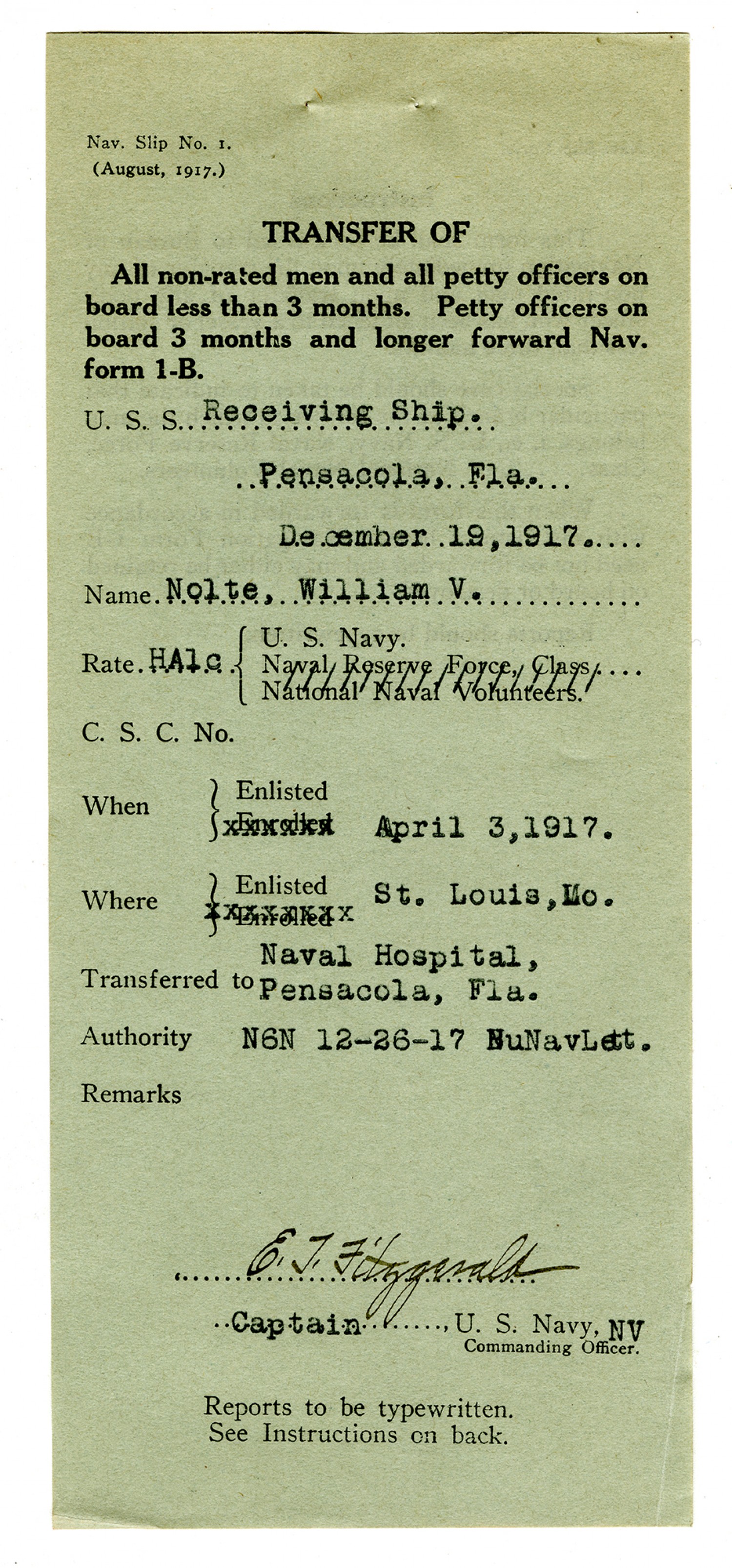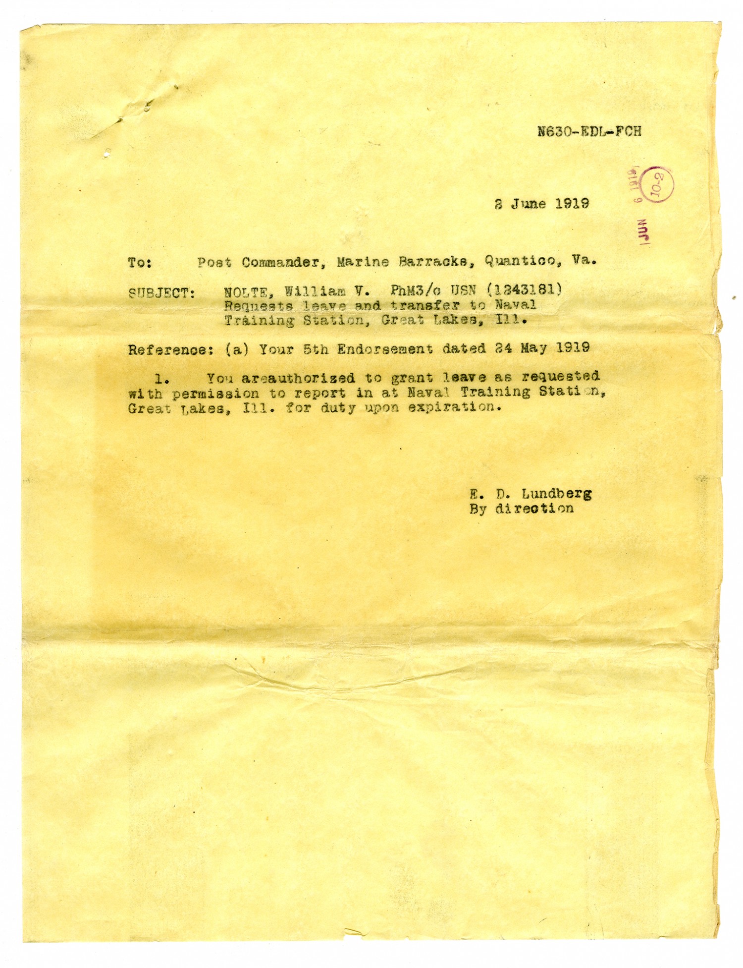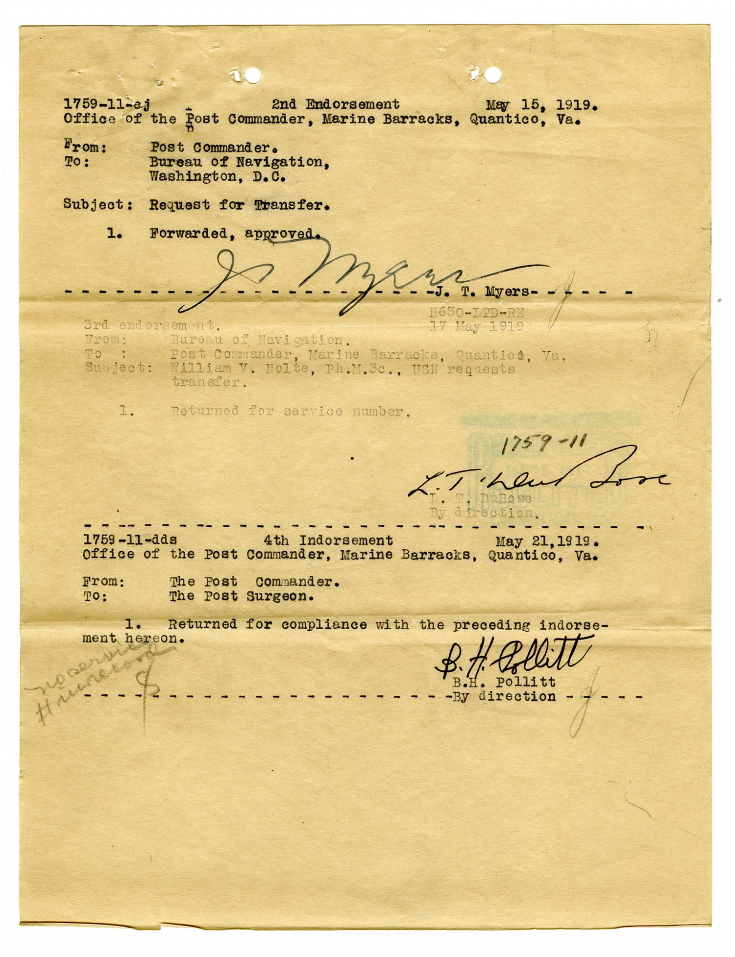 William V. Nolte Request for transfer - May 15, 1919 - May 21, 1919