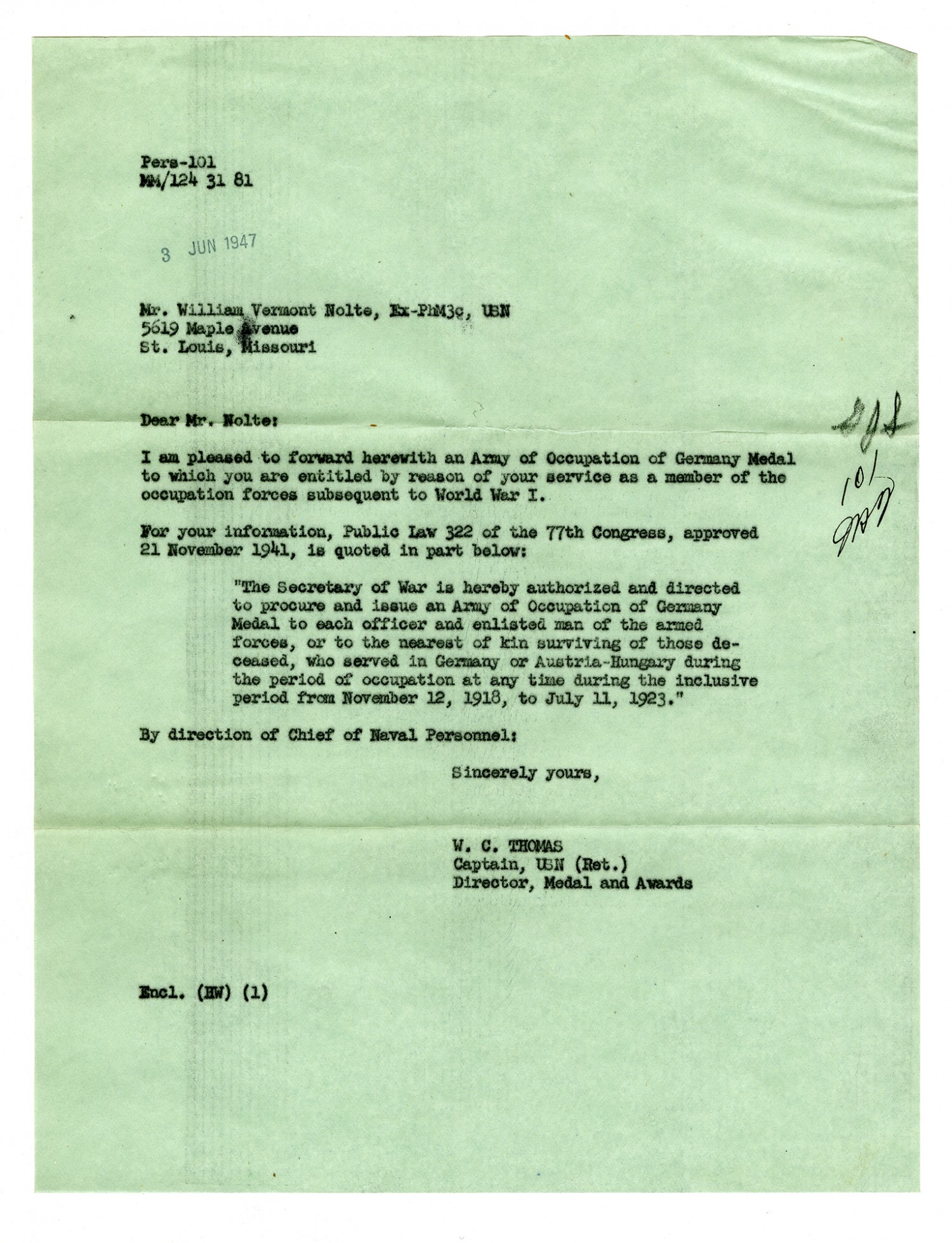 Assistant Secretary to the Navy letter to William V. Nolte - February 11, 1922
