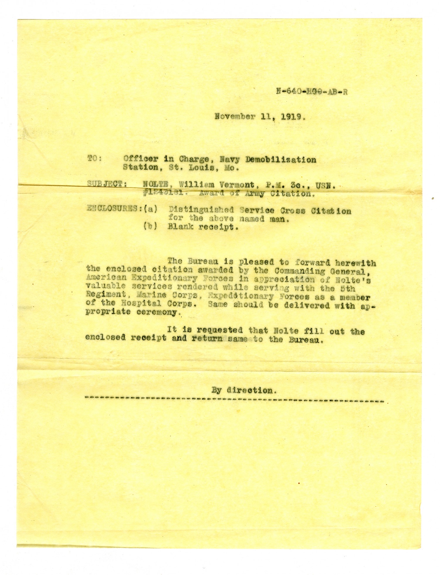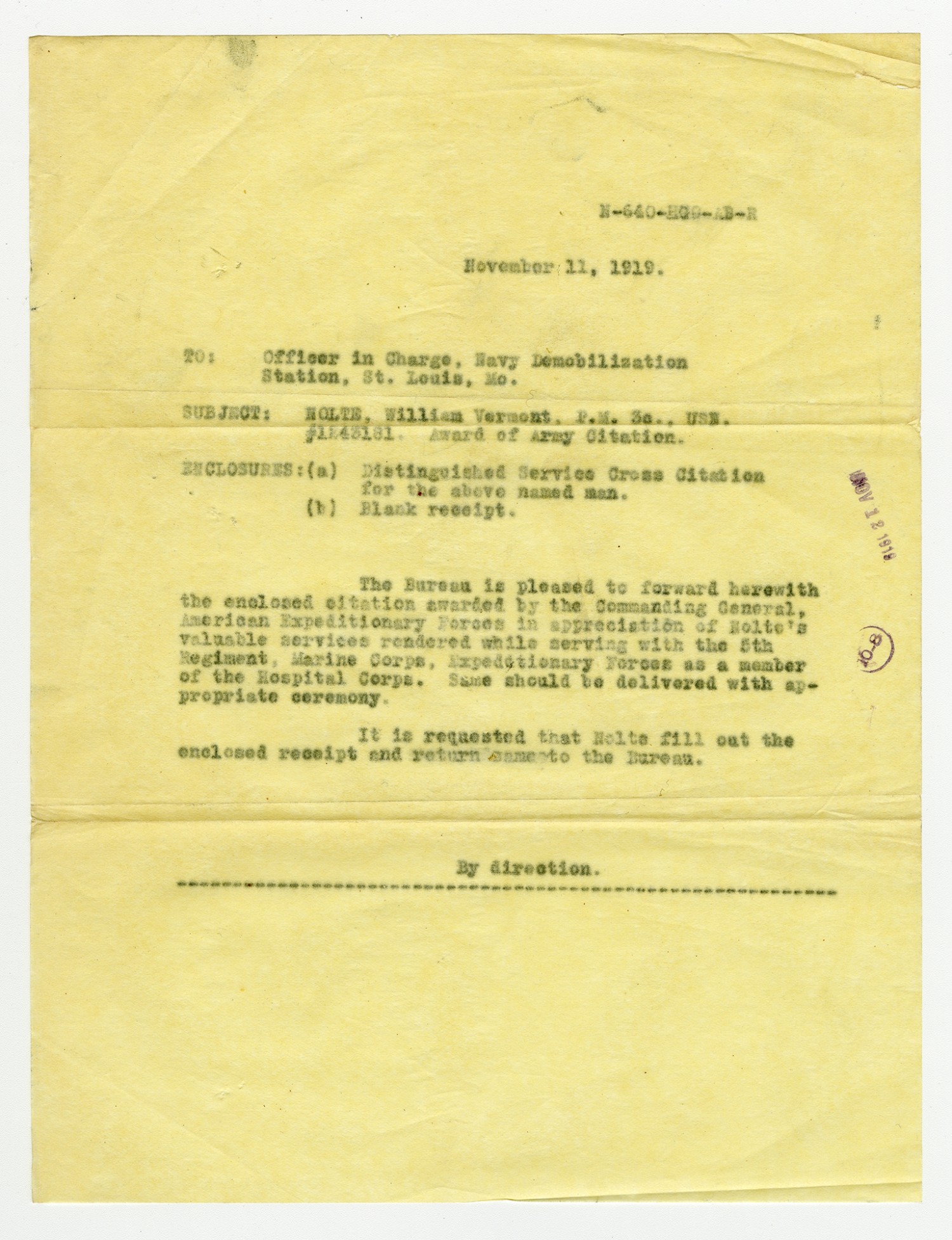 Award letter to Officer in Charge, Navy Demobilization Station - November 11, 1919