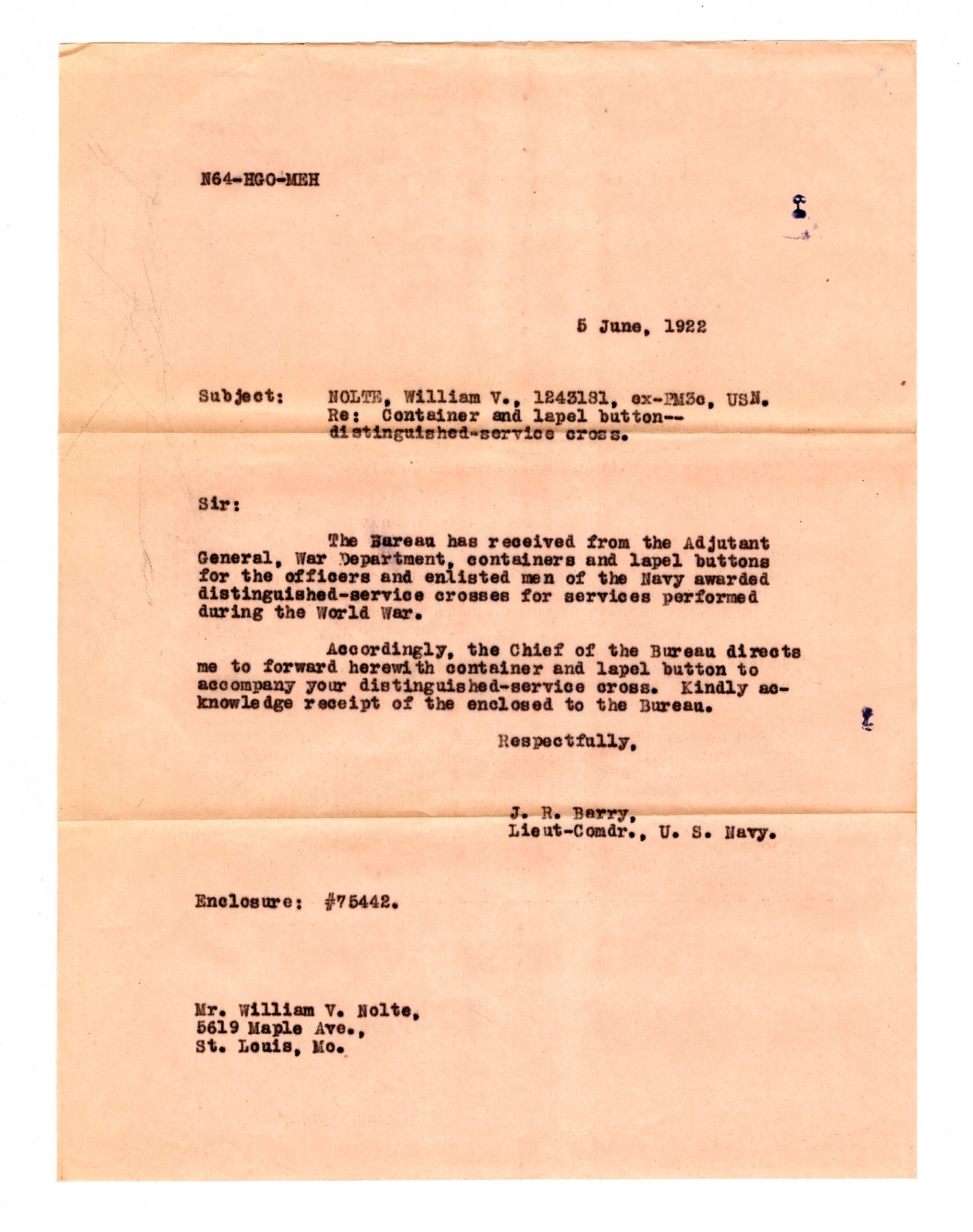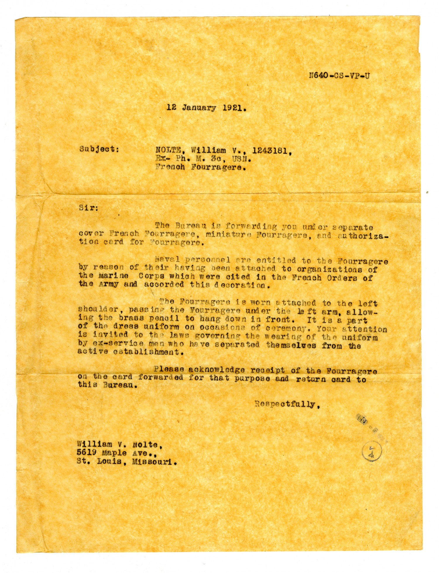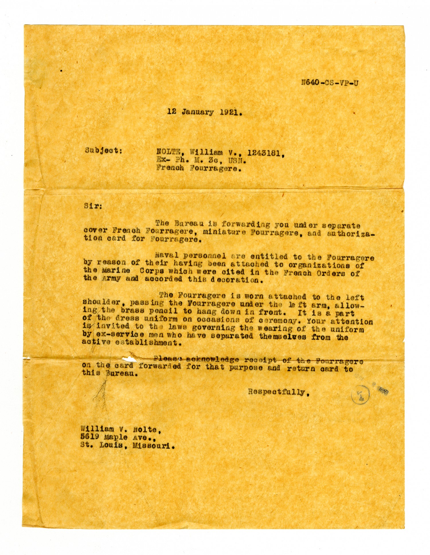 Bureau of Navigation letter to William V. Nolte - January 12, 1921