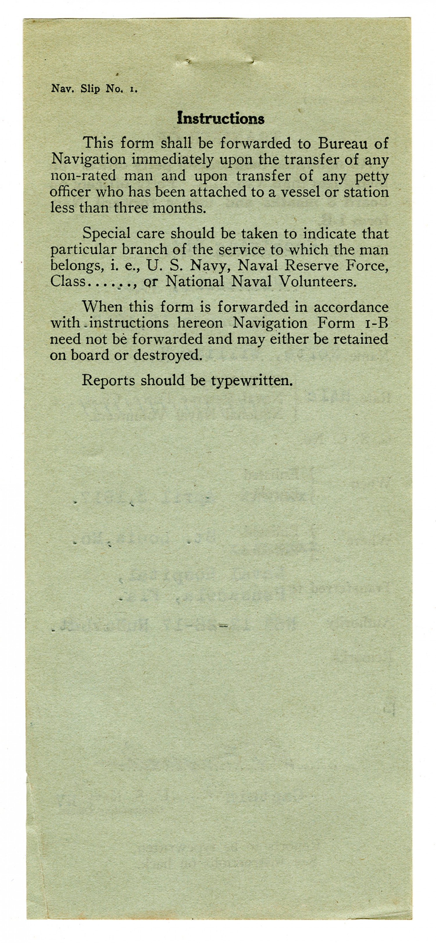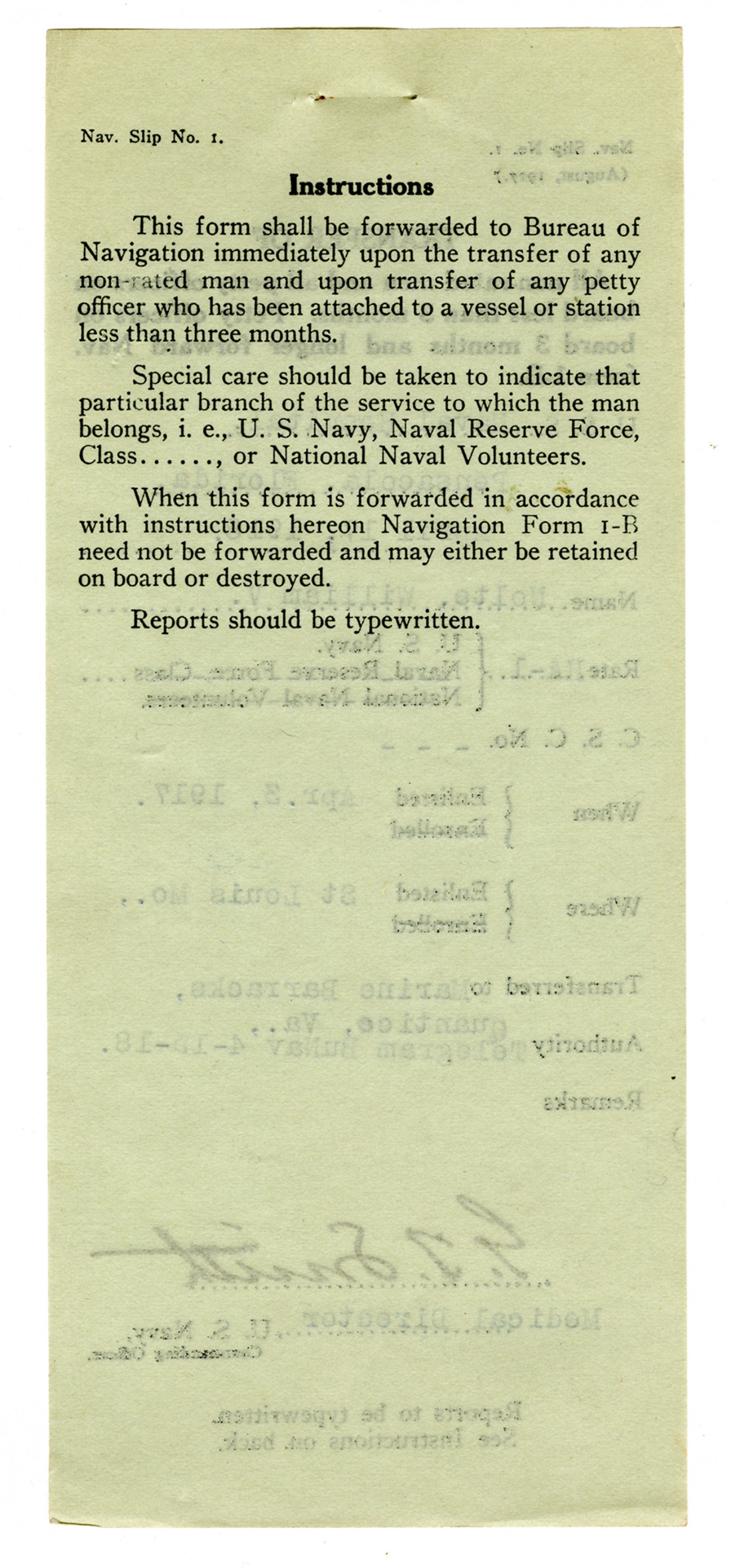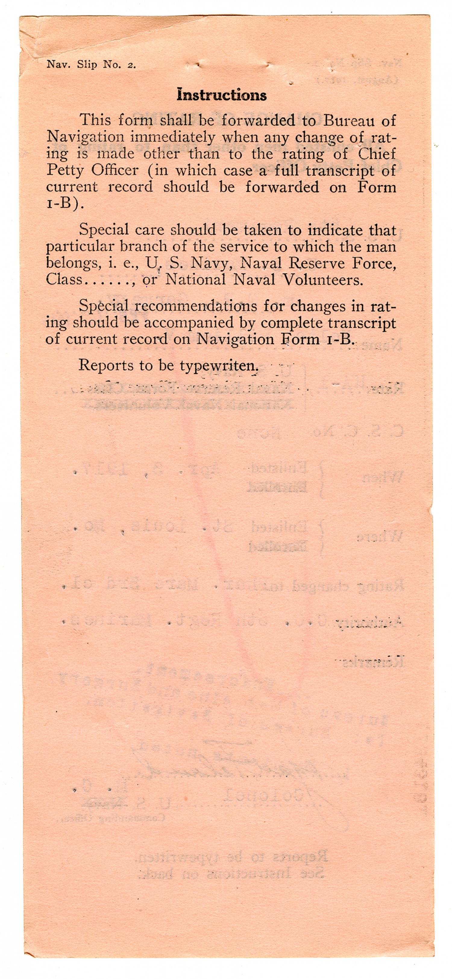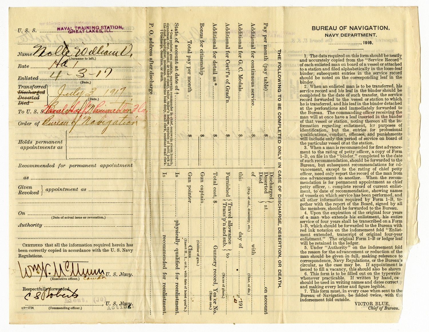 Bureau of Navigation Navy Department Service Record Form - July 3, 1917