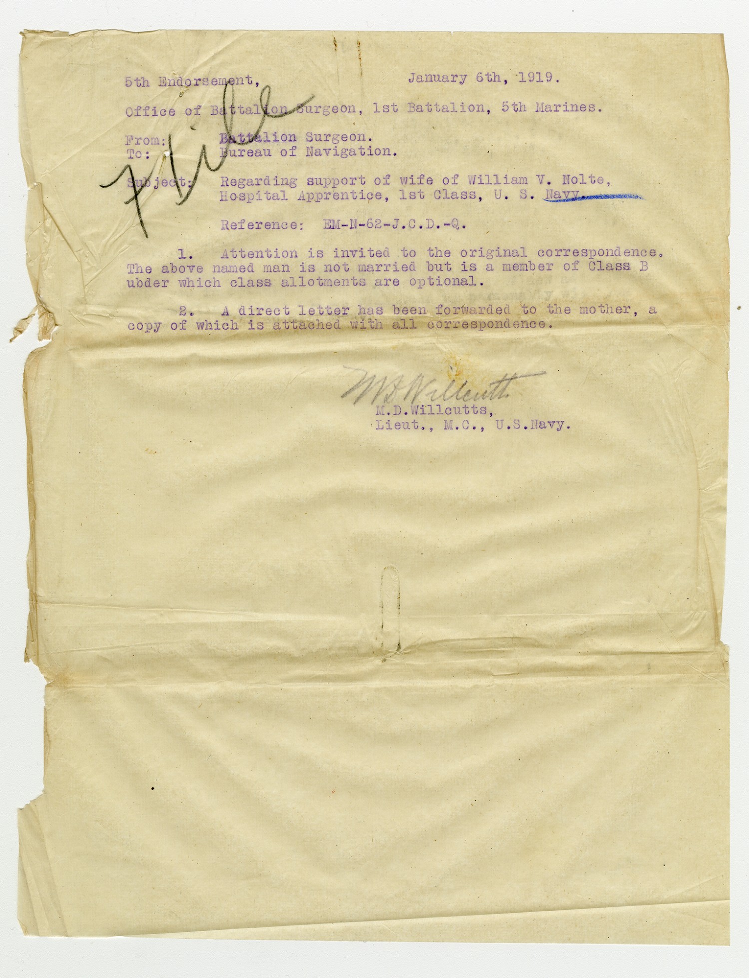 M.D. Willcutts letter to Bureau of Navigation - January 6, 1919