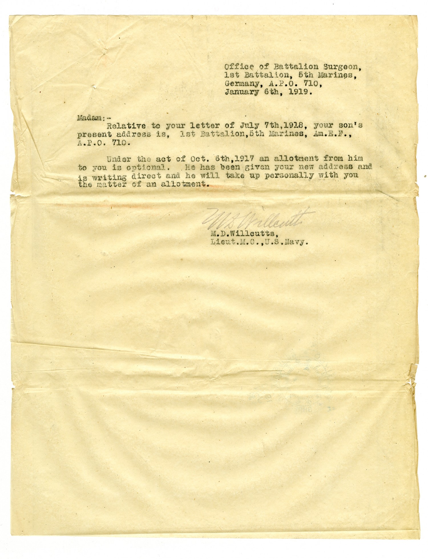 M.D. Willcutts letter to Lillie B. Houser - January 6, 1919