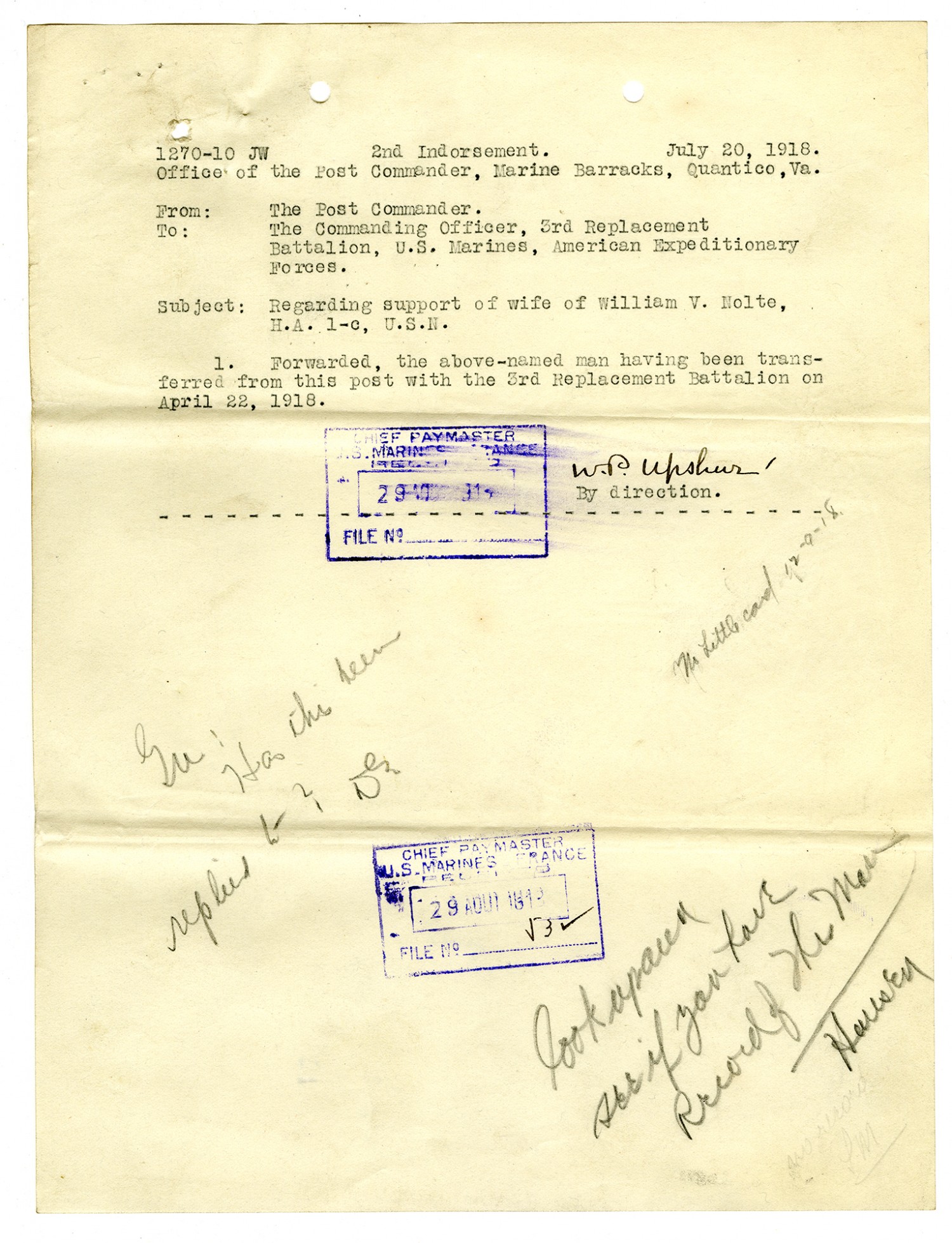 W.P. Upshur letter to the Commanding Officer, 3rd Replacement Battalion - July 20, 1918