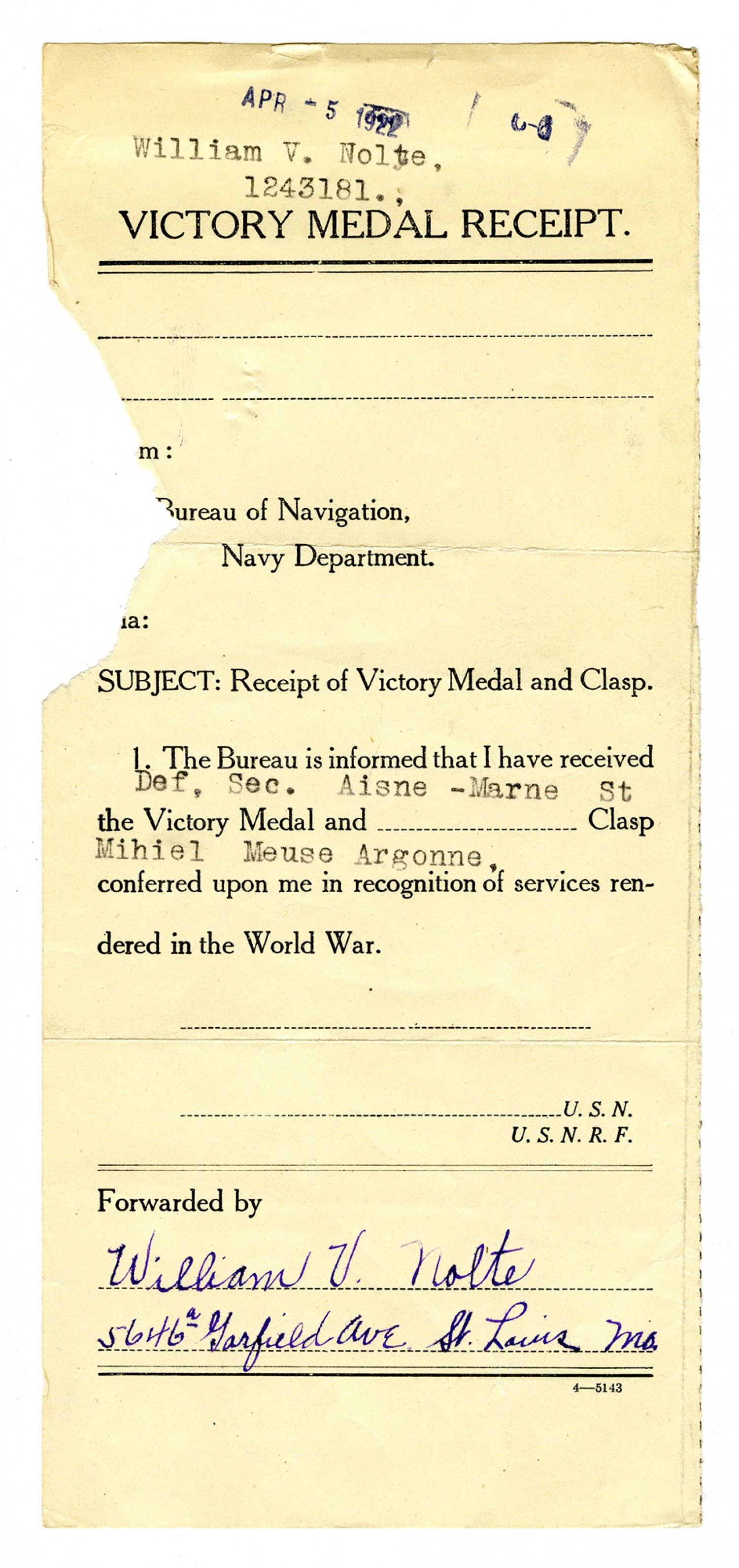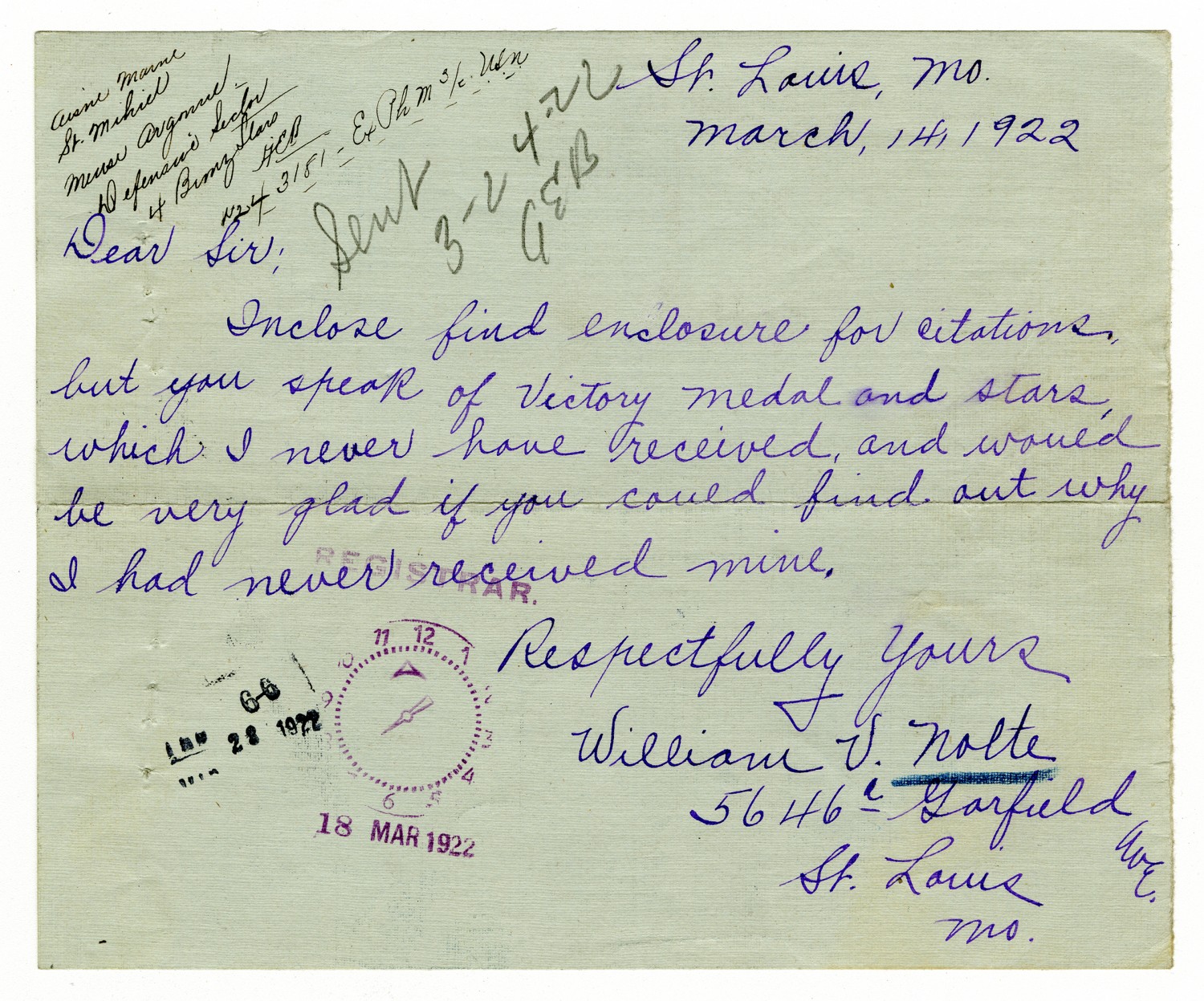 William V. Nolte letter of Victory Medal Inquiry - March 14, 1922